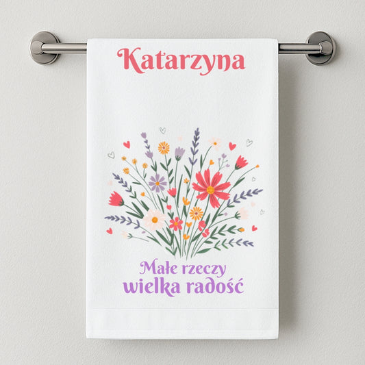 Spersonalizowany Ręcznik z Twoim Imieniem – Małe Rzeczy, Wielka Radość z Bukietem Kwiatów