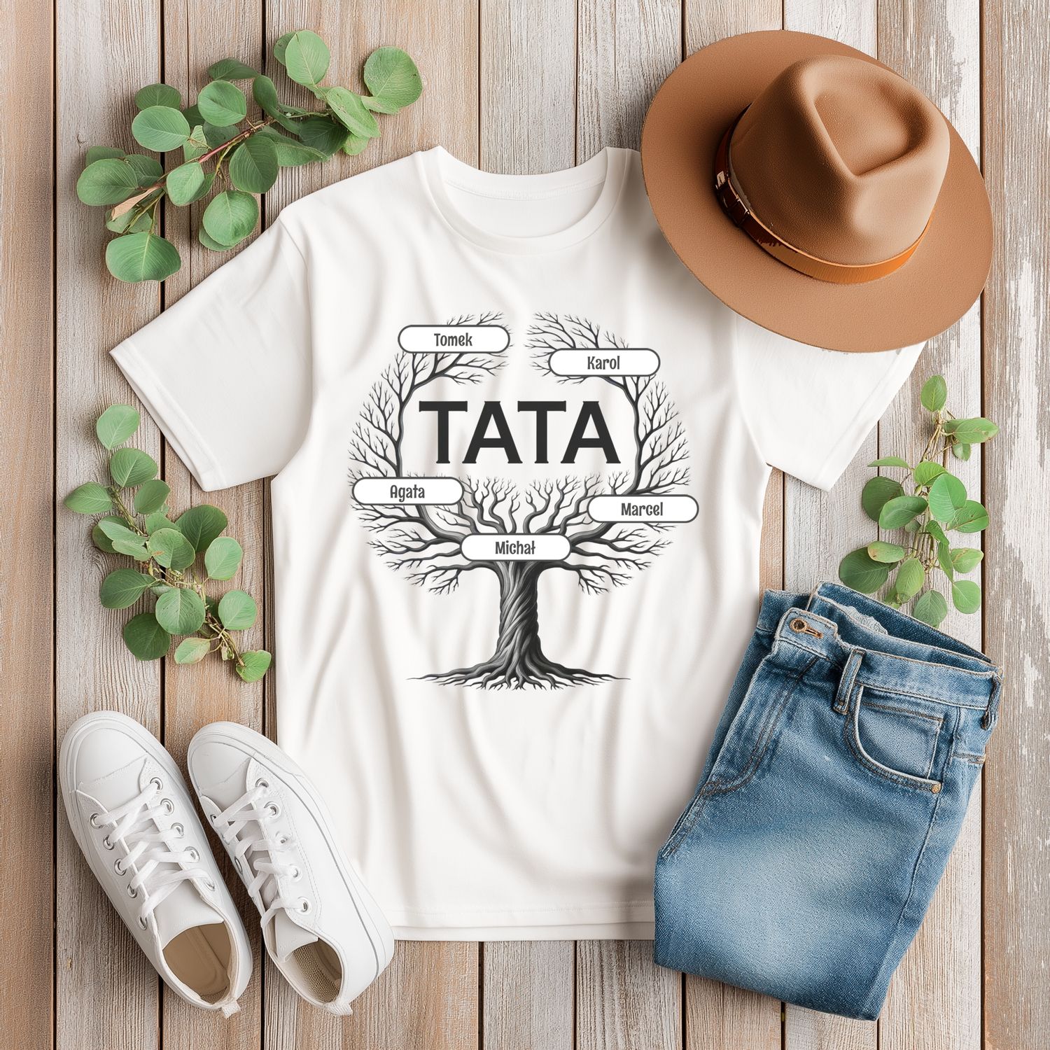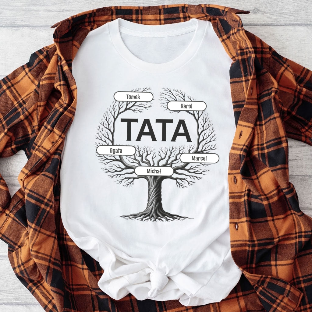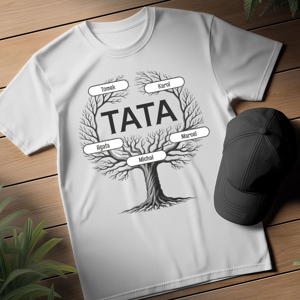 To nie jest zwykłe drzewo — to drzewo, którego korzenie to miłość, a gałęzie to najbliżsi. W jego centrum: TATA — filar rodziny, ostoja, bohater codzienności. Każda gałąź to jedno dziecko, a każde imię to osobna historia. Ten wzruszający nadruk pokazuje, że tata ma w swoim sercu całą rodzinę 🌳💚