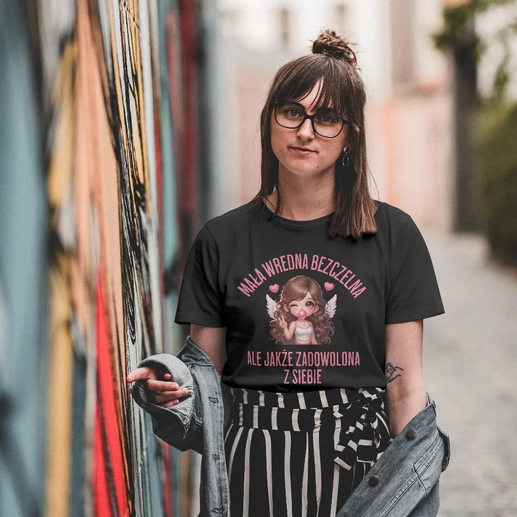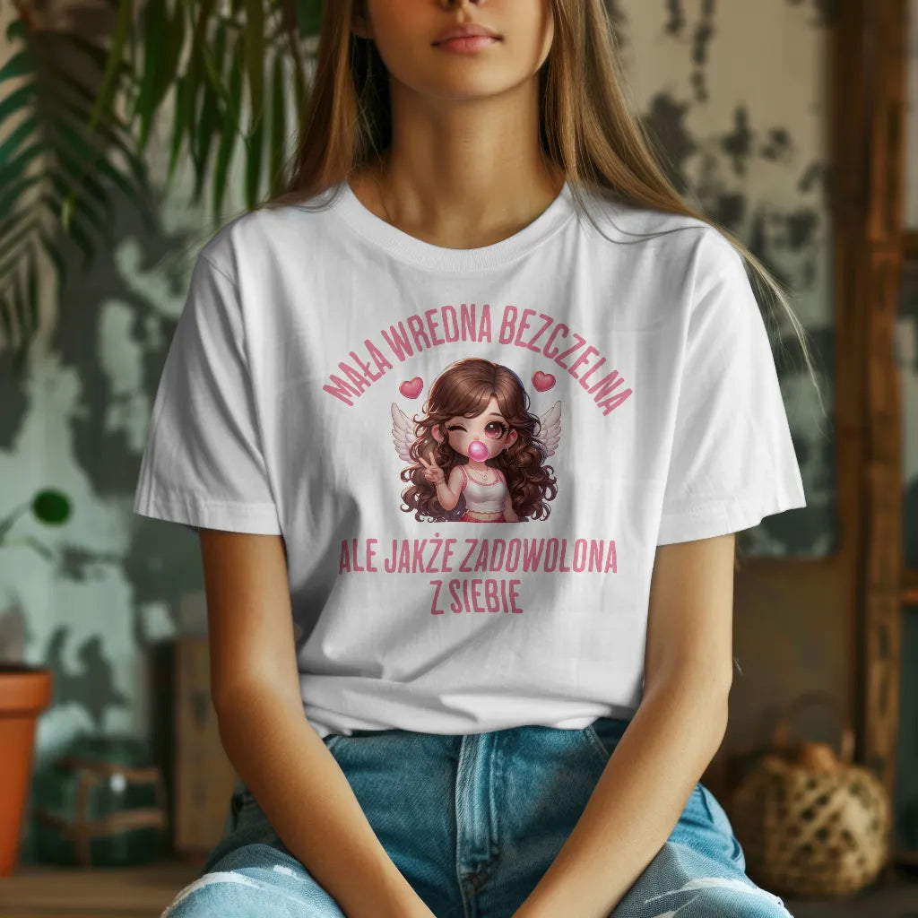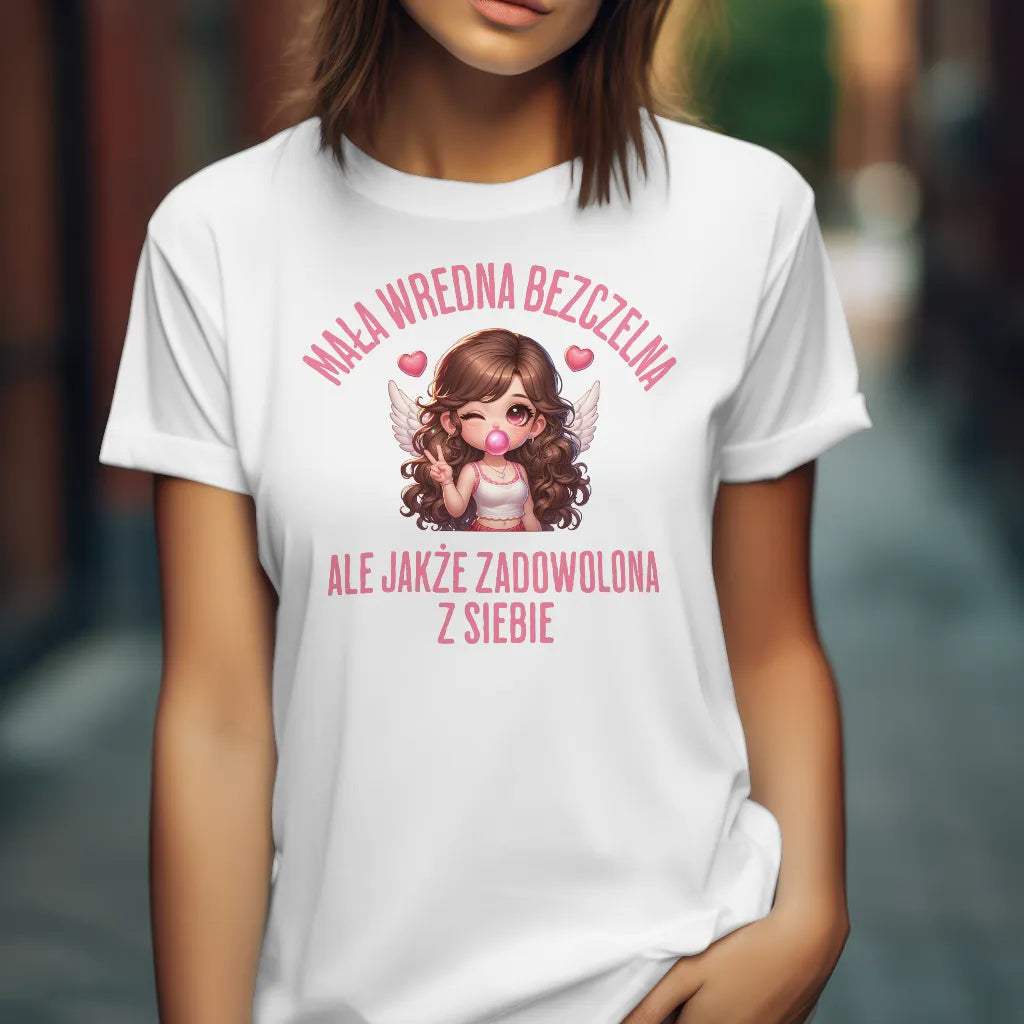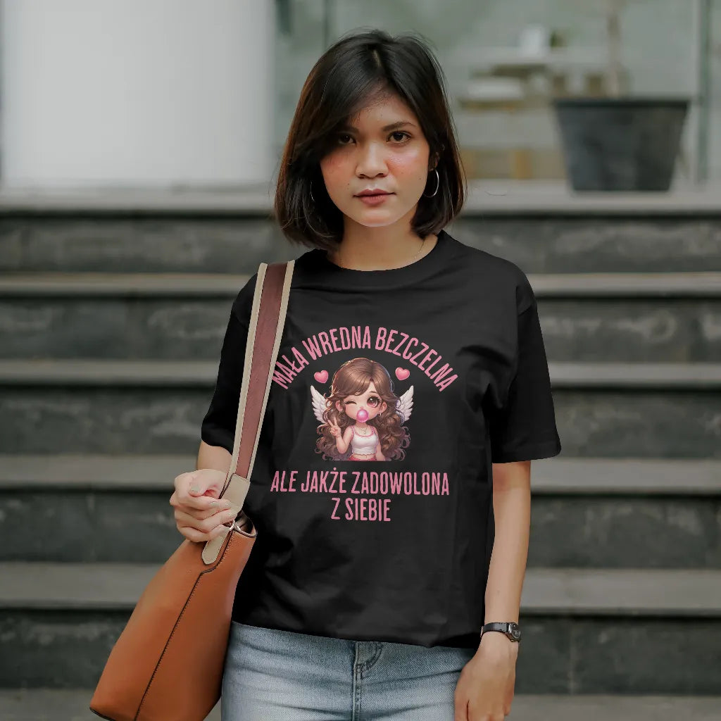 Dla kobiet, które łączą w sobie odrobinę zadziorności i uroku! Koszulka z napisem "Mała Wredna Bezczelna, Ale Jakże Zadowolona z Siebie" oraz uroczą ilustracją dziewczyny z anielskimi skrzydłami i różową gumą balonową to świetny wybór dla pewnych siebie kobiet. Miękki i wygodny materiał zapewnia komfort noszenia. Idealna na prezent dla przyjaciółki, siostry czy dziewczyny, która wie, jak być aniołem z charakterem. Zamów już teraz i pokaż swój styl!