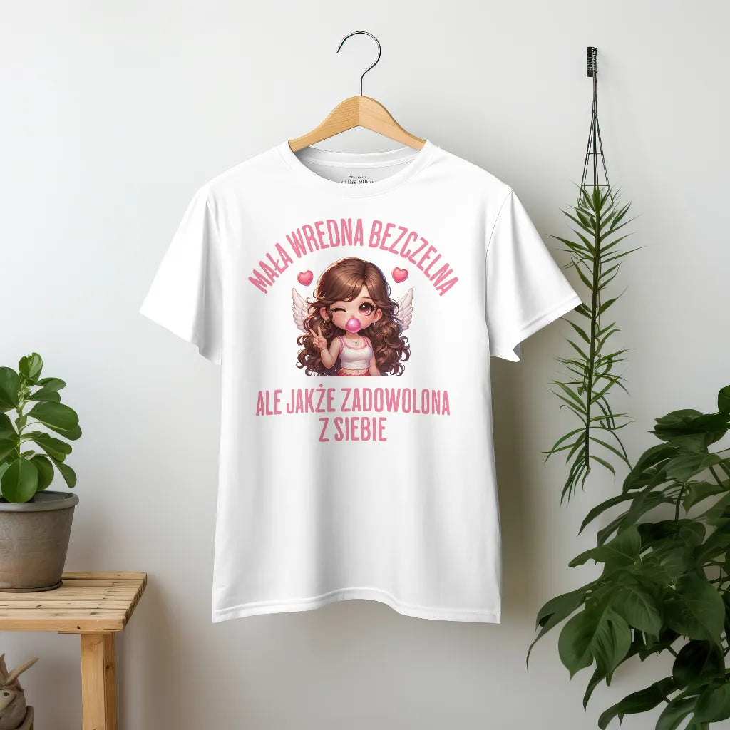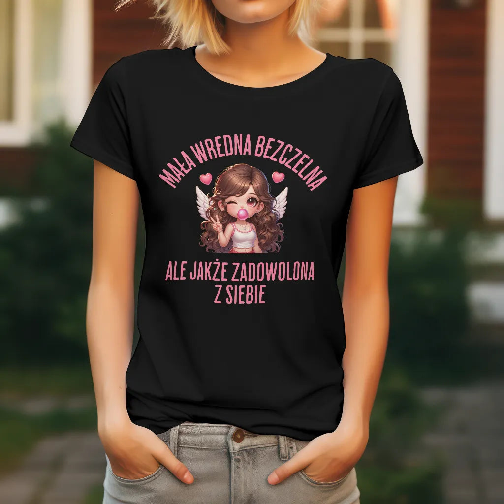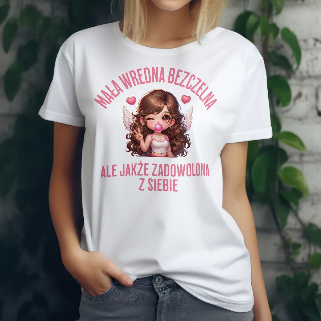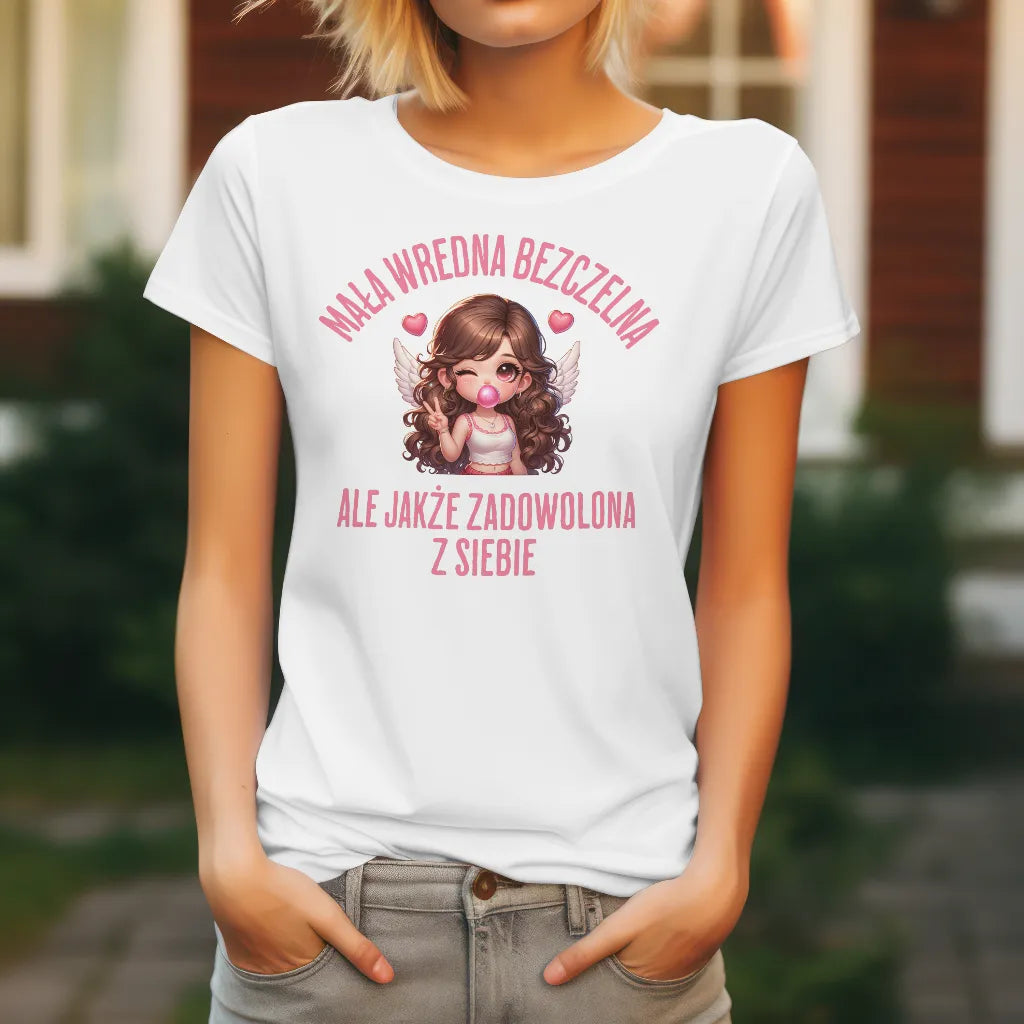 Dla kobiet, które łączą w sobie odrobinę zadziorności i uroku! Koszulka z napisem "Mała Wredna Bezczelna, Ale Jakże Zadowolona z Siebie" oraz uroczą ilustracją dziewczyny z anielskimi skrzydłami i różową gumą balonową to świetny wybór dla pewnych siebie kobiet. Miękki i wygodny materiał zapewnia komfort noszenia. Idealna na prezent dla przyjaciółki, siostry czy dziewczyny, która wie, jak być aniołem z charakterem. Zamów już teraz i pokaż swój styl!