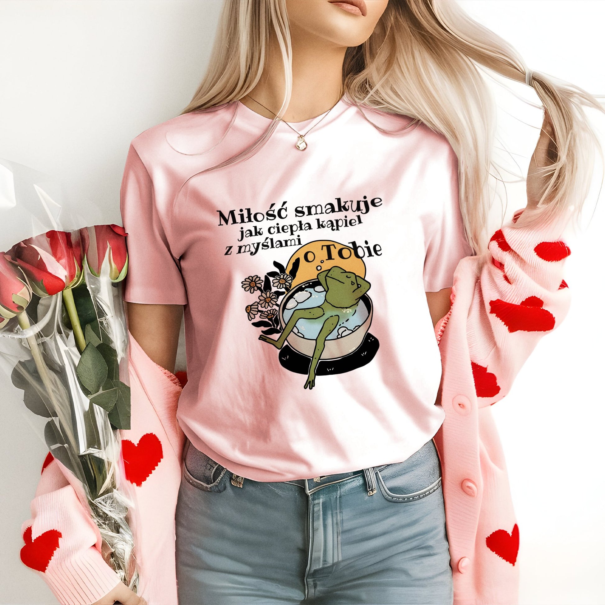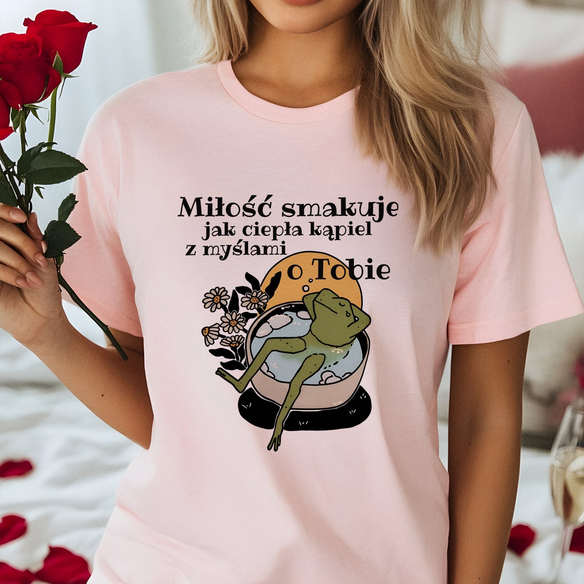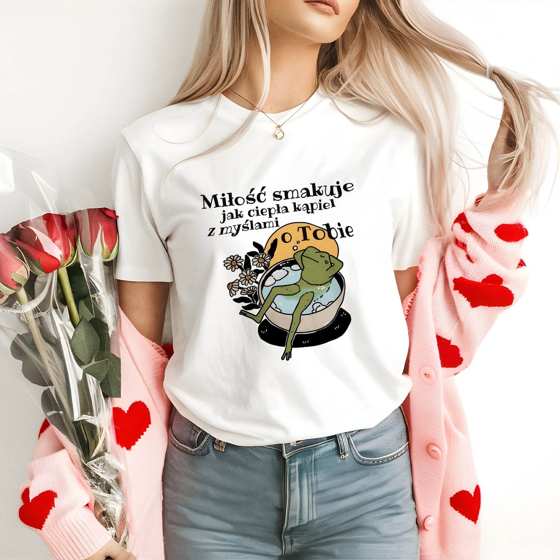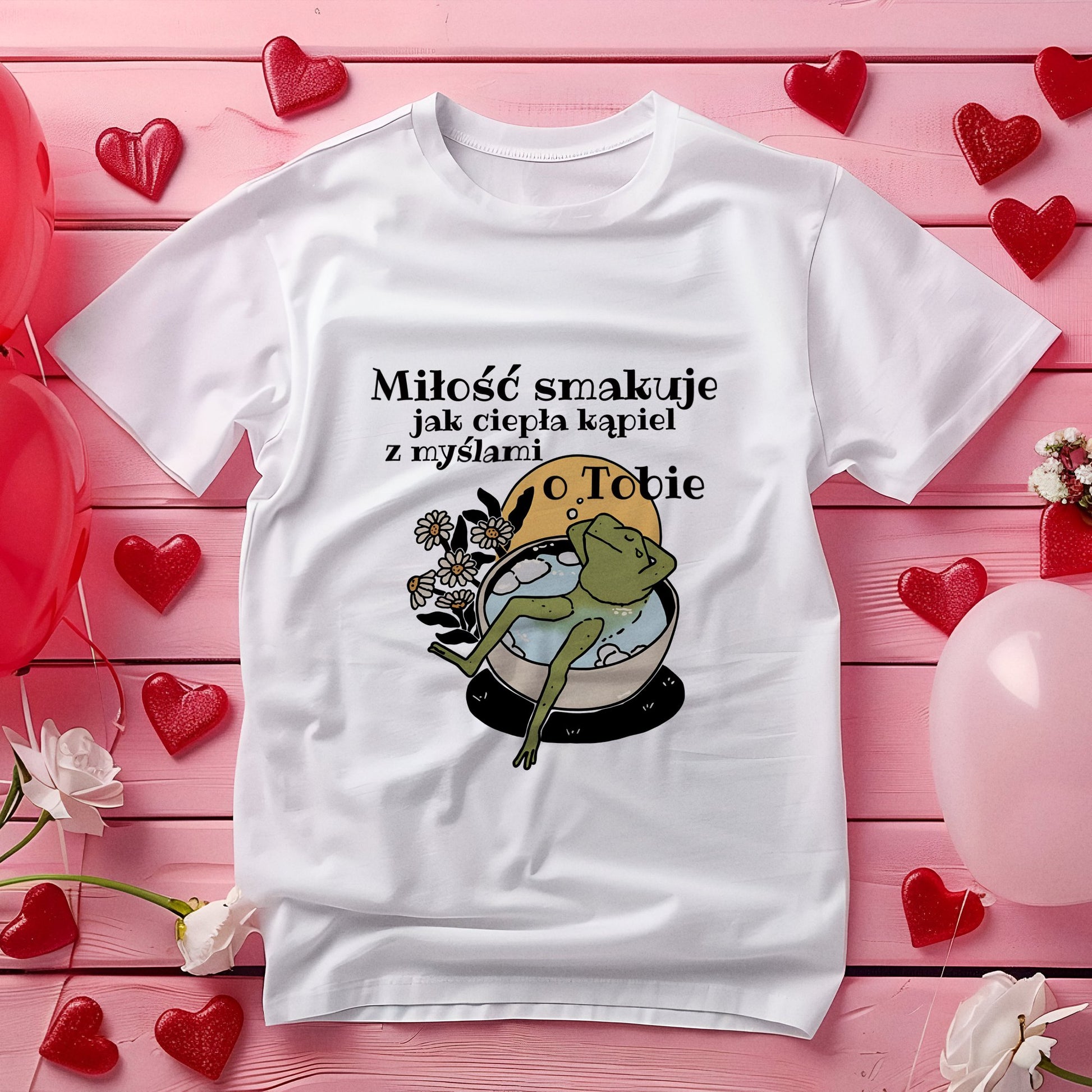 Koszulka „Miłość smakuje jak ciepła kąpiel z myślami o Tobie” to romantyczny i komfortowy prezent na Walentynki. Delikatny napis doskonale oddaje uczucia pełne ciepła i spokoju, które można znaleźć w każdej chwili spędzonej z ukochaną osobą. Wykonana z miękkiego materiału, idealna do codziennego noszenia, ta koszulka przypomni o miłości, która koi jak ciepła kąpiel, pełna myśli o drugiej osobie.