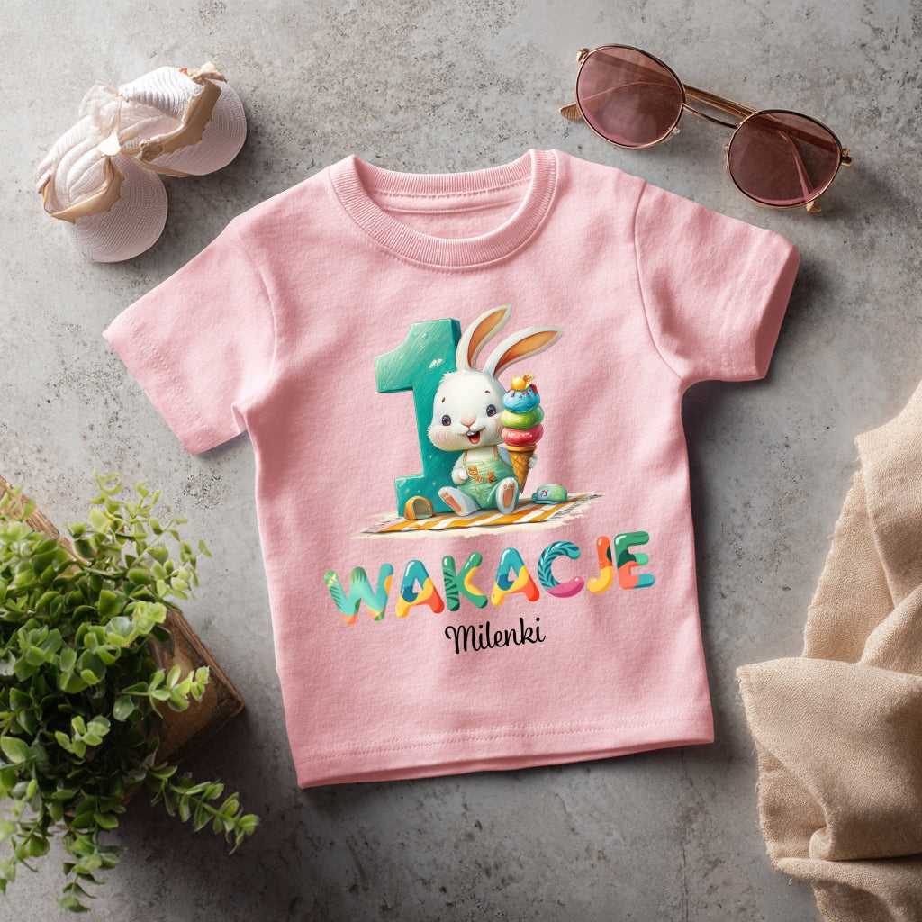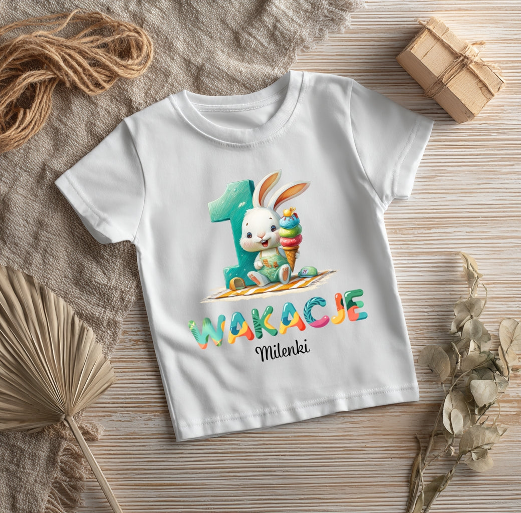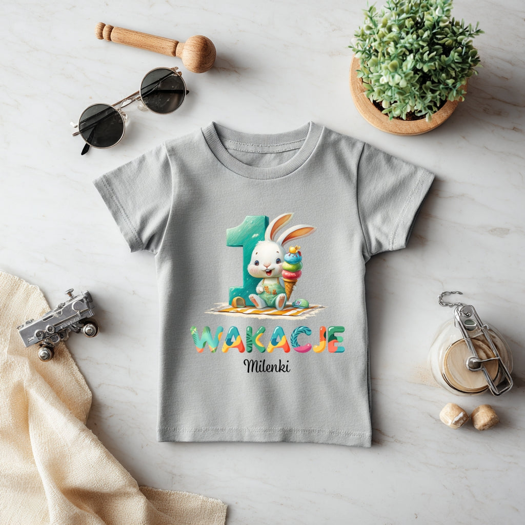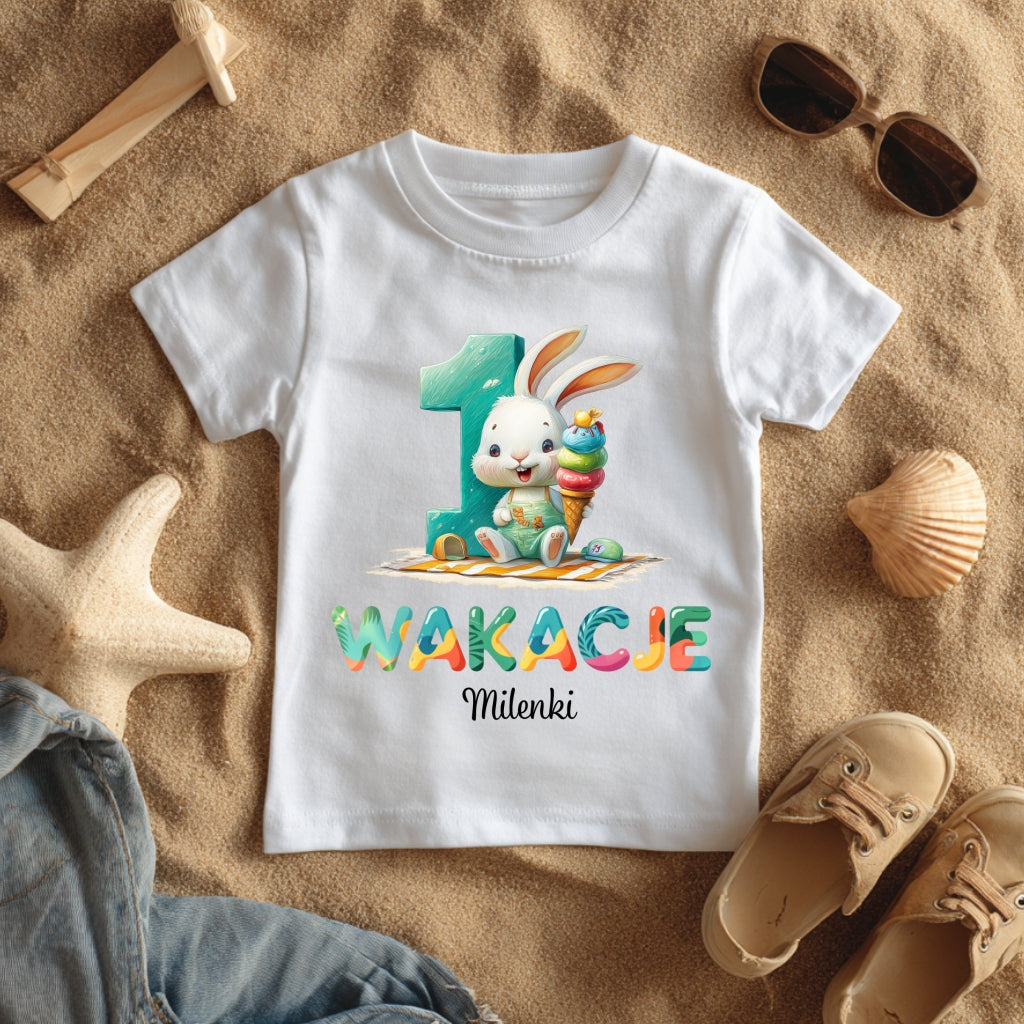 Słodka koszulka dziecięca z grafiką króliczka odpoczywającego na plaży to idealny wybór na pierwsze wakacje Twojej córeczki! Kolorowy nadruk z napisem „Wakacje 1” oraz imieniem (np. Milenki) sprawi, że będzie to nie tylko wygodna część garderoby, ale też cudowna pamiątka z dzieciństwa. Koszulka wykonana jest z miękkiej, przewiewnej bawełny – idealna na ciepłe dni i letnie sesje zdjęciowe.