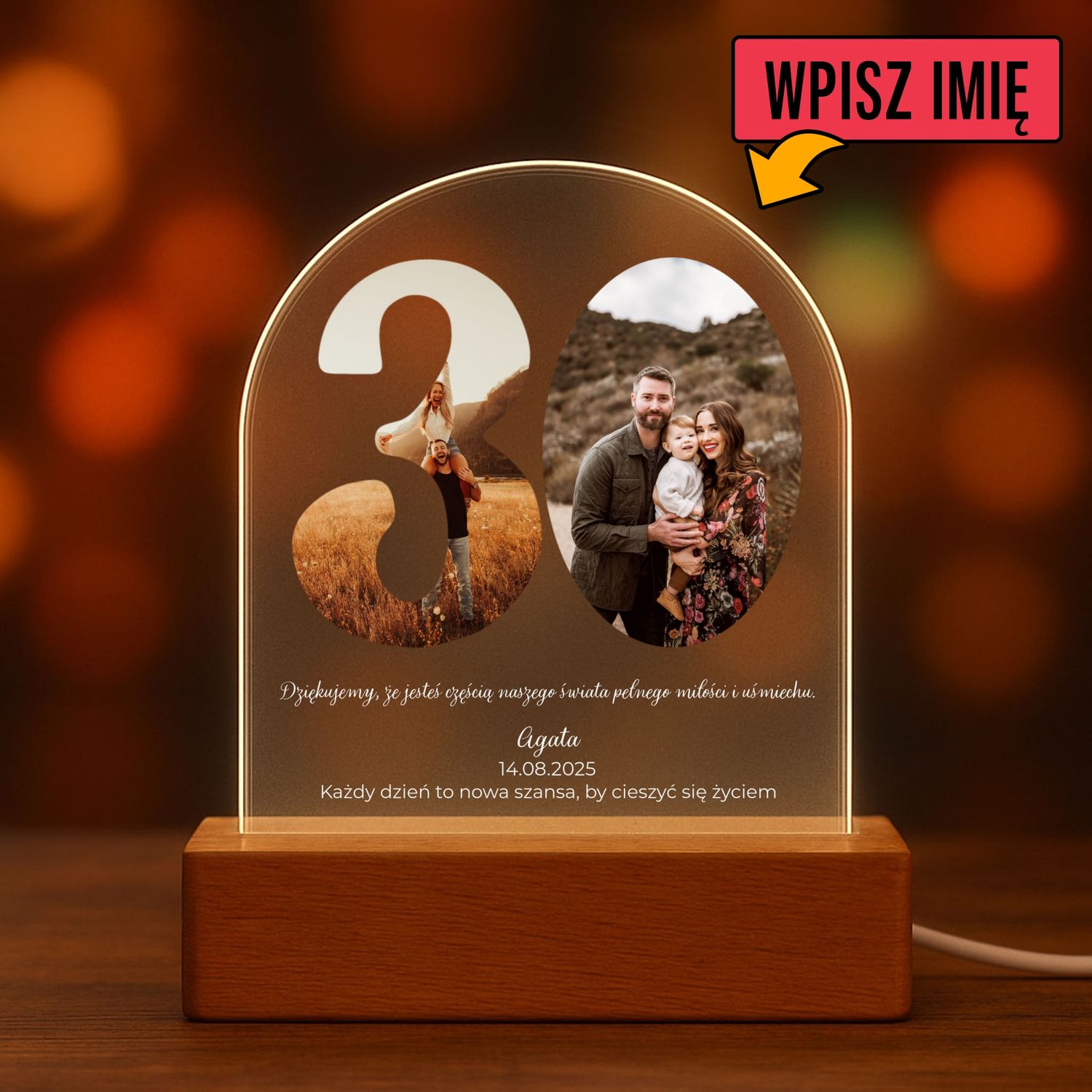 👉 Personalizacja – zdjęcie, imiona i data.