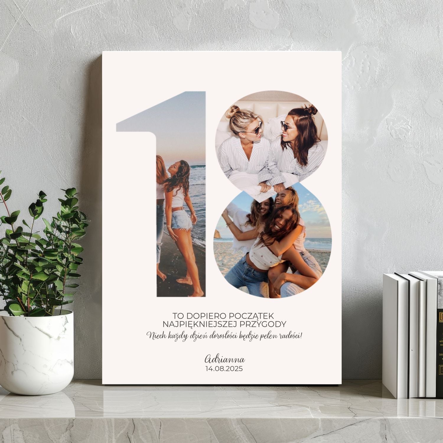 Na obrazie znajduje się duża liczba „18”, wypełniona Twoimi zdjęciami, które opowiadają historię wspólnych chwil i pięknych wspomnień. Możesz dodać imię jubilata, datę oraz własną dedykację, dzięki czemu obraz stanie się absolutnie unikalnym prezentem.
