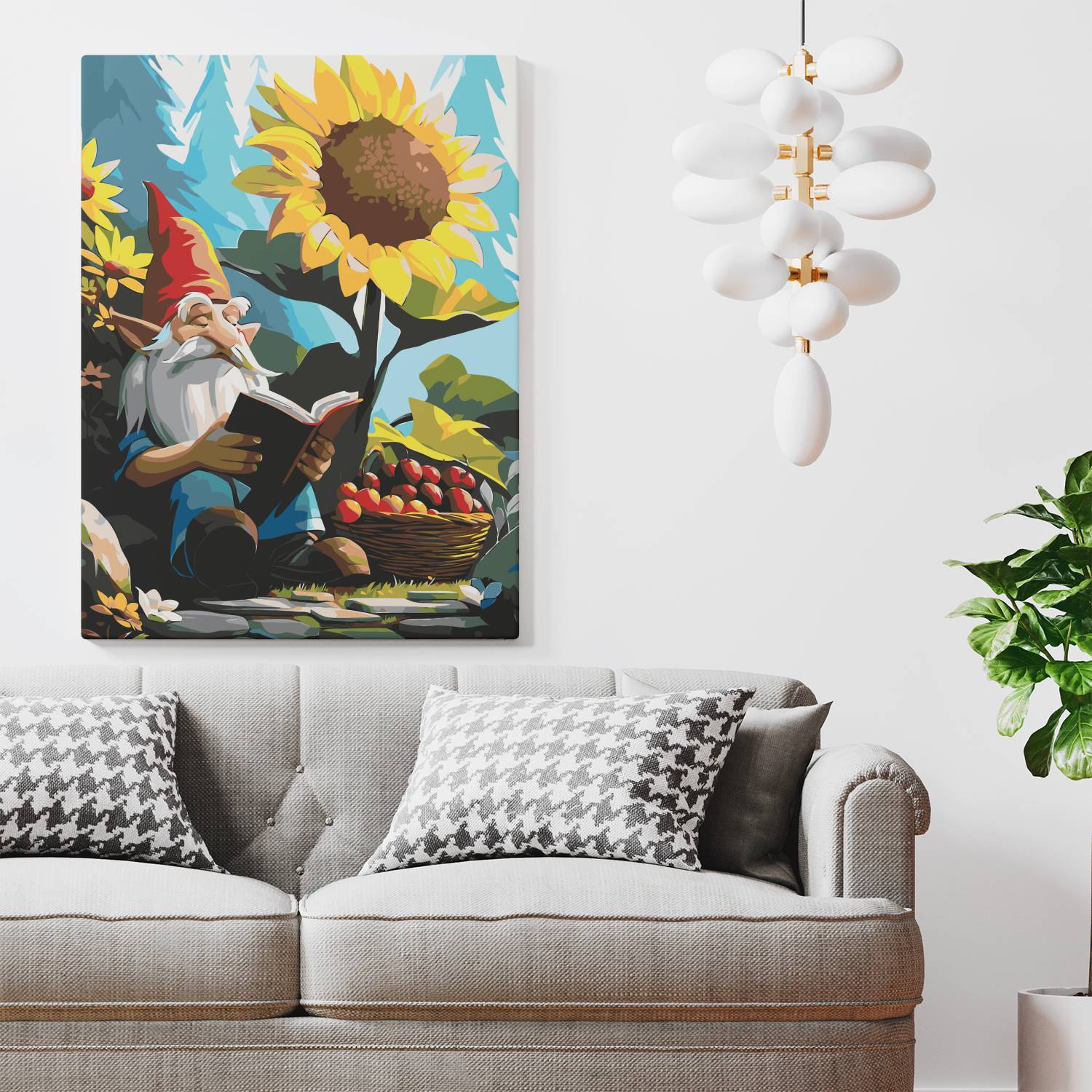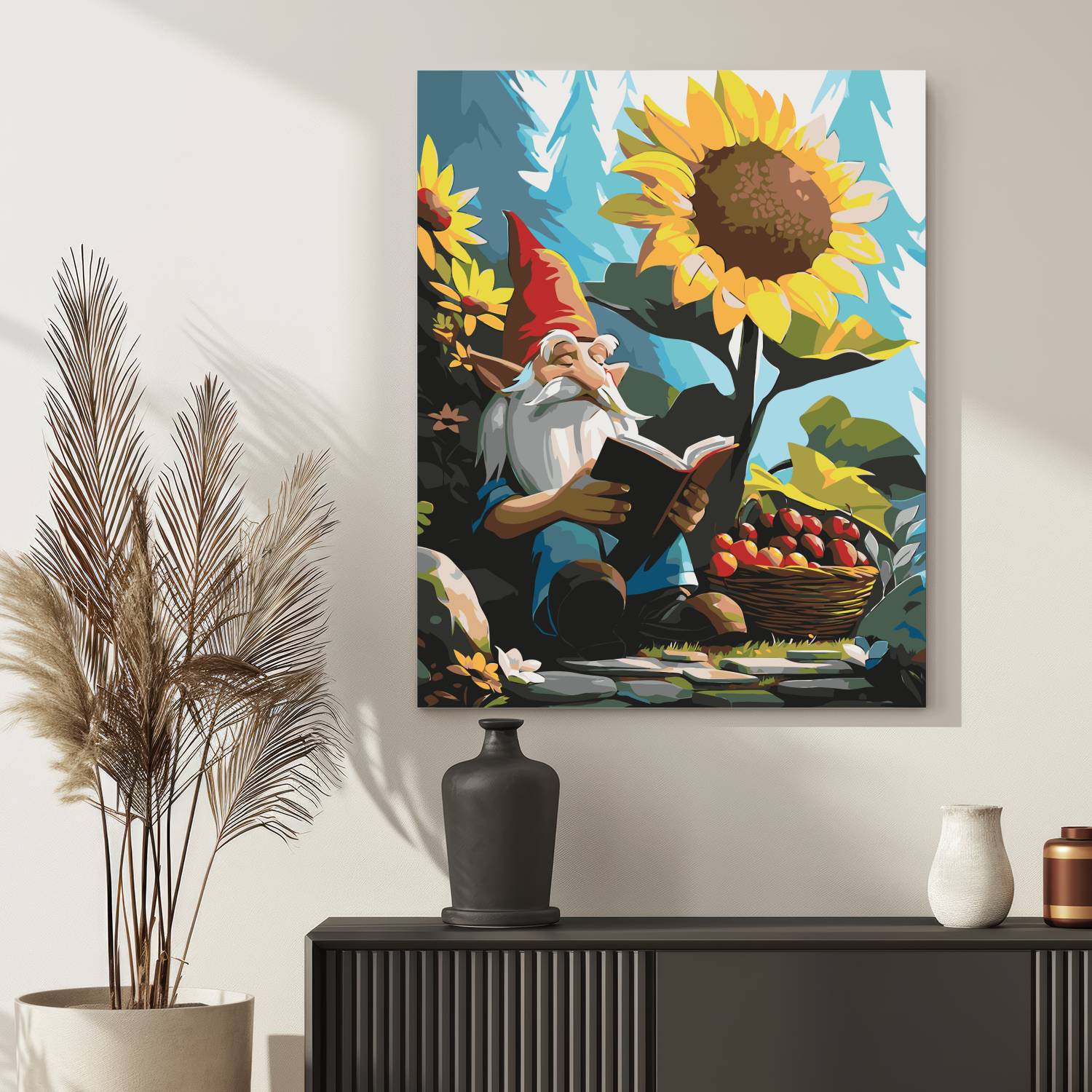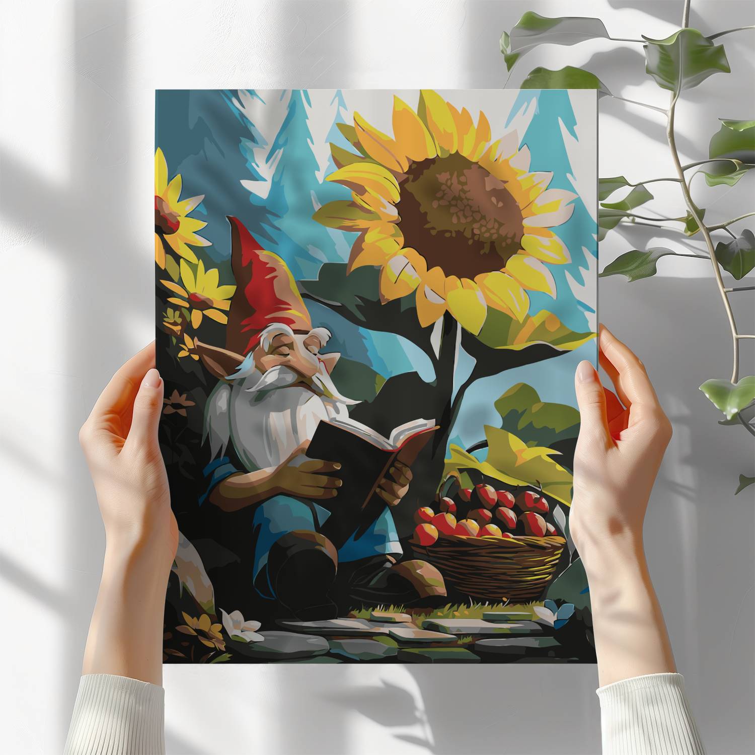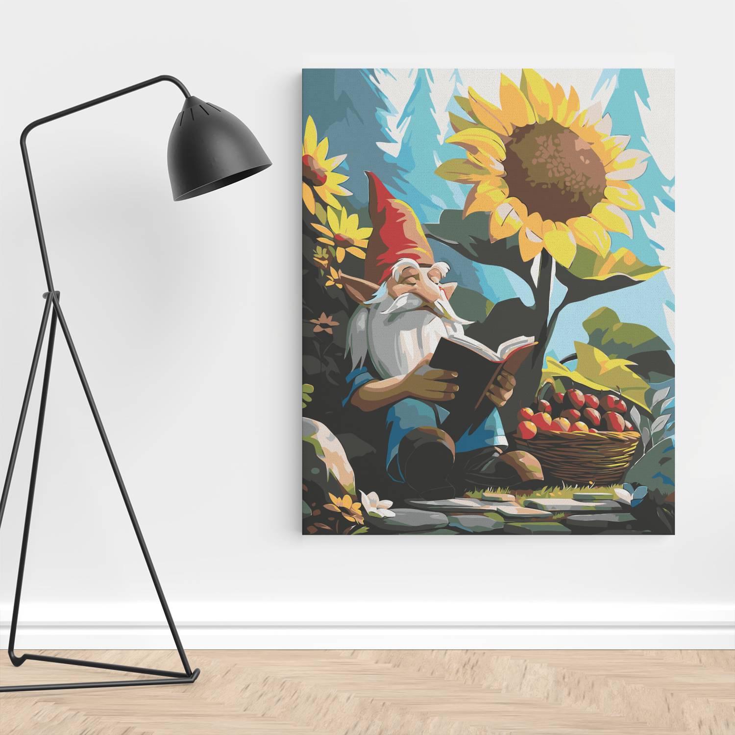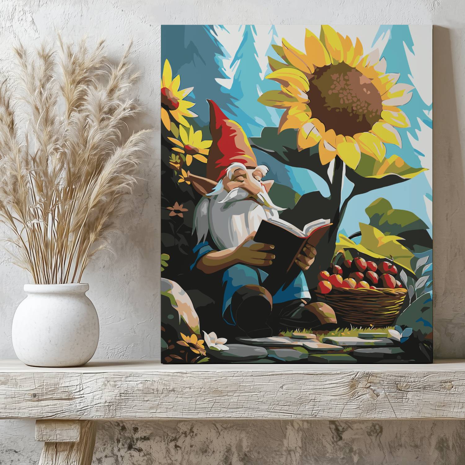 Odkryj czarujący świat wyobraźni z obrazem po numerach „Leśny Krasnal z Książką”! Wzruszająca scena z uroczym krasnalem pogrążonym w lekturze pod słonecznikiem, w otoczeniu jabłek i kwiatów, przenosi nas do bajkowej krainy natury i spokoju. Idealna kompozycja dla miłośników fantasy, natury i sielskich klimatów. Malowanie po numerach to relaks i świetna zabawa, a gotowy obraz wniesie magię do każdego wnętrza.