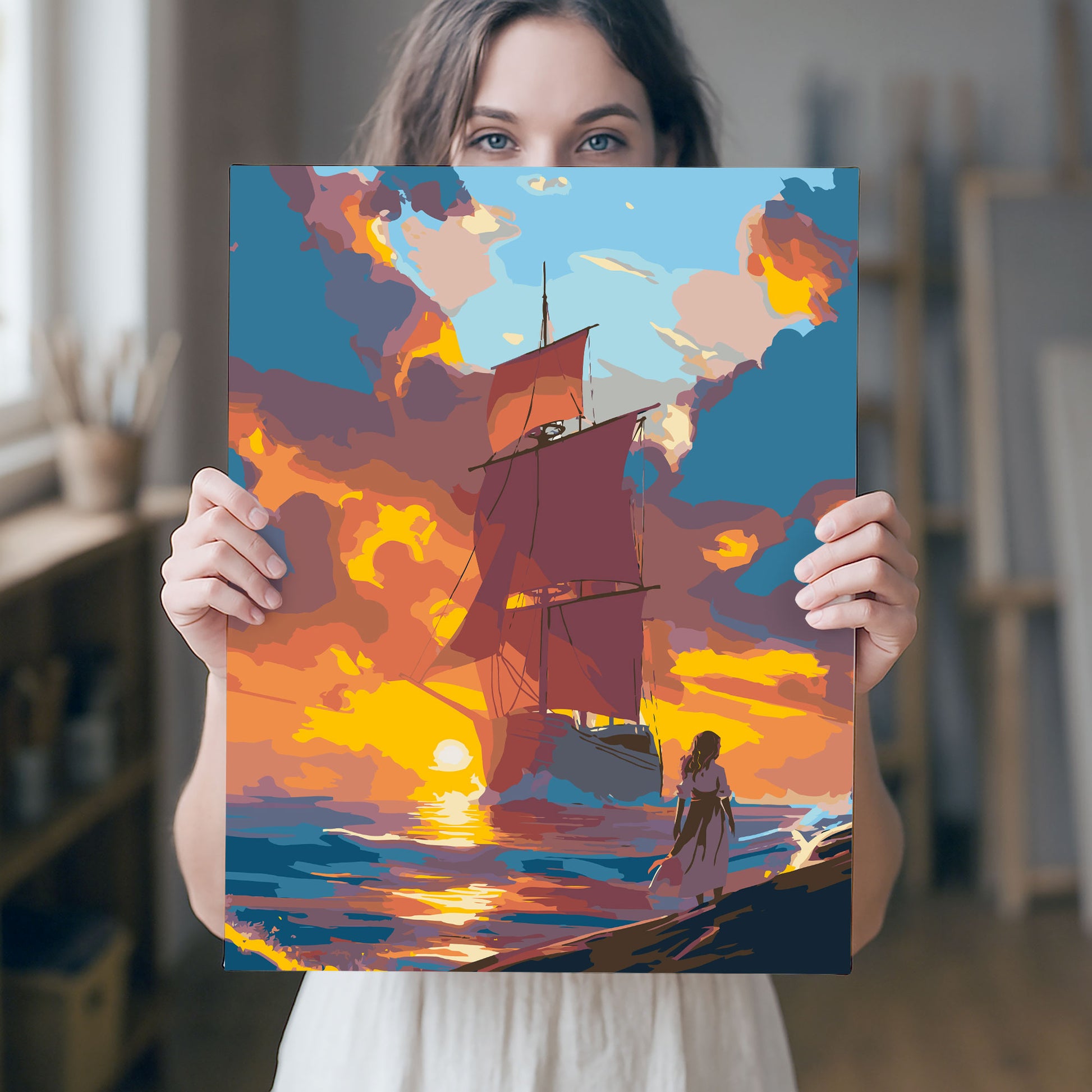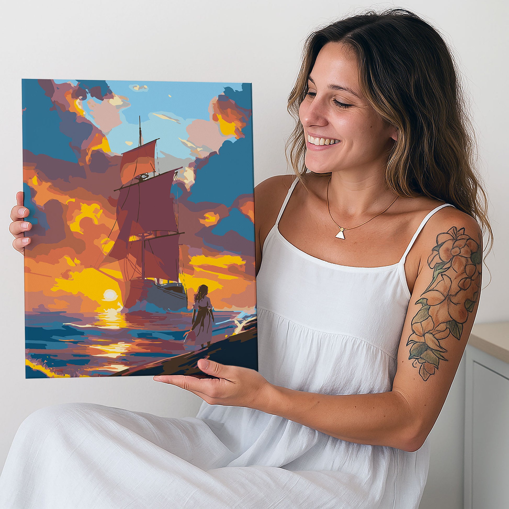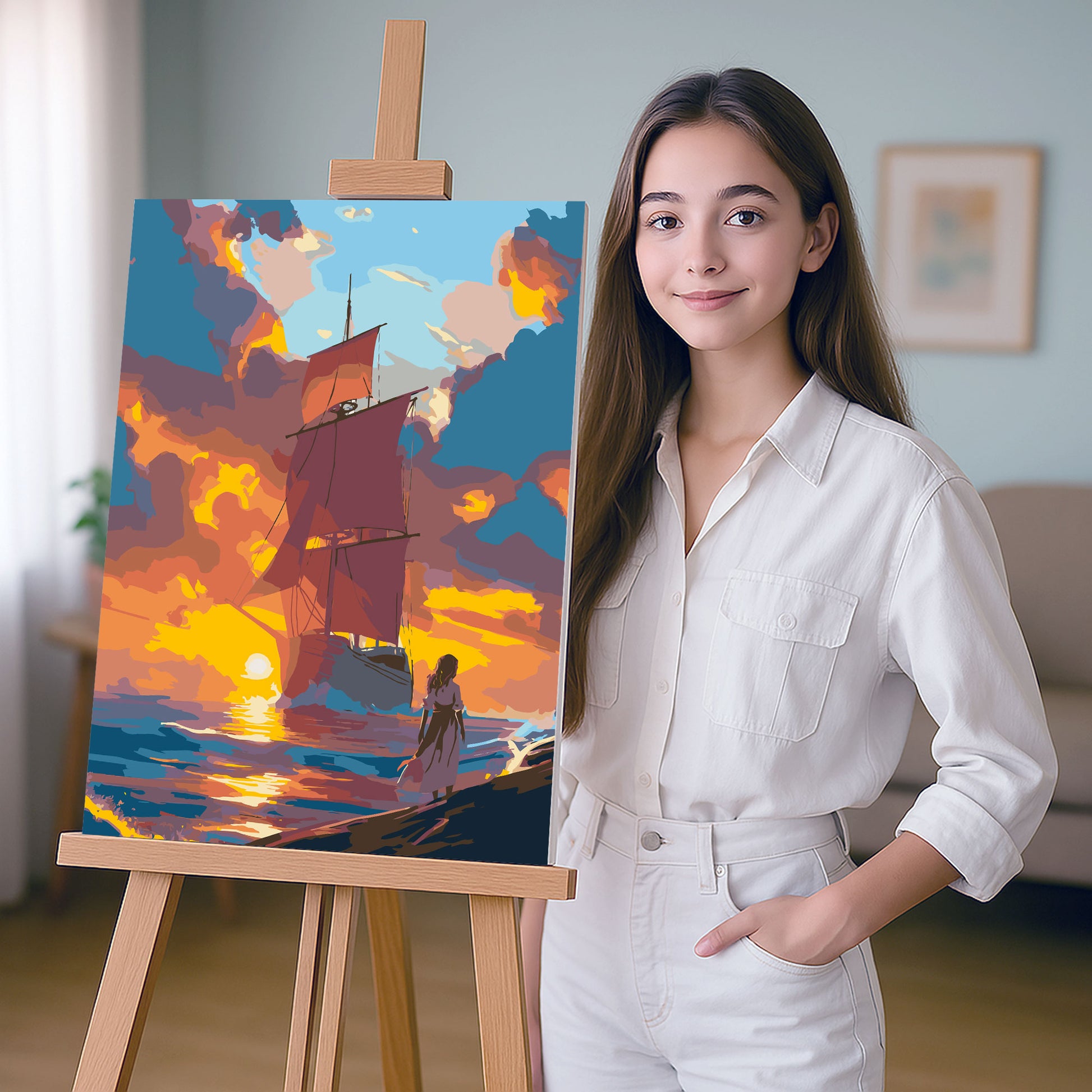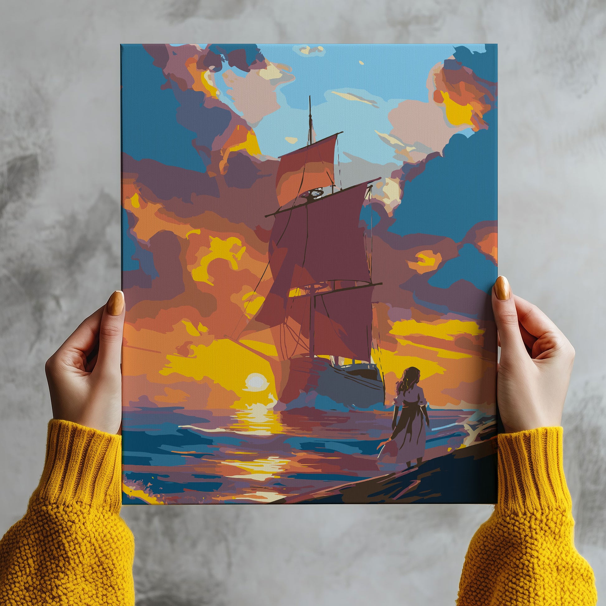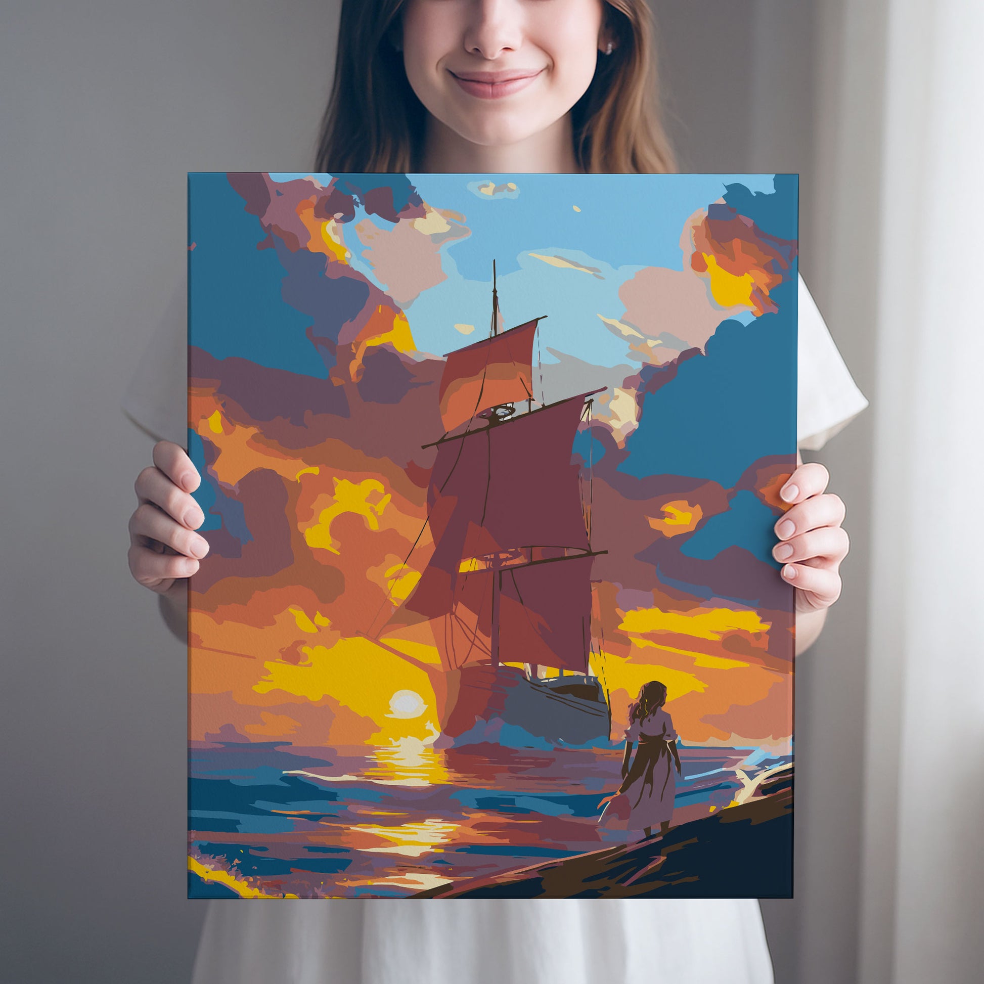 Przenieś się w świat marzeń z obrazem po numerach „Czerwone Żagle – Romantyczny Zachód Słońca”. Motyw przedstawia majestatyczny żaglowiec o czerwonych żaglach płynący ku zachodzącemu słońcu, a na brzegu stoi dziewczyna z rozwianą suknią, zatopiona w marzeniach i oczekiwaniu. Ten magiczny pejzaż inspirowany klasyczną literaturą i bajkami wprowadza do wnętrza aurę przygody, nostalgii i romantyzmu. Idealny dla miłośników podróży, morza i inspirujących dekoracji do salonu, sypialni czy pokoju nastolatki.