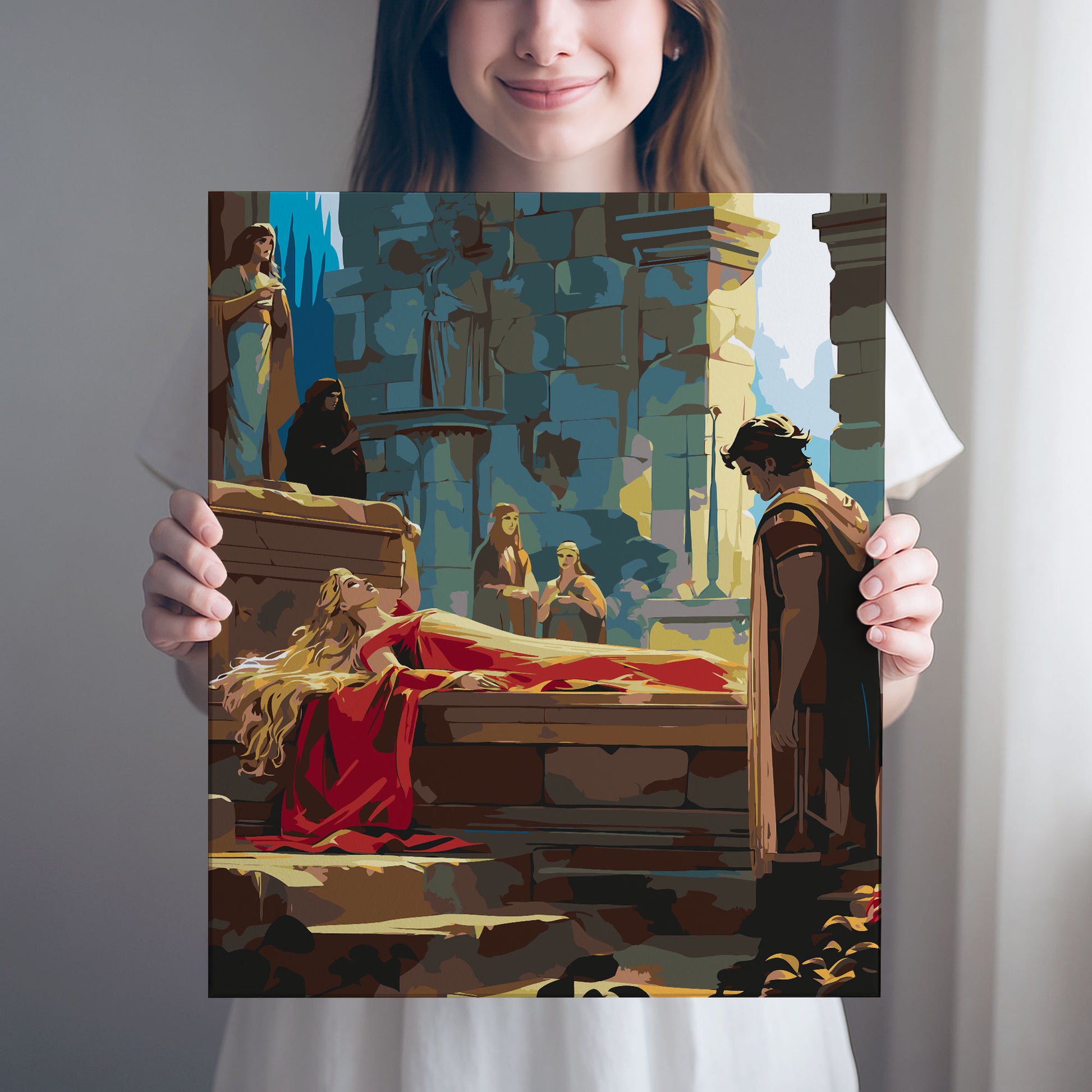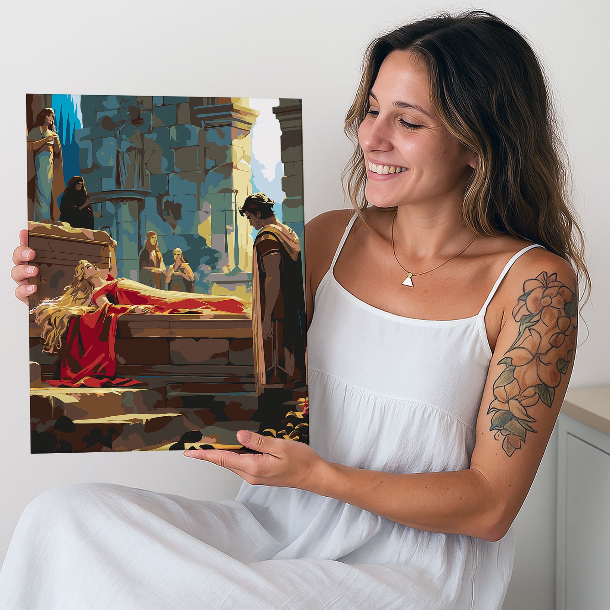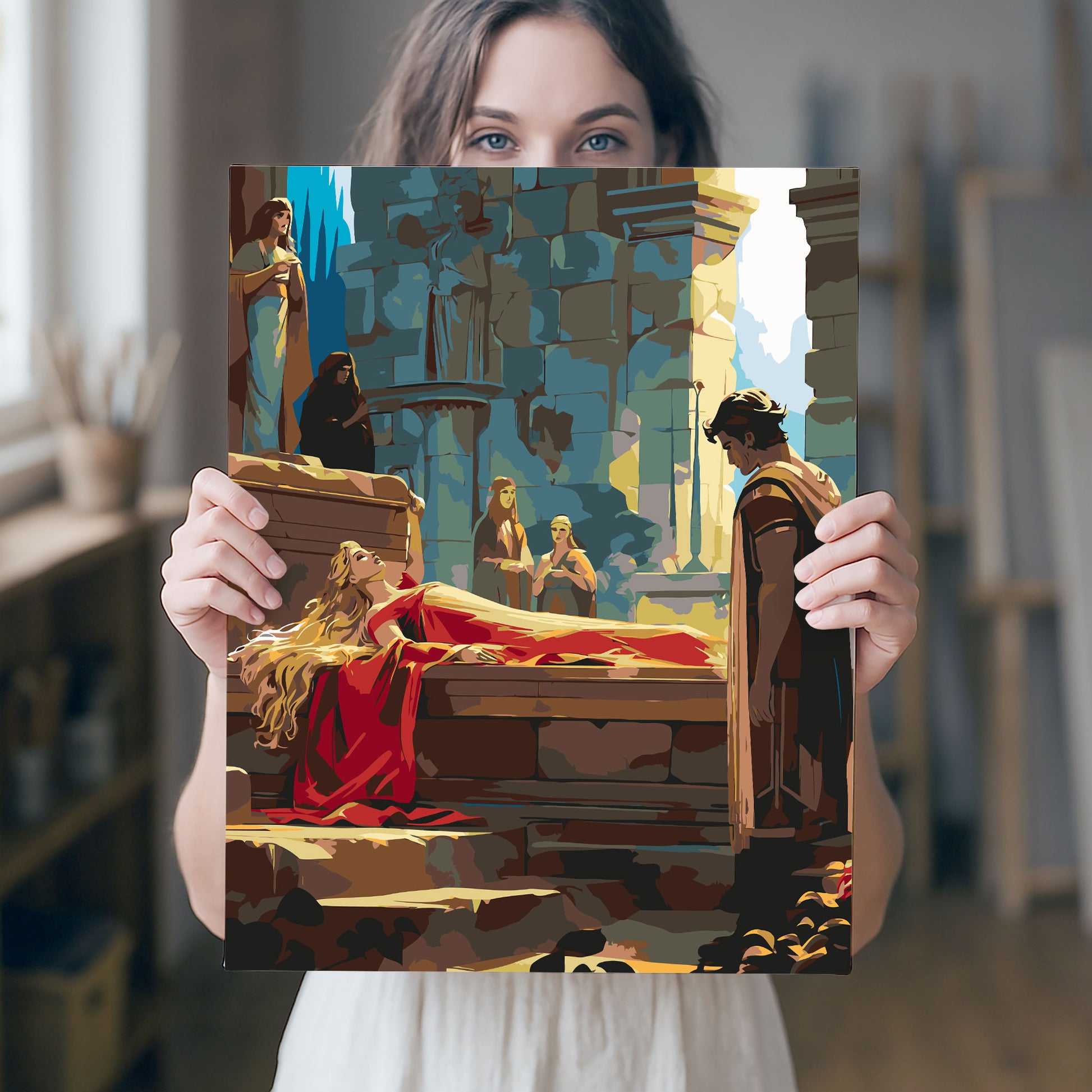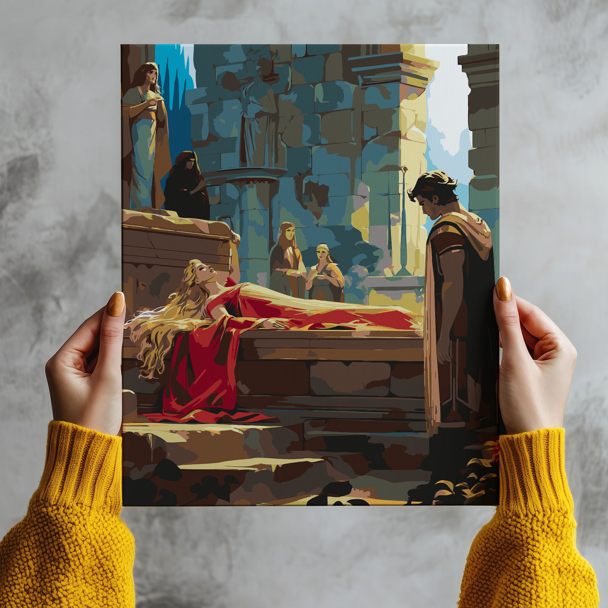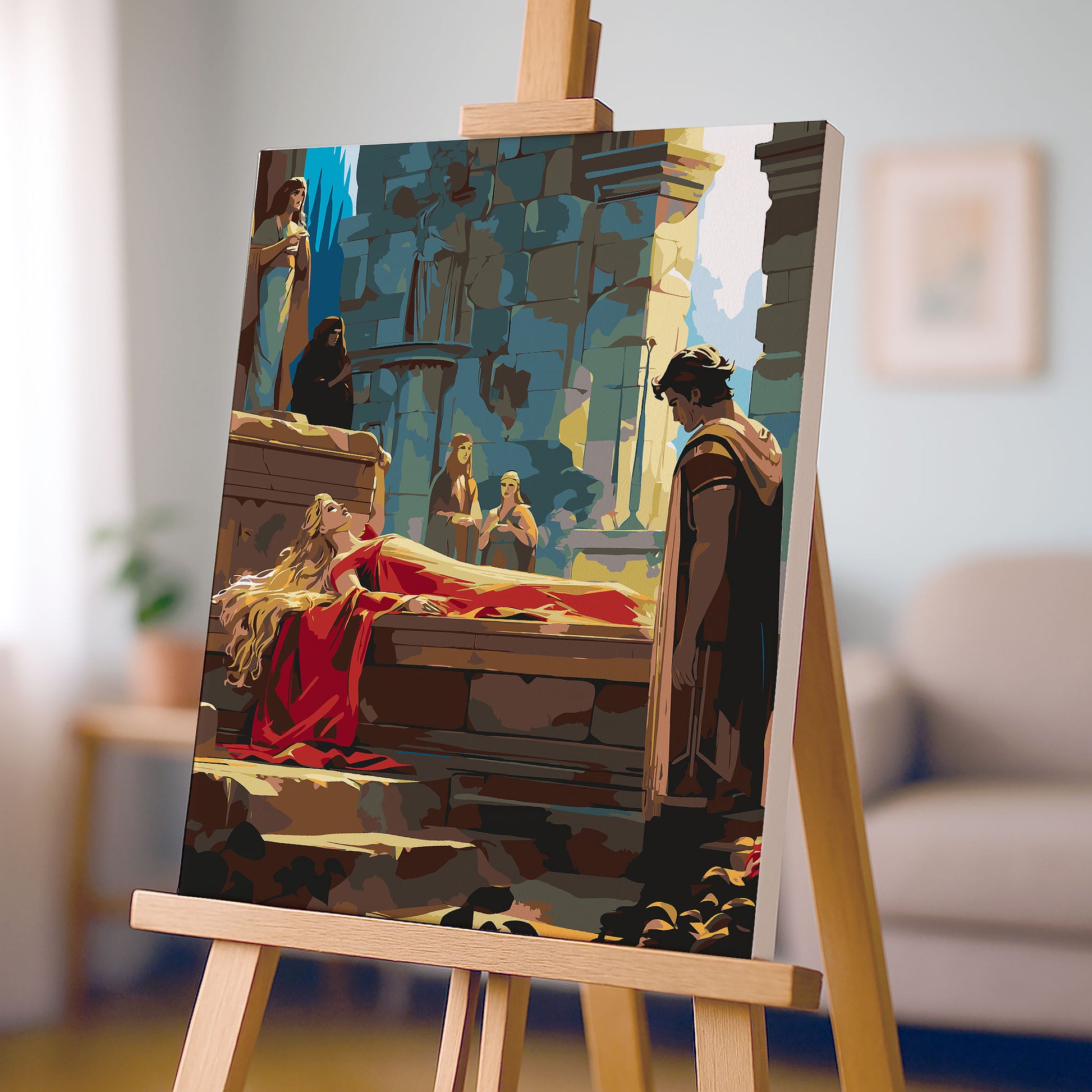 Przenieś się do świata baśni z obrazem po numerach „Śpiąca Królewna – Baśniowy Sen”. Ten uroczy wzór przedstawia magiczny moment, gdy piękna królewna w czerwonej sukni śpi w otoczeniu zamkowych murów, czekając na pocałunek, który przerwie jej zaczarowany sen. Subtelne kolory, romantyczna sceneria i baśniowa atmosfera sprawiają, że obraz idealnie wpasuje się do sypialni, pokoju dziecka lub jako prezent dla miłośników klasycznych bajek i pięknych dekoracji.