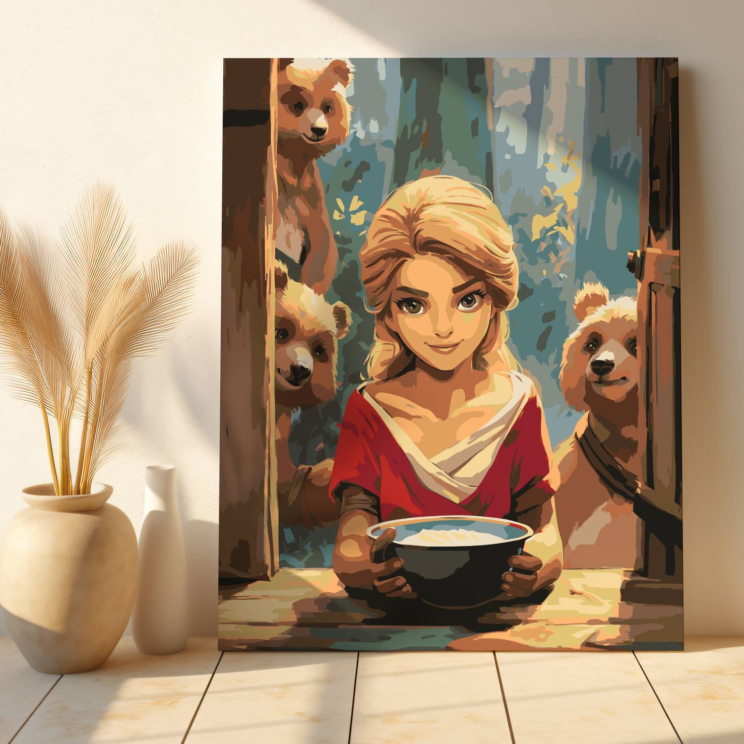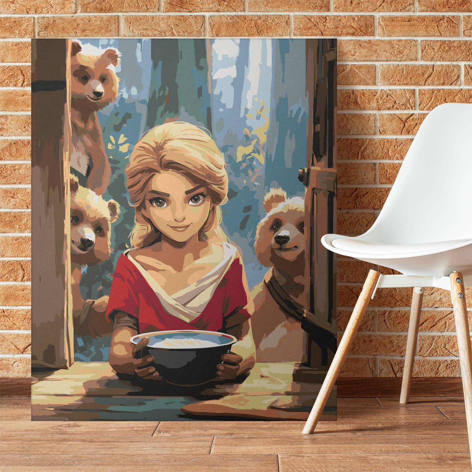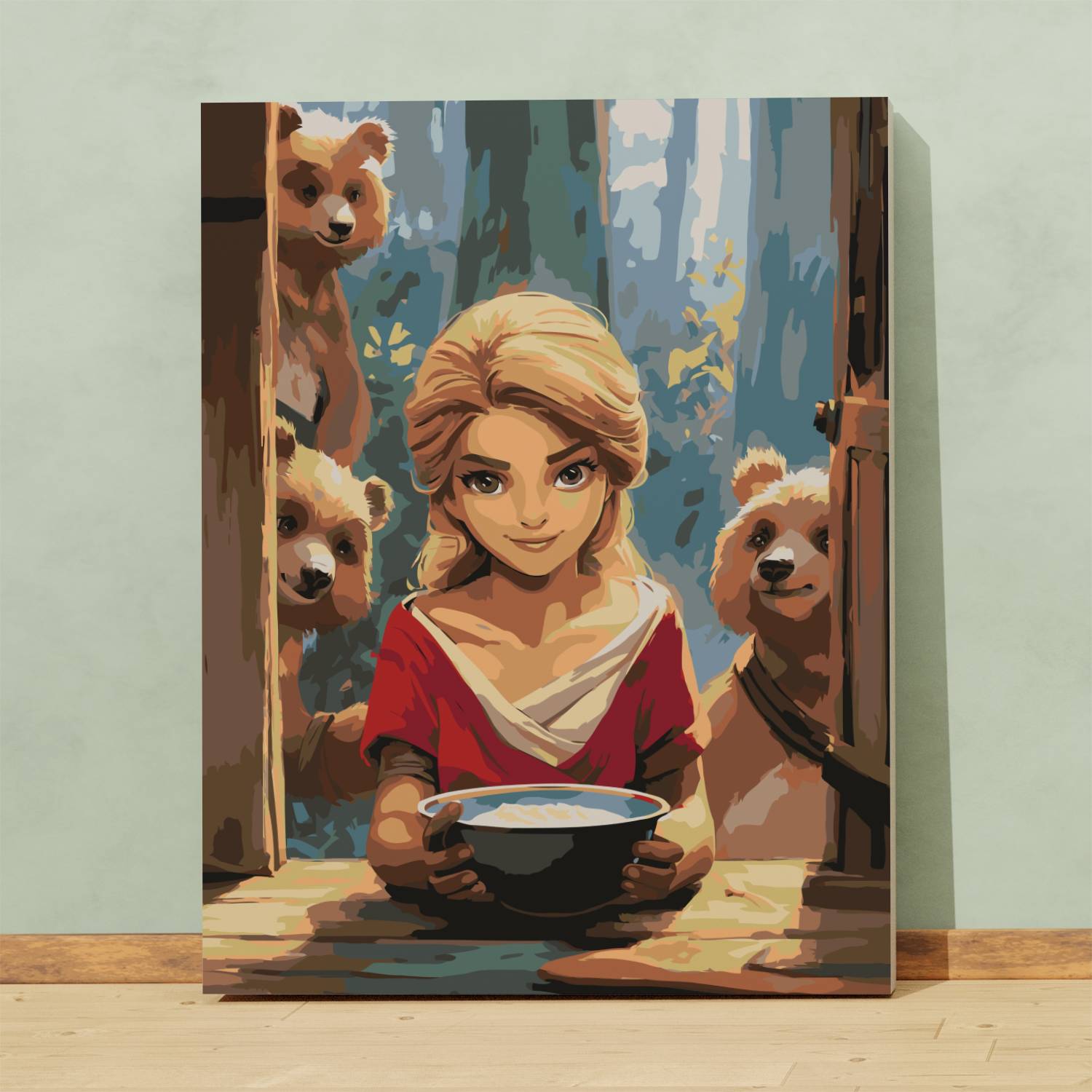 Ożyw klasyczną bajkę w artystycznej formie z obrazem po numerach „Złotowłosa i Trzy Misie”! Urocza scena przedstawia Złotowłosą z miseczką owsianki oraz rodzinę niedźwiedzi zaglądającą do środka – pełna ciepła, humoru i nostalgii. Idealna propozycja do wspólnego malowania z dzieckiem lub jako dekoracja do pokoju dziecięcego. Ten zestaw to nie tylko kreatywny relaks, ale też podróż do świata znanych i kochanych opowieści.
