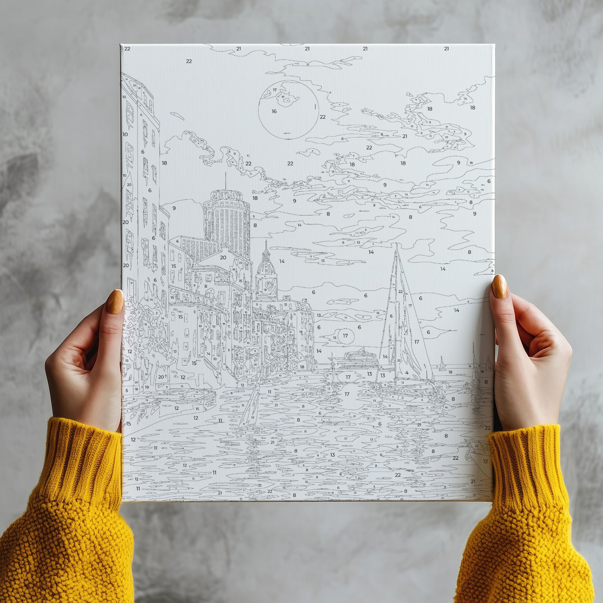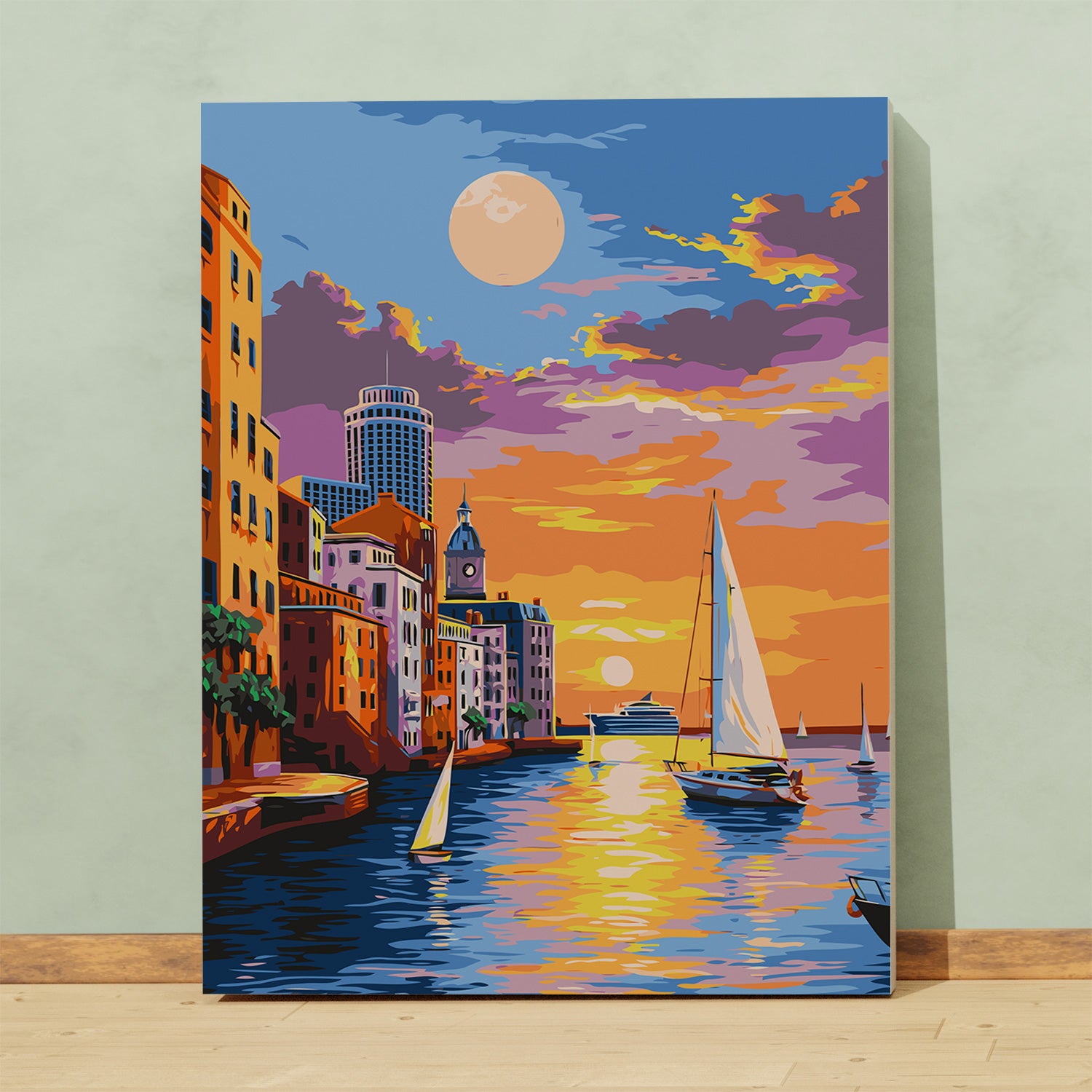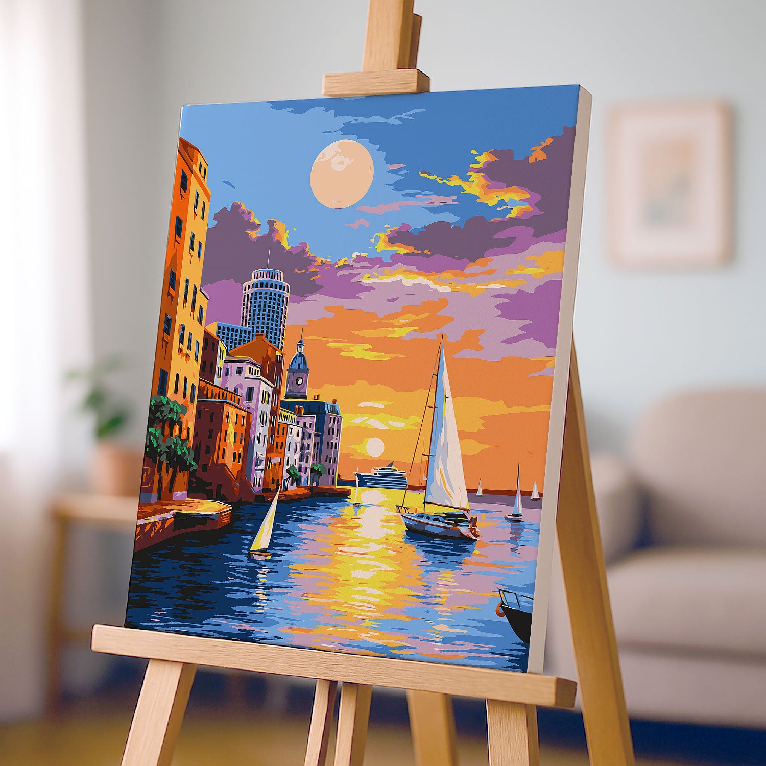 Przenieś się na słoneczne wybrzeże i poczuj magię zachodu słońca nad morzem z naszym obrazem po numerach „Romantyczny Zachód Słońca nad Morzem – Jachty i Miasto”. Barwna kompozycja z żaglówkami, ciepłymi światłami miasta i odbijającym się w wodzie słońcem doda wnętrzu wyjątkowego klimatu. To doskonały wybór dla wszystkich, którzy marzą o wakacyjnych podróżach, chwili relaksu i pięknych widokach. Maluj, odpoczywaj i poczuj nadmorską atmosferę w swoim domu!