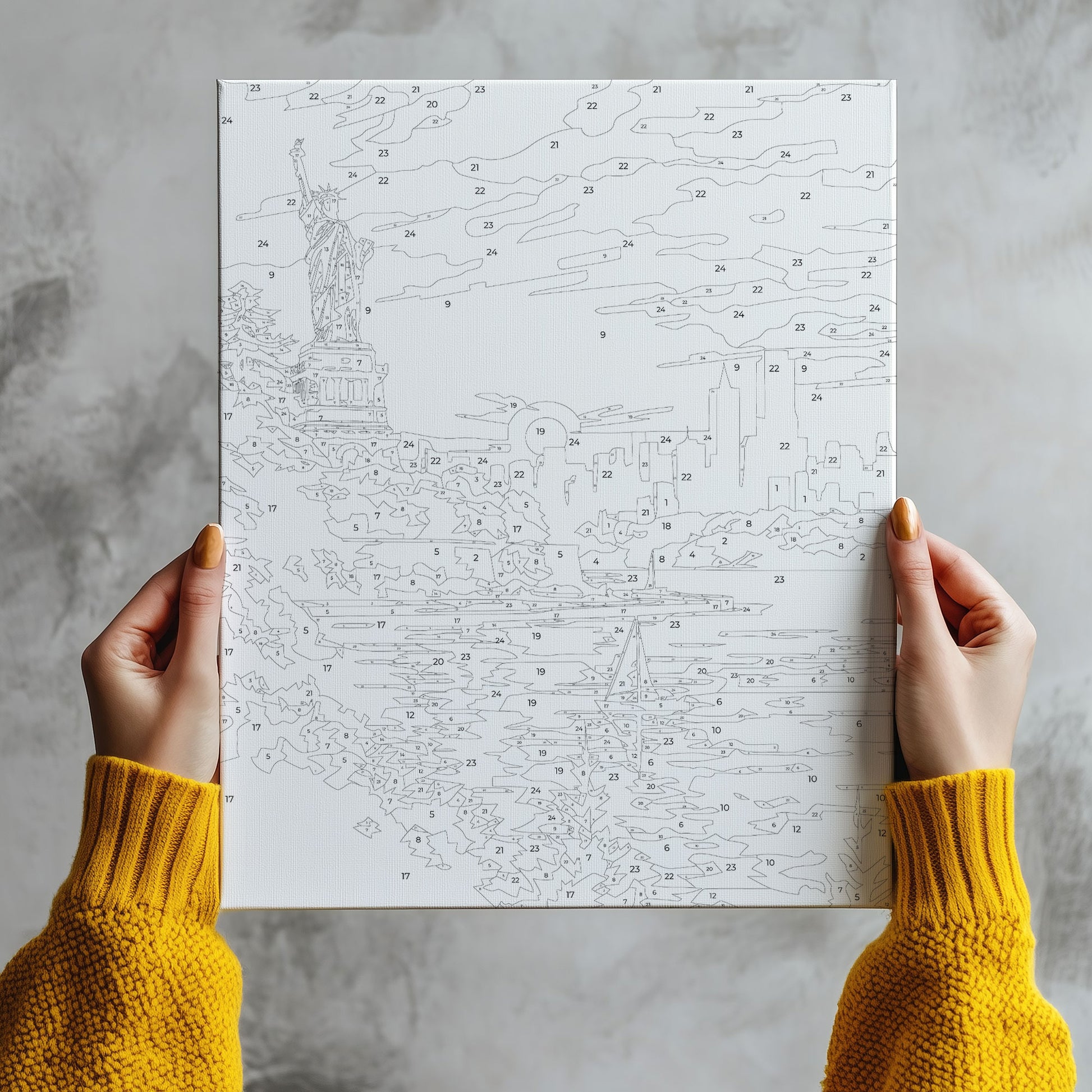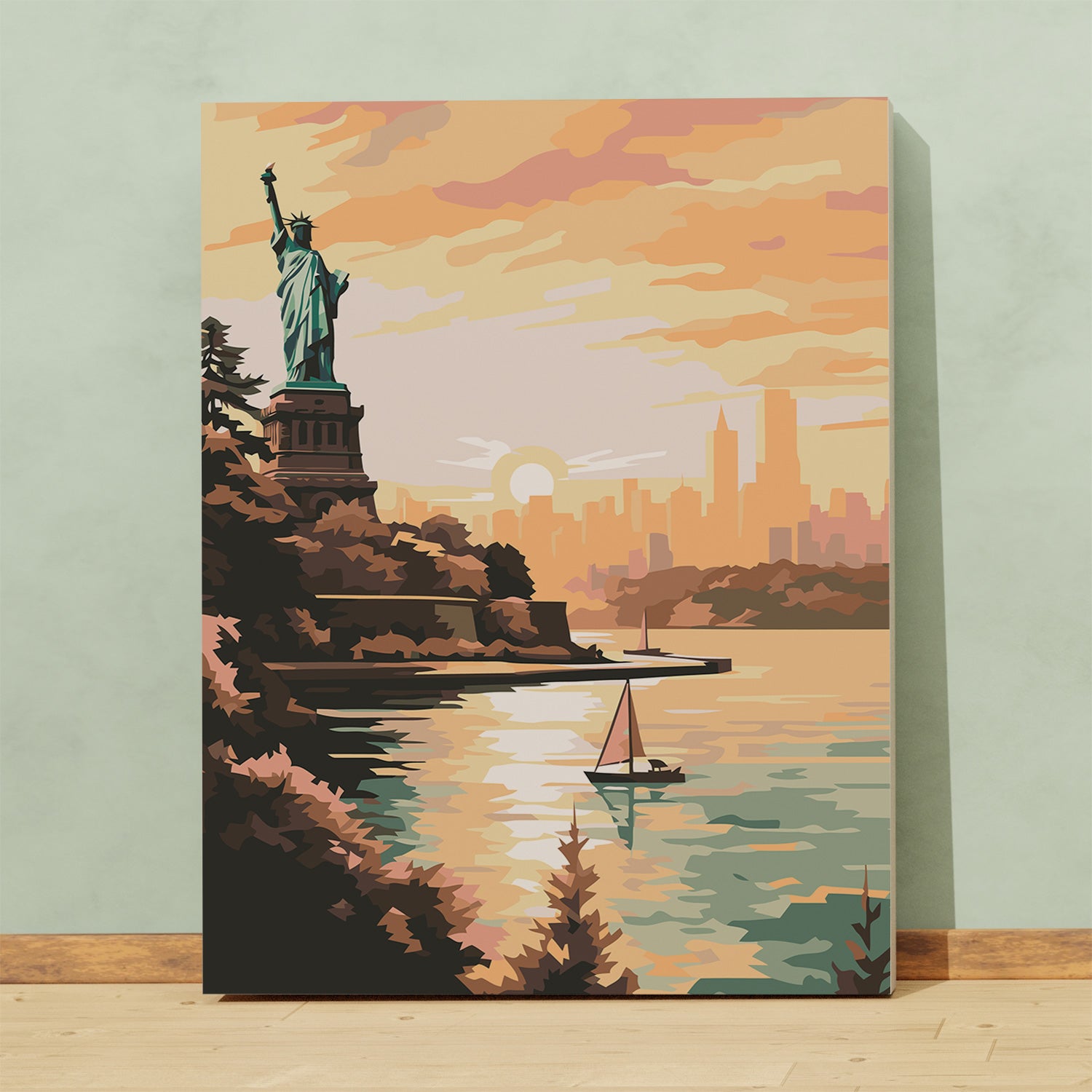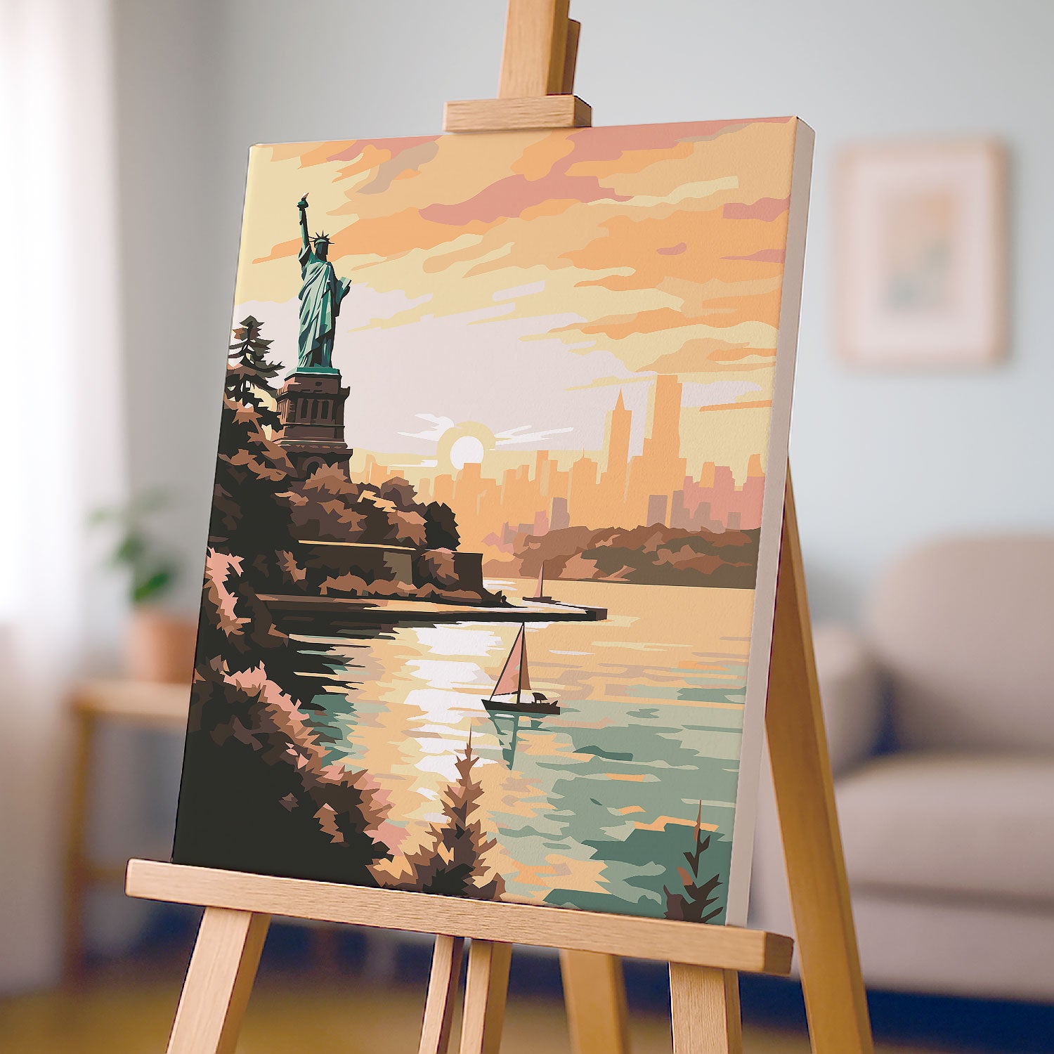 Przenieś się na drugi brzeg oceanu i poczuj klimat wielkiego miasta! Ten obraz po numerach przedstawia kultową Statuę Wolności z panoramą Nowego Jorku w ciepłych, złotych barwach zachodzącego słońca. Idealna propozycja dla miłośników podróży, amerykańskich klimatów oraz tych, którzy cenią niepowtarzalne dekoracje wnętrz. Namaluj kawałek historii i poczuj dumę z własnoręcznie stworzonego arcydzieła!