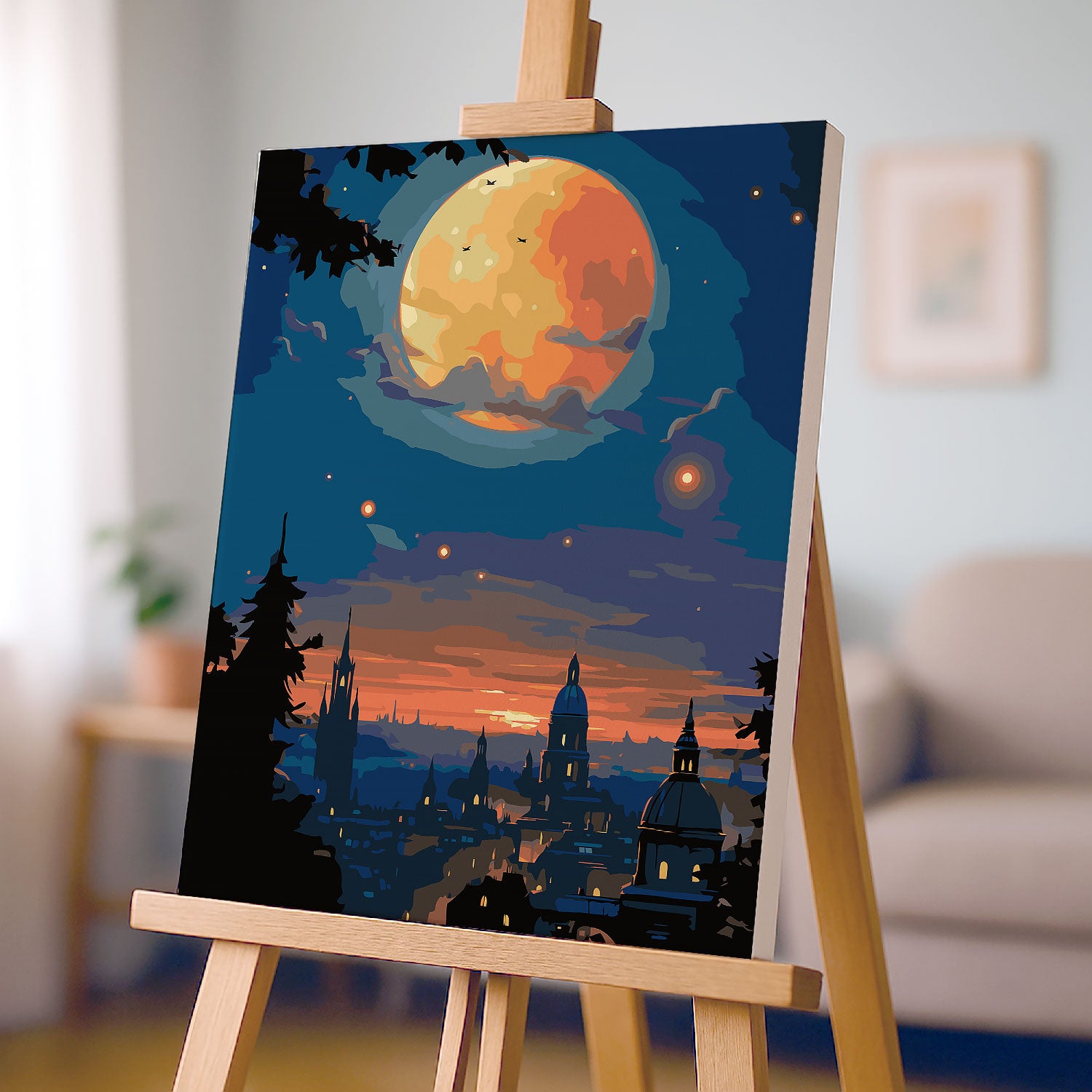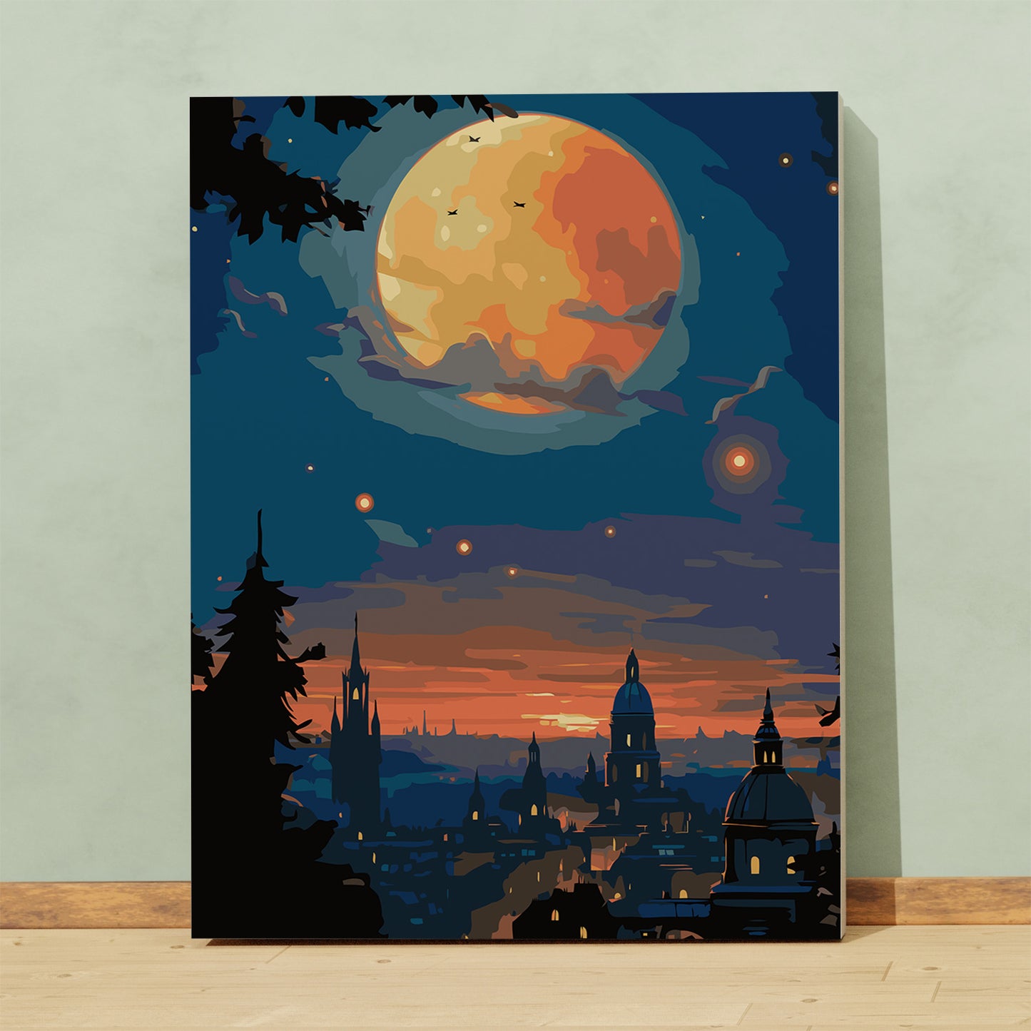 Zanurz się w niezwykłym świecie wyobraźni i magii! Ten obraz po numerach przenosi Cię do tajemniczego miasta, nad którym góruje wielki, pełny księżyc rozświetlający niebo i architekturę. Idealna propozycja dla marzycieli, miłośników nocnych krajobrazów i baśniowego klimatu. Malując ten obraz, poczujesz spokój nocy i stworzysz zachwycającą ozdobę do sypialni, salonu lub pokoju młodzieżowego.