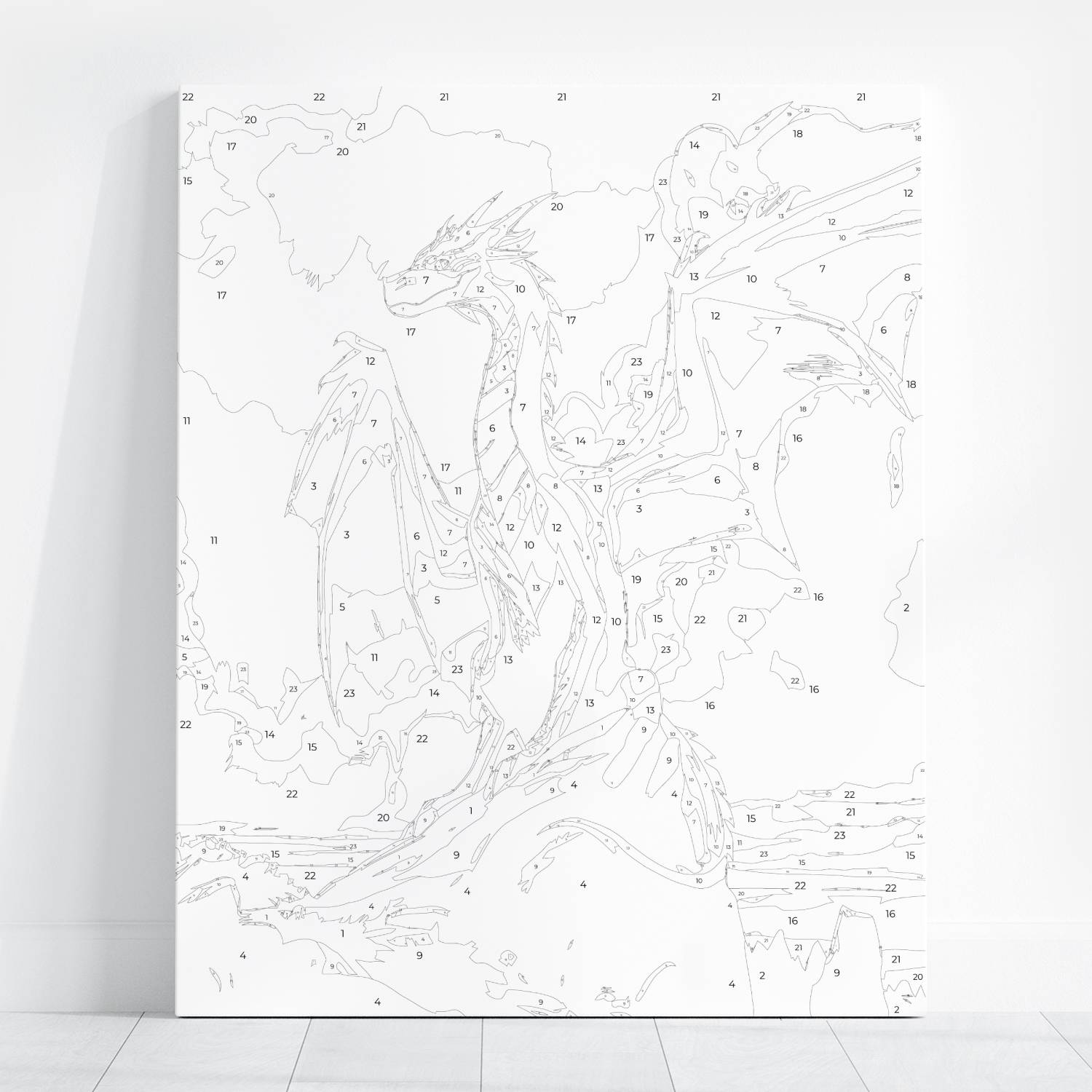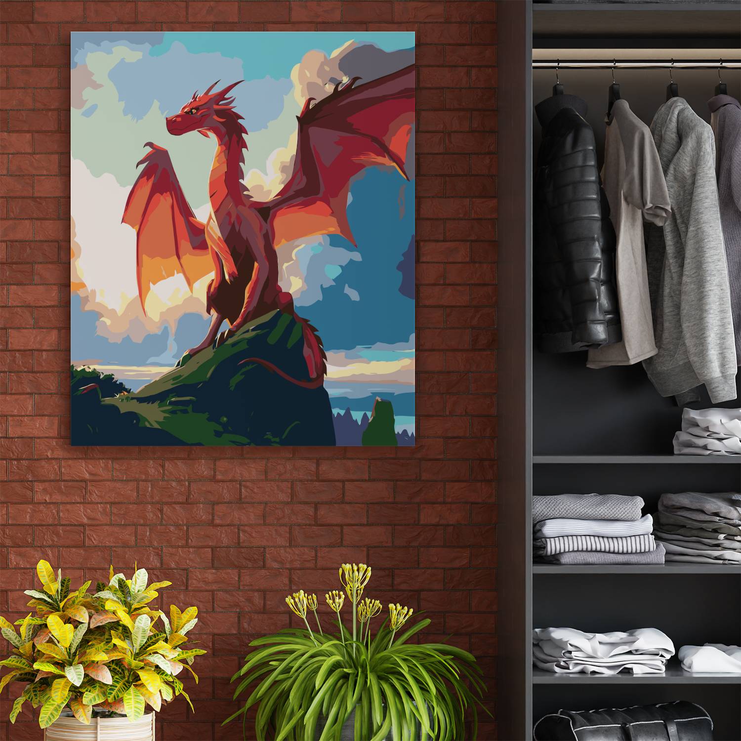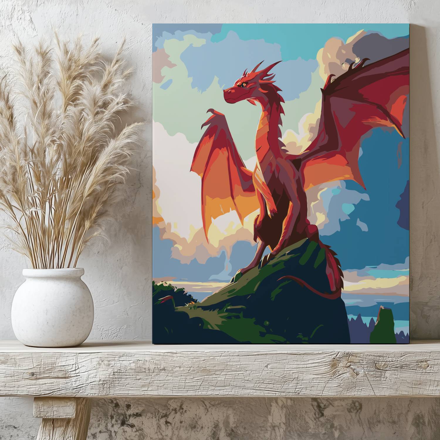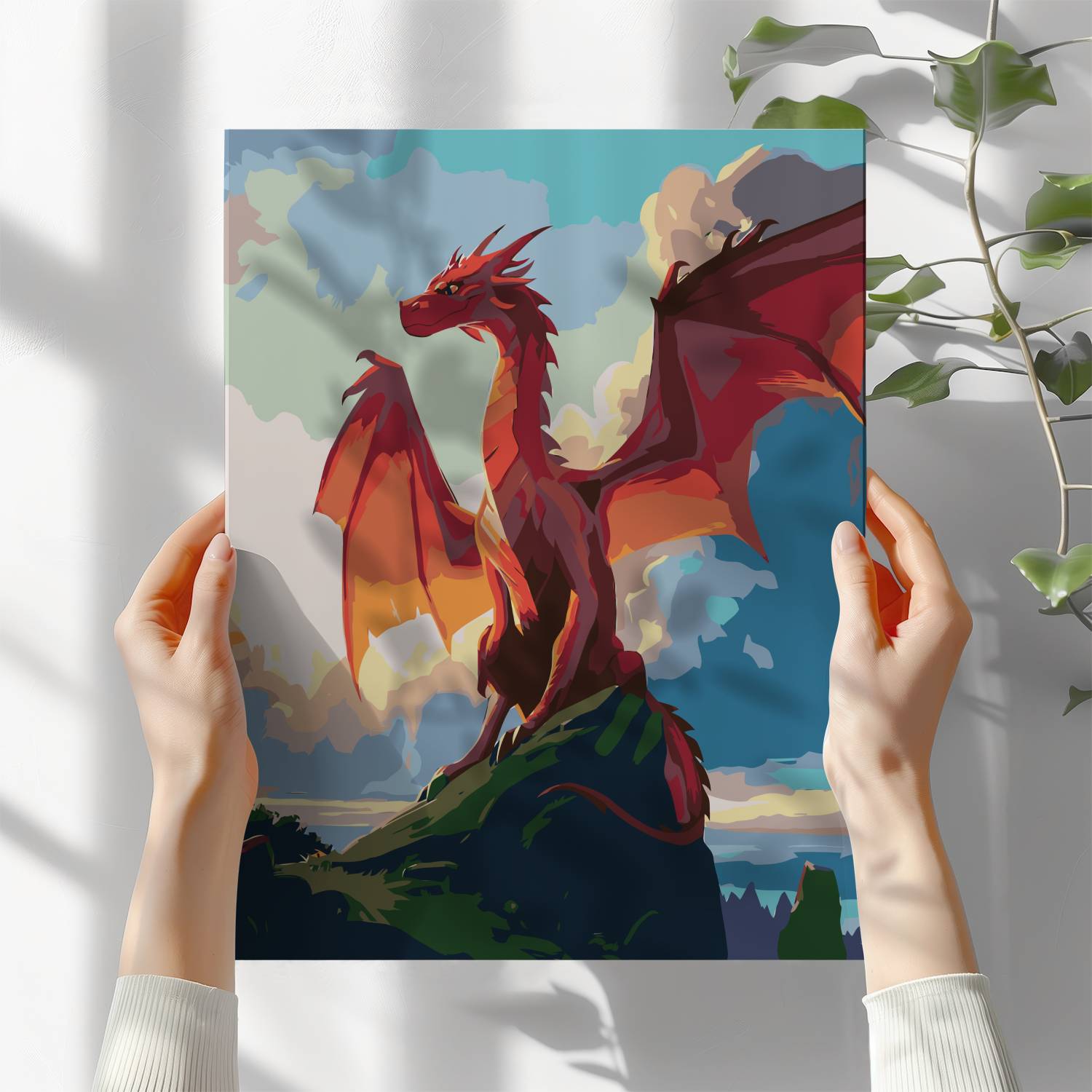 Ożyw legendarny świat smoków dzięki obrazowi po numerach „Dumny Smok na Skale”. Potężna sylwetka czerwonego smoka z rozpostartymi skrzydłami na tle zachodzącego słońca emanuje siłą i spokojem. Idealny dla fanów fantasy, epickich pejzaży i twórczego relaksu. Doskonały jako dekoracja i kreatywna odskocznia od codzienności.