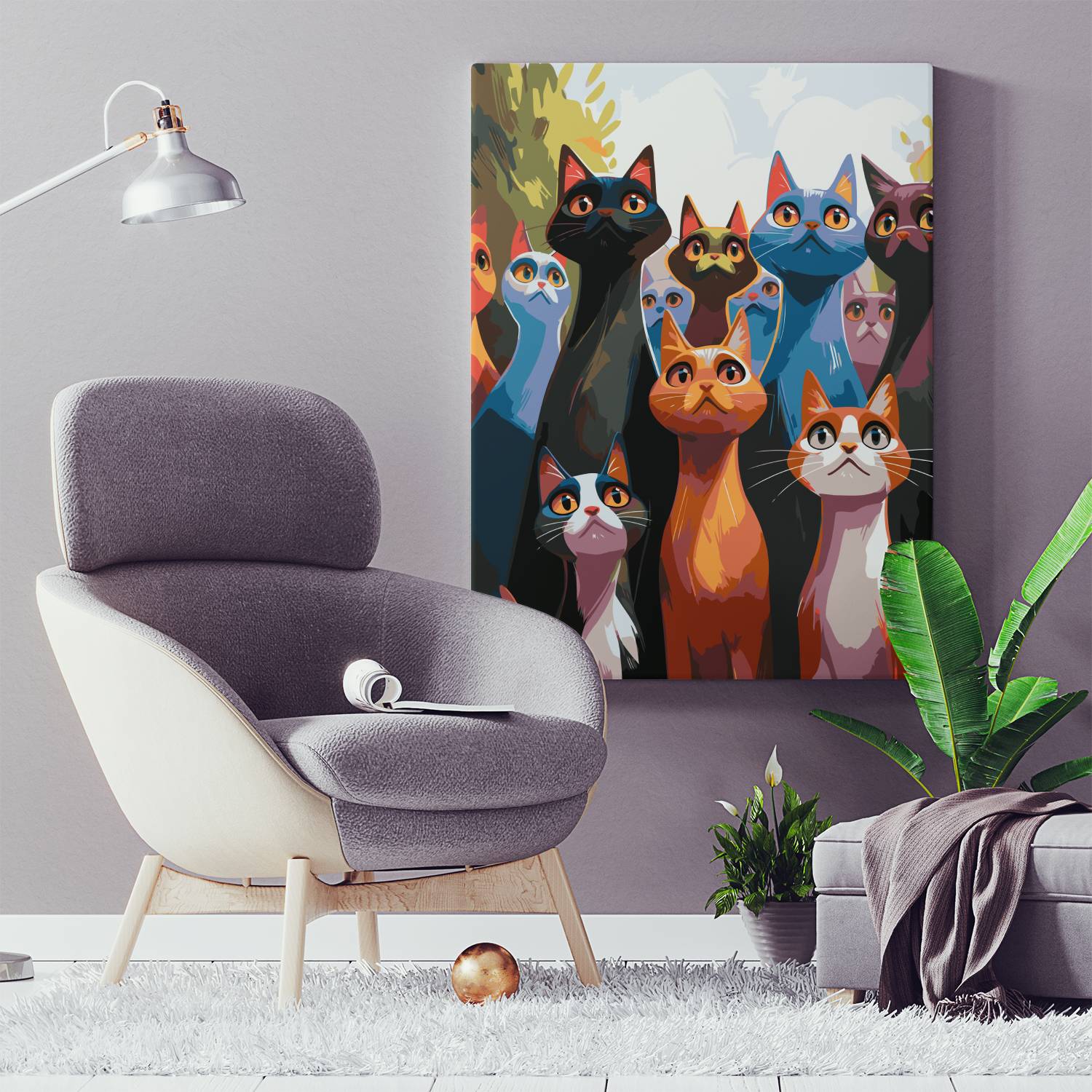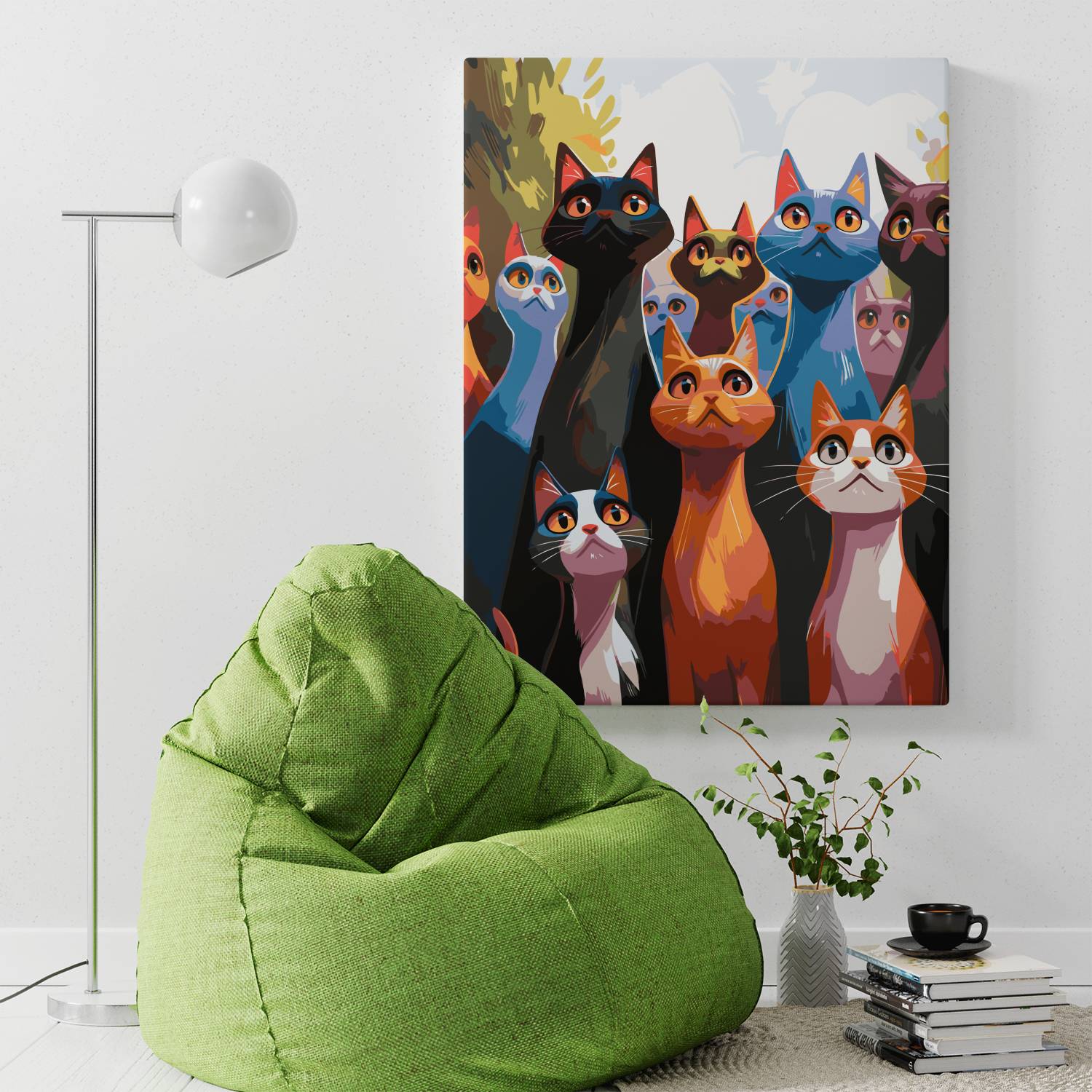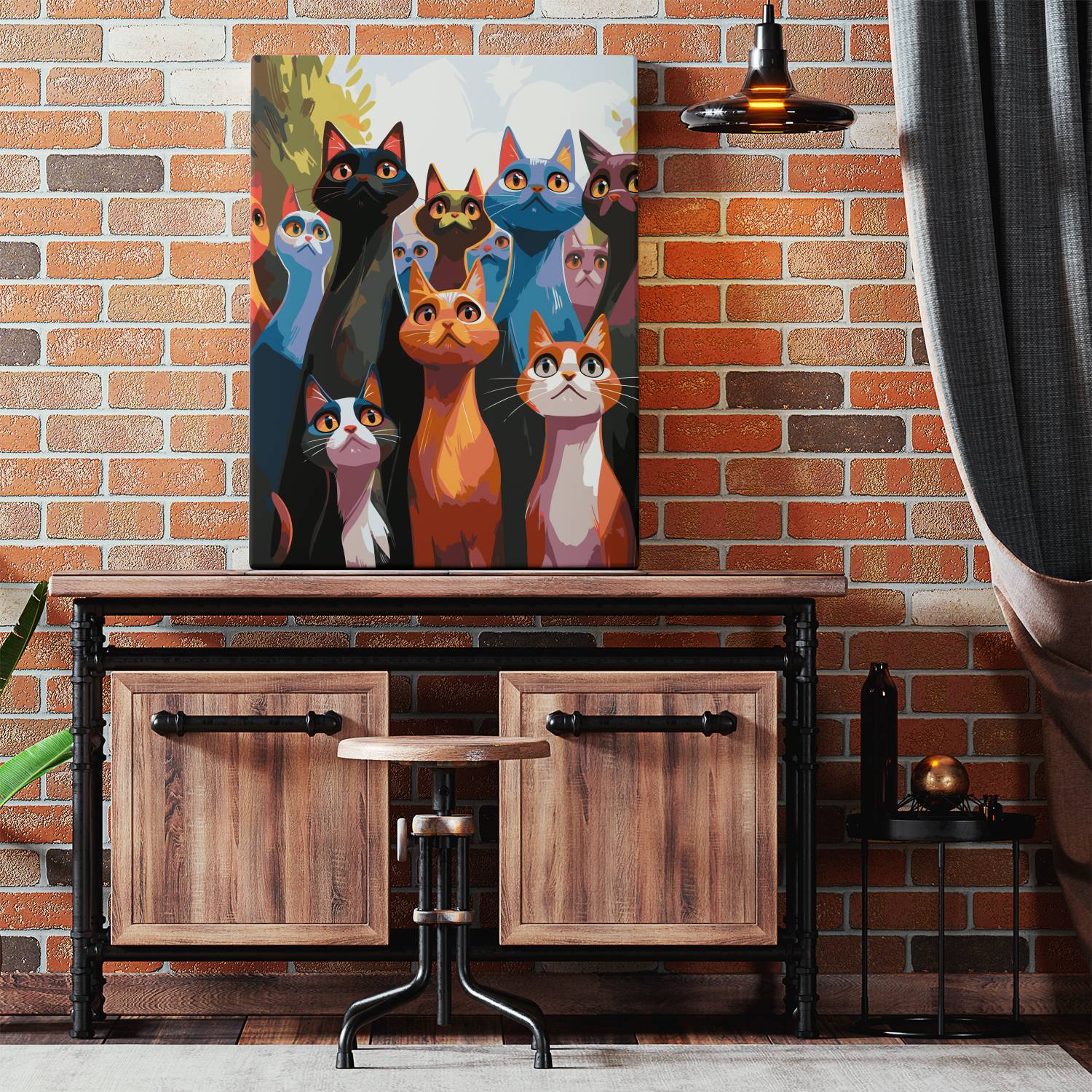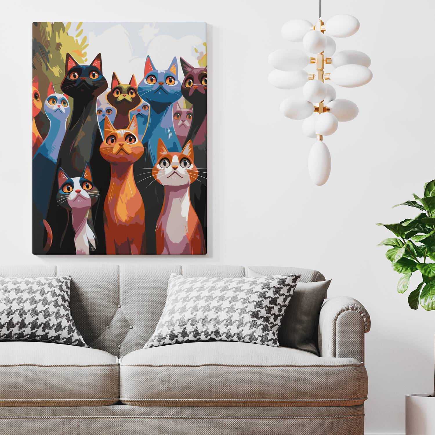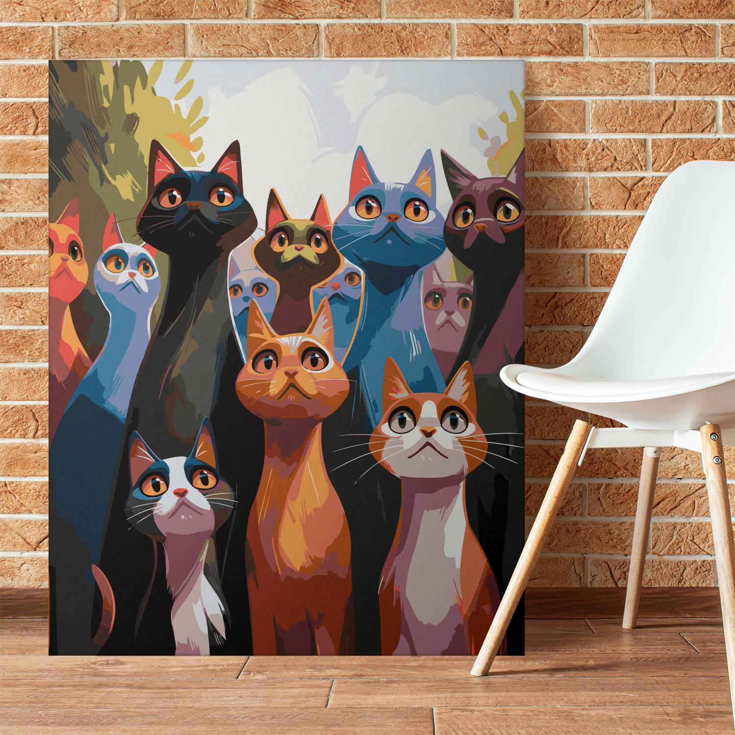 Zanurz się w świat kociej ciekawości z obrazem po numerach „Kocie Spojrzenia”! Grupa kotów w różnorodnych kolorach i stylizowanej formie patrzy z zaciekawieniem ku górze, tworząc zabawną i jednocześnie estetyczną kompozycję. Obraz pełen charakteru, idealny dla miłośników kotów i nowoczesnej sztuki. Malowanie po numerach to nie tylko relaks, ale też szansa na stworzenie wyjątkowej dekoracji do domu. Świetny pomysł na prezent dla każdego kociarza!