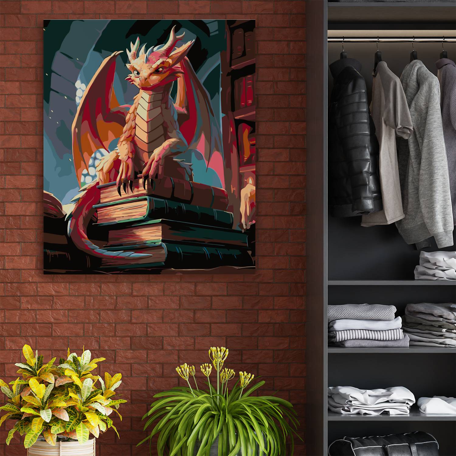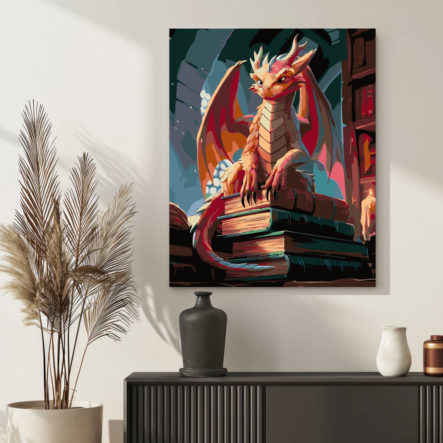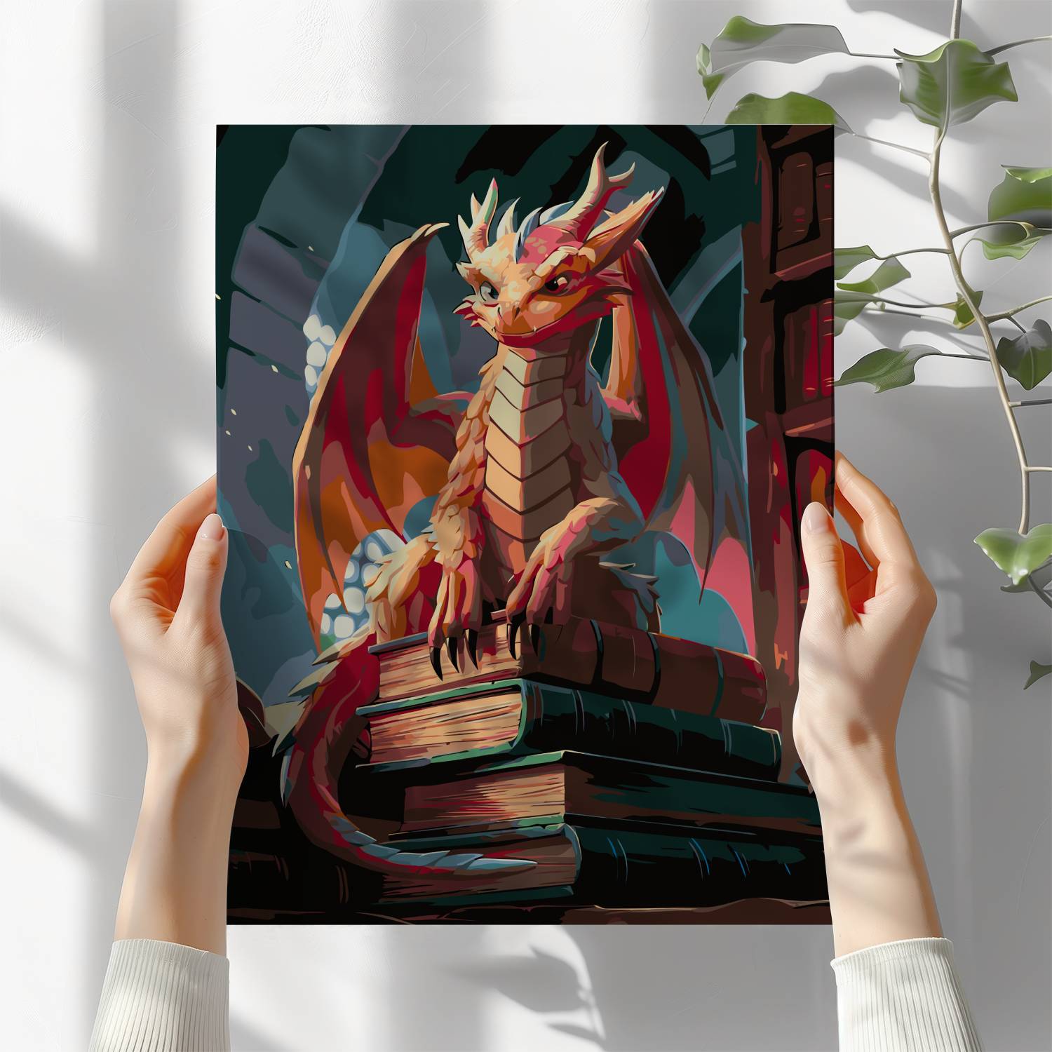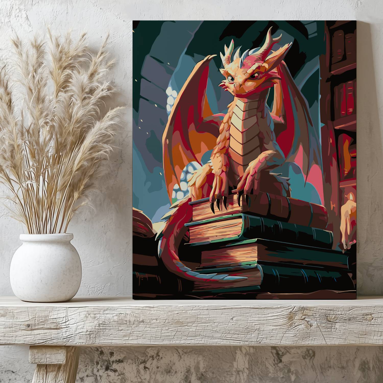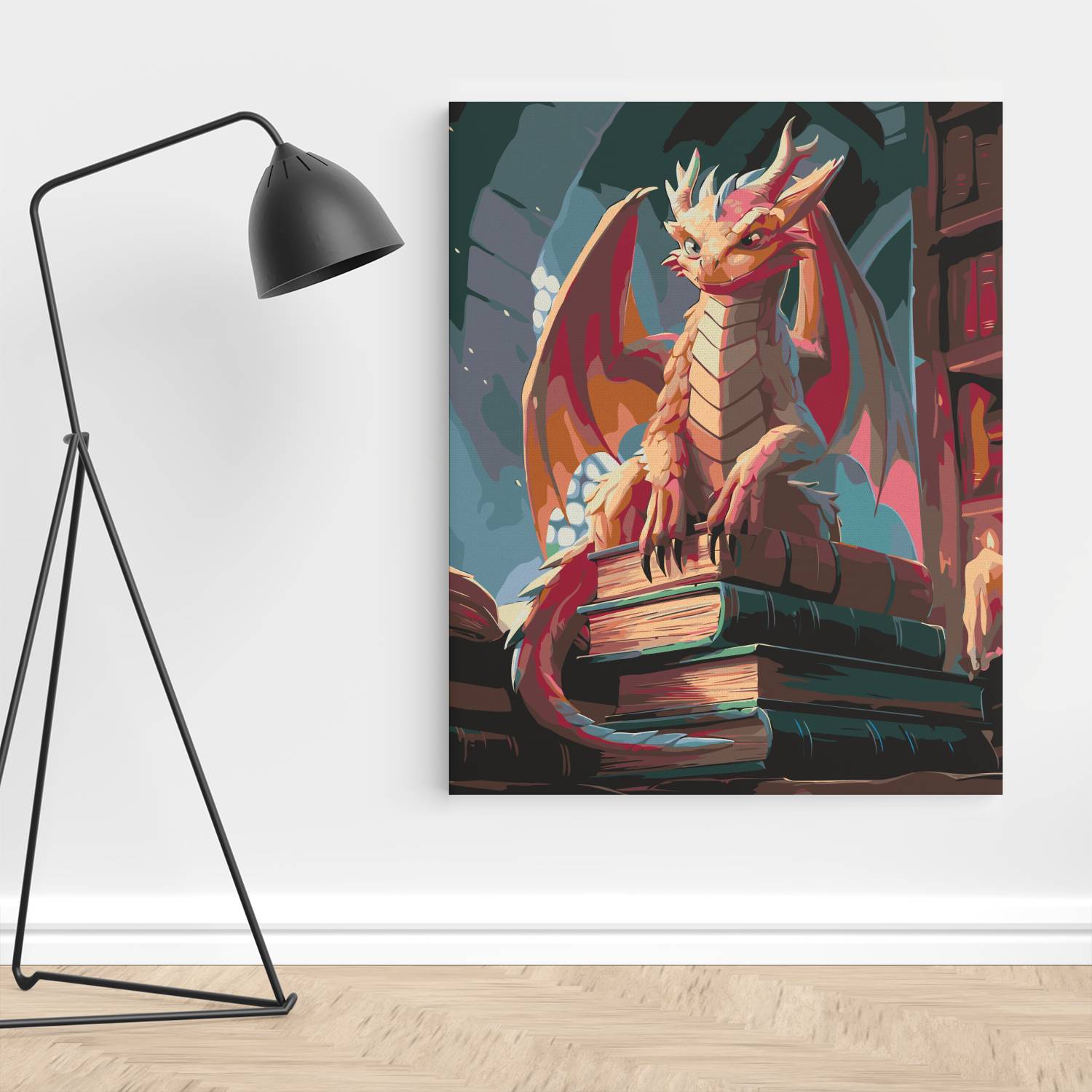 Zanurz się w baśniowy świat z obrazem po numerach „Mądry Smok Bibliotekarz”! Figlarny smok zasiadający dumnie na stosie starych tomów w magicznej bibliotece tworzy wyjątkową atmosferę tajemnicy i wiedzy. To idealna scena dla fanów smoków, fantastyki i książek. Malowanie po numerach to doskonały sposób na relaks i rozwój kreatywności, a gotowe dzieło z pewnością zachwyci wszystkich miłośników magicznych opowieści.