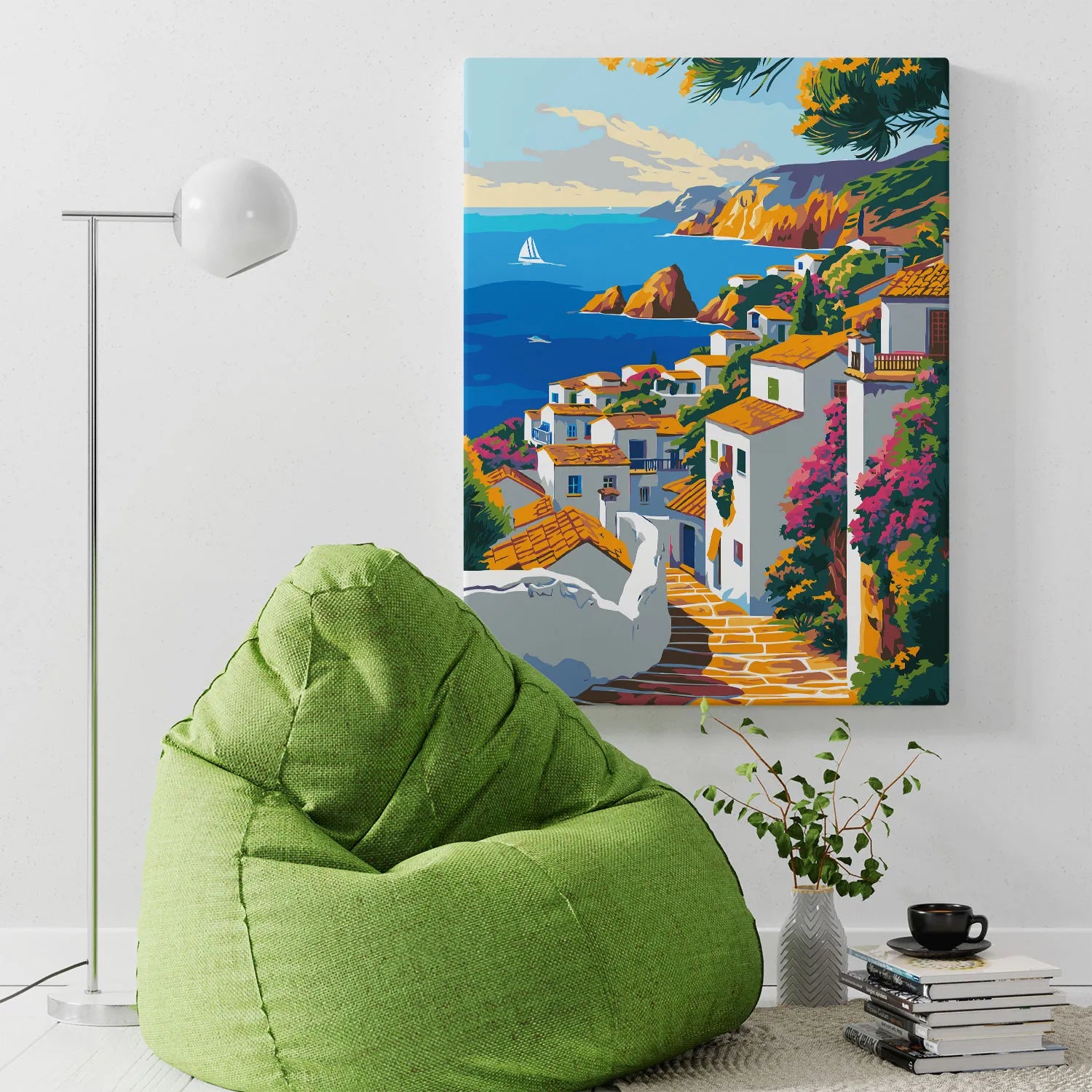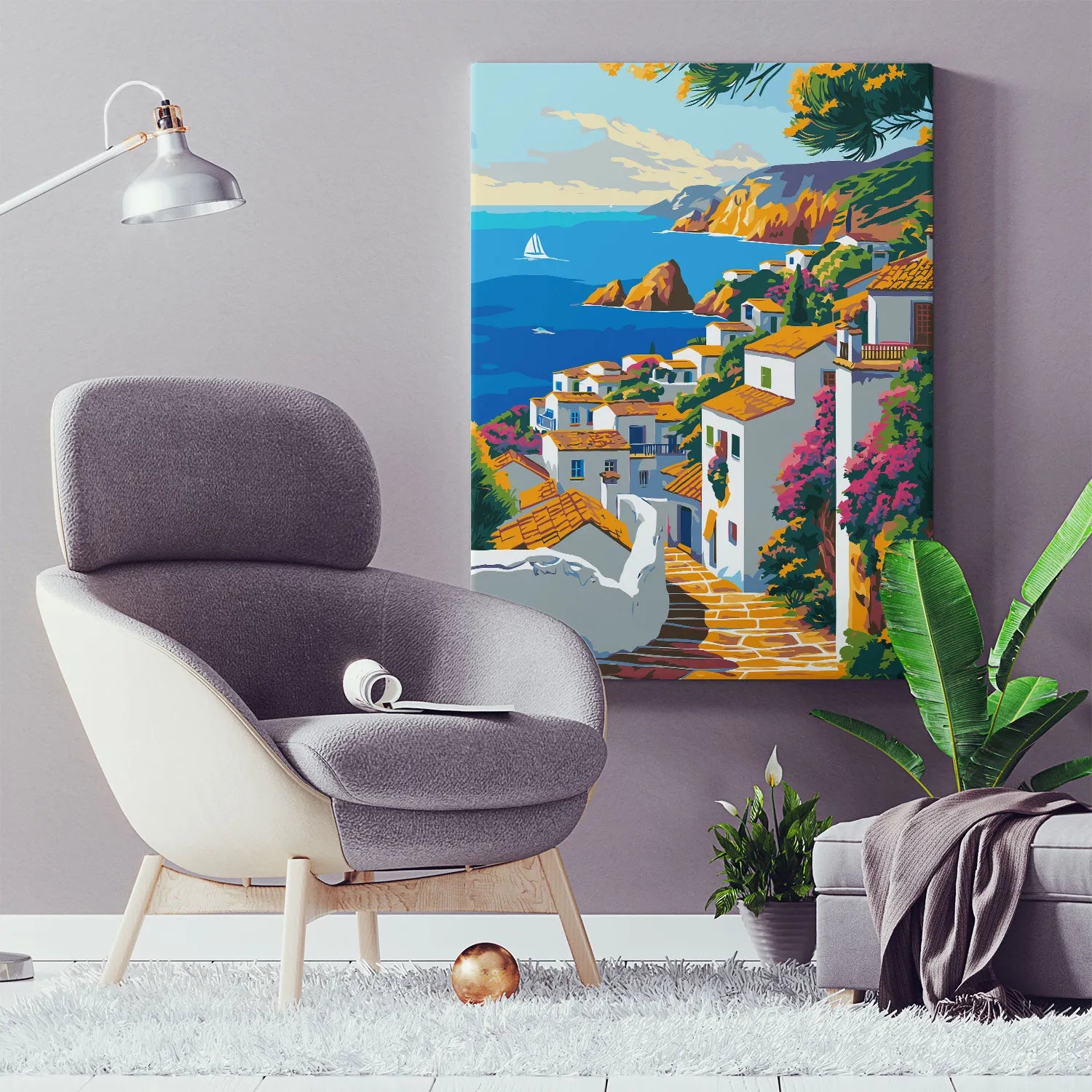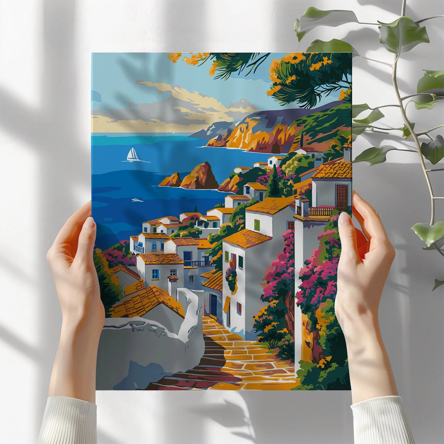 Poczuj ciepło południowego słońca z obrazem po numerach „Śródziemnomorska Wioska”! Białe domki z pomarańczowymi dachami, wąskie uliczki prowadzące do błękitnego morza i bujna roślinność tworzą niepowtarzalną atmosferę wakacyjnego relaksu. Intensywne kolory i piękna kompozycja sprawią, że ten obraz stanie się wyjątkową dekoracją wnętrza. Malowanie po numerach to doskonały sposób na odprężenie i rozwój kreatywności. Idealny wybór na prezent dla miłośników podróży i śródziemnomorskich krajobrazów.