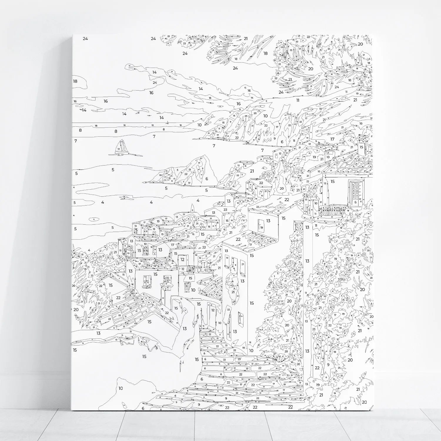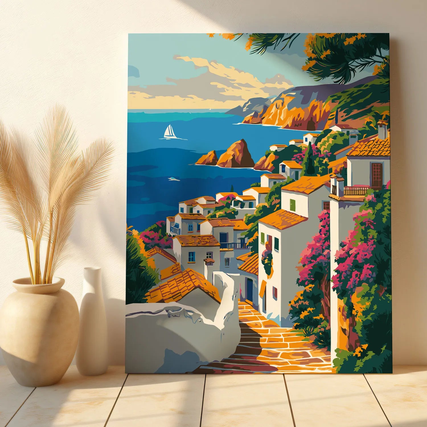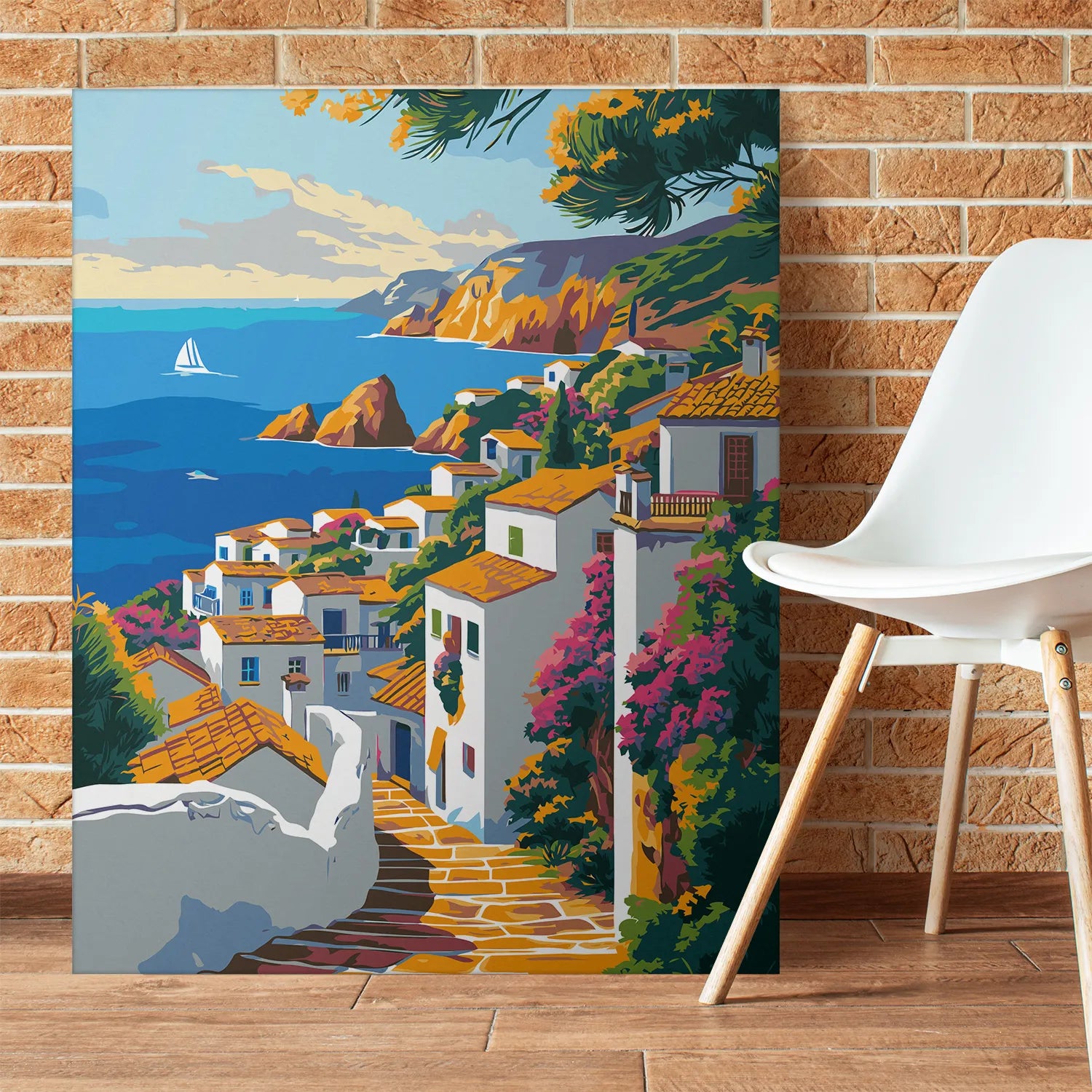 Poczuj ciepło południowego słońca z obrazem po numerach „Śródziemnomorska Wioska”! Białe domki z pomarańczowymi dachami, wąskie uliczki prowadzące do błękitnego morza i bujna roślinność tworzą niepowtarzalną atmosferę wakacyjnego relaksu. Intensywne kolory i piękna kompozycja sprawią, że ten obraz stanie się wyjątkową dekoracją wnętrza. Malowanie po numerach to doskonały sposób na odprężenie i rozwój kreatywności. Idealny wybór na prezent dla miłośników podróży i śródziemnomorskich krajobrazów.
