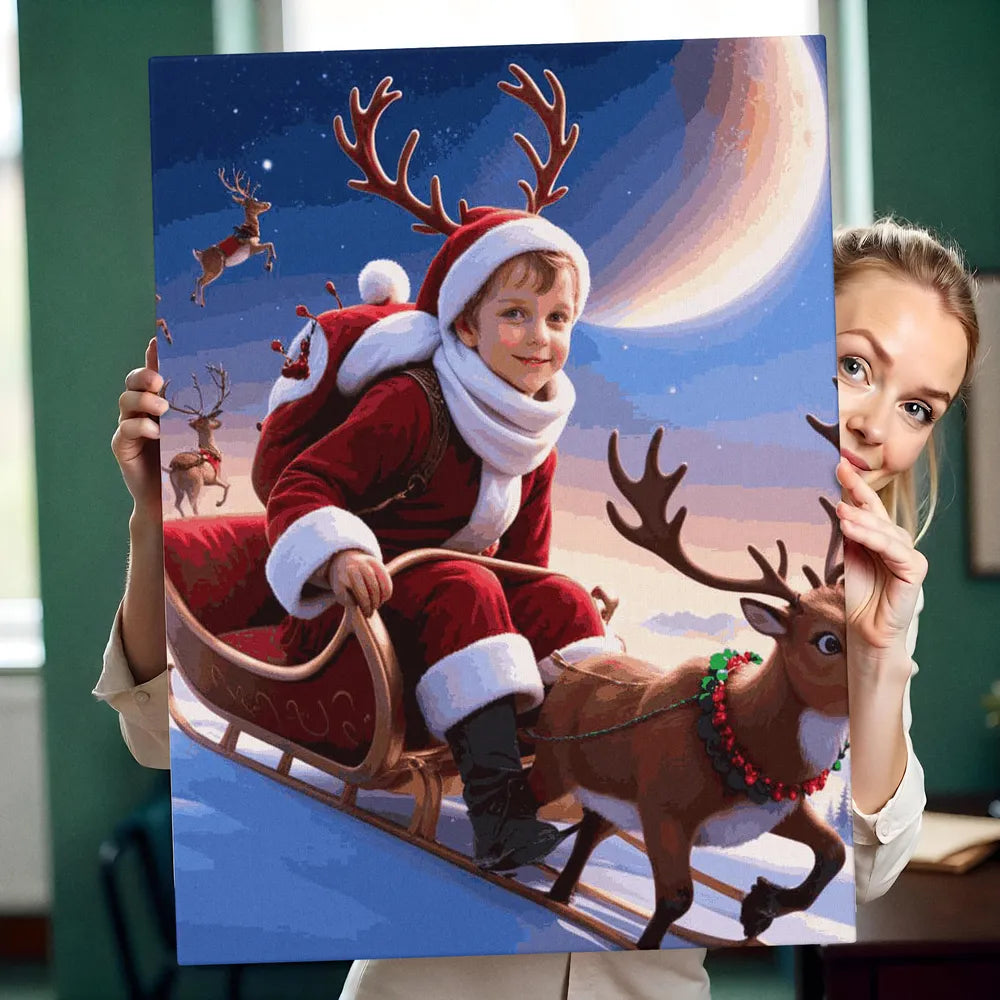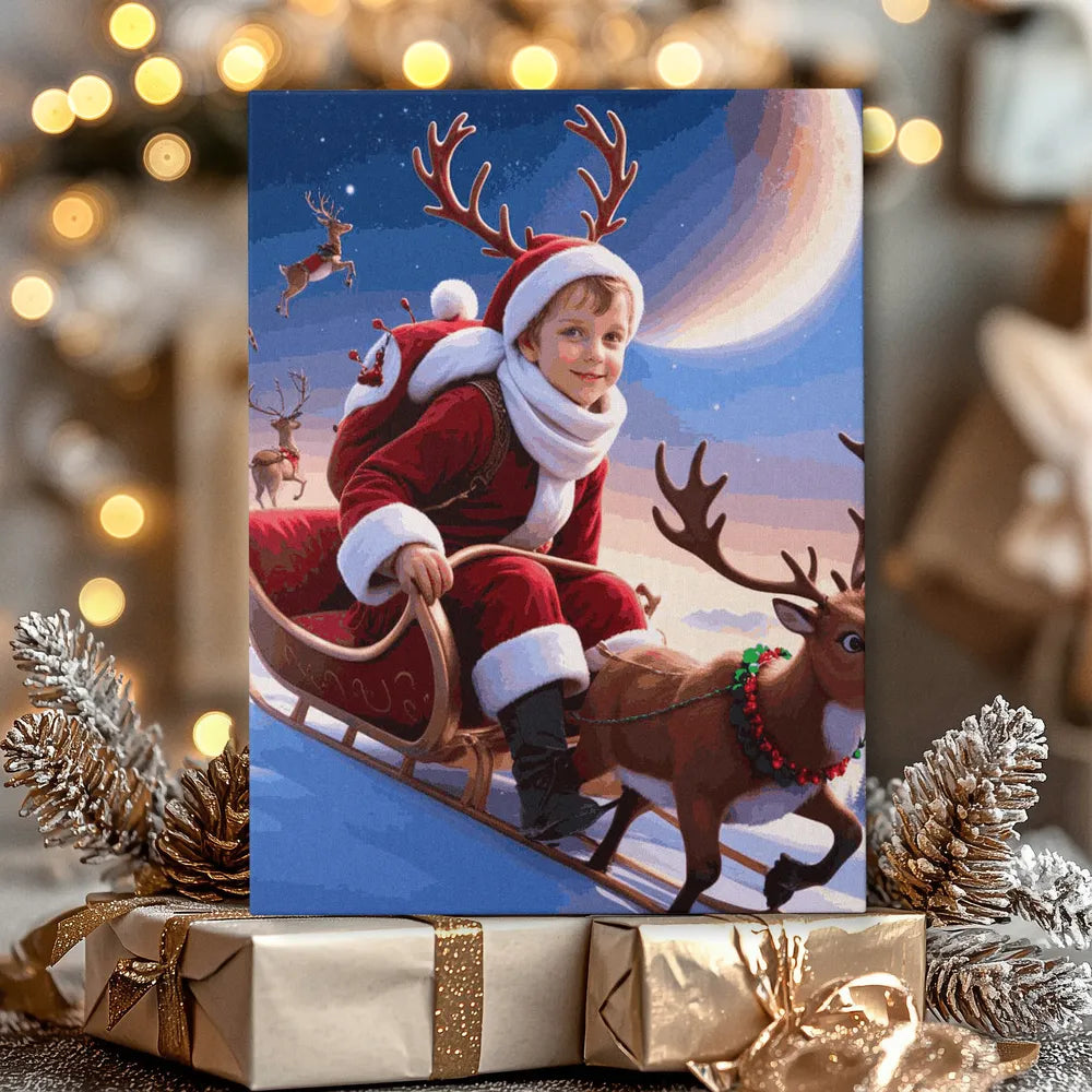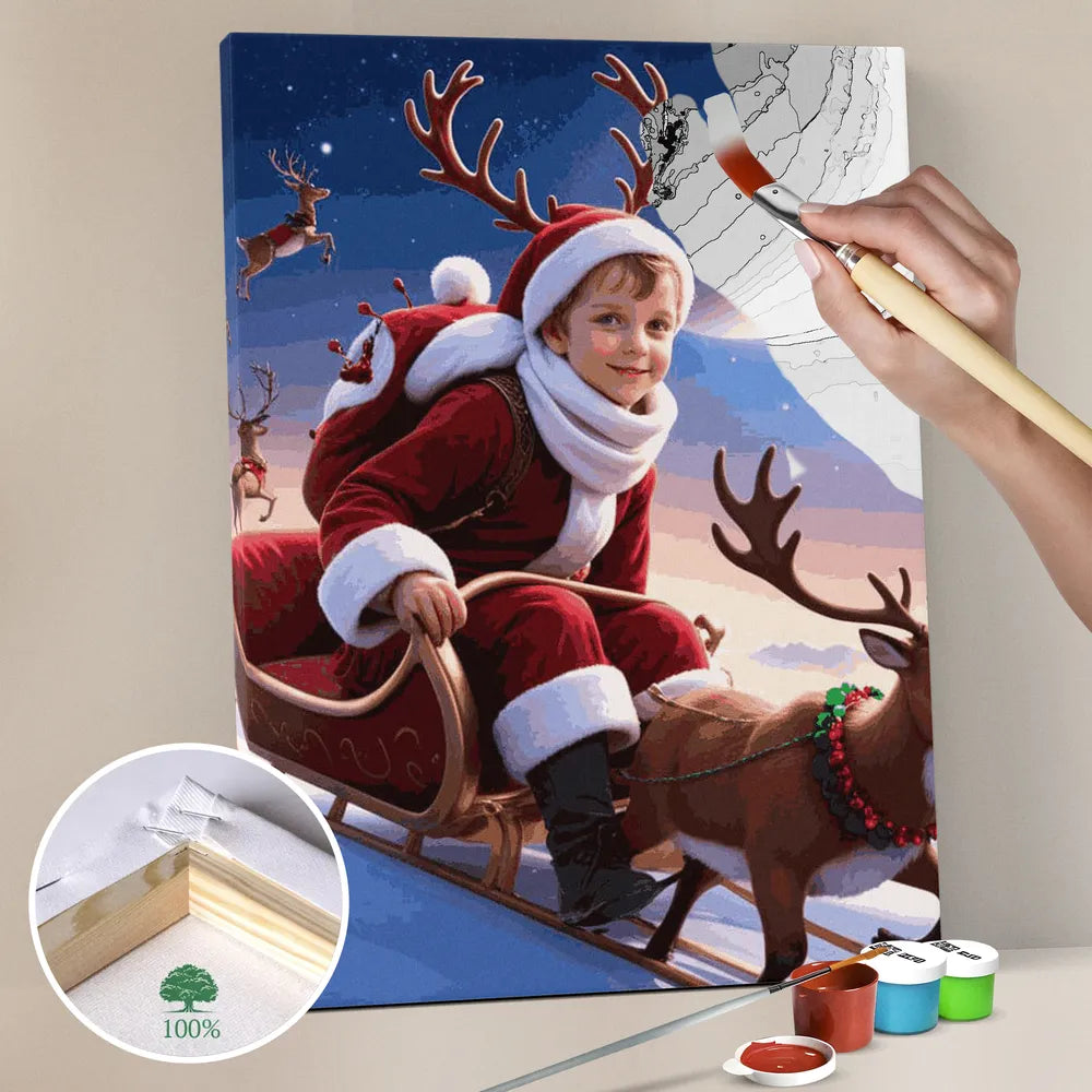 Zestaw do malowania po numerach „Magiczny kulig małego Mikołaja”.