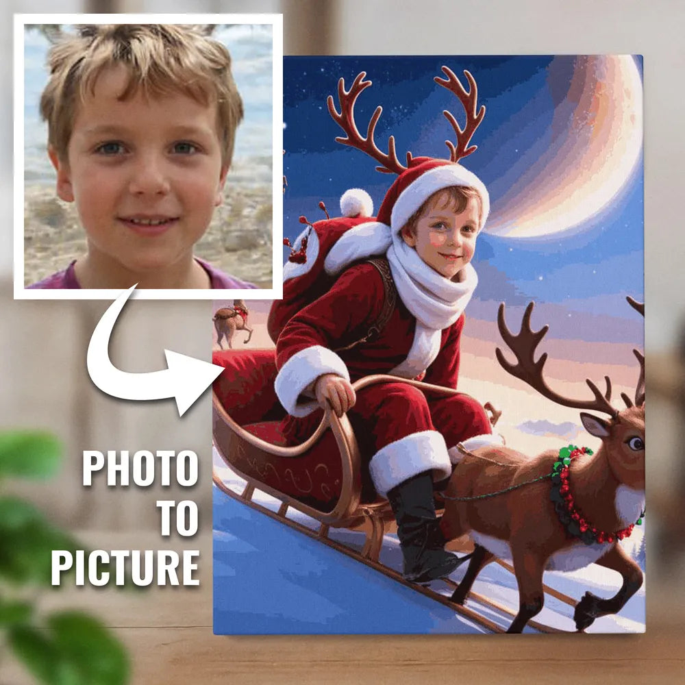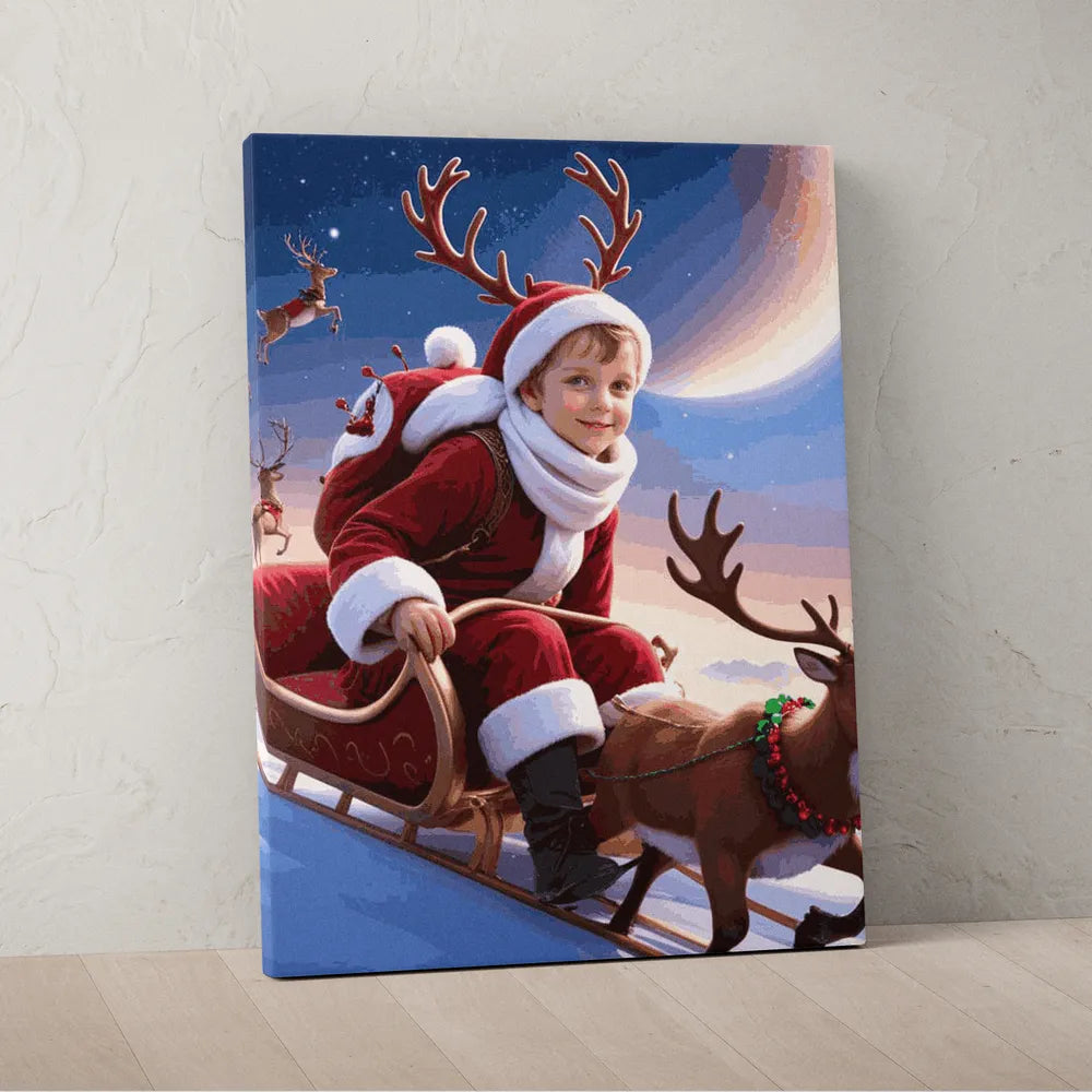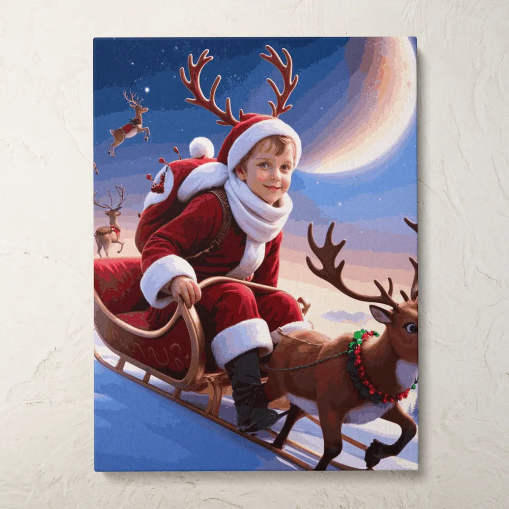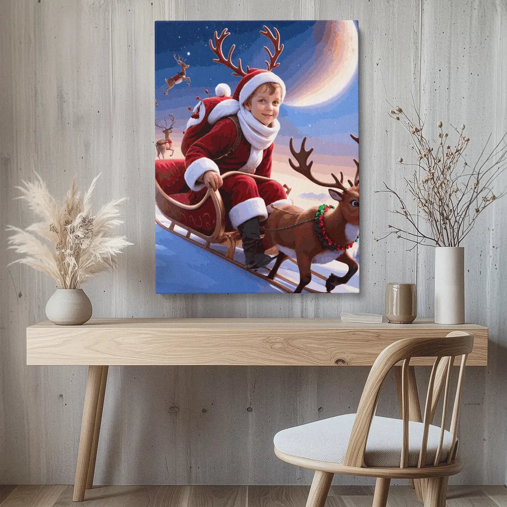 Zestaw do malowania po numerach „Magiczny kulig małego Mikołaja”.