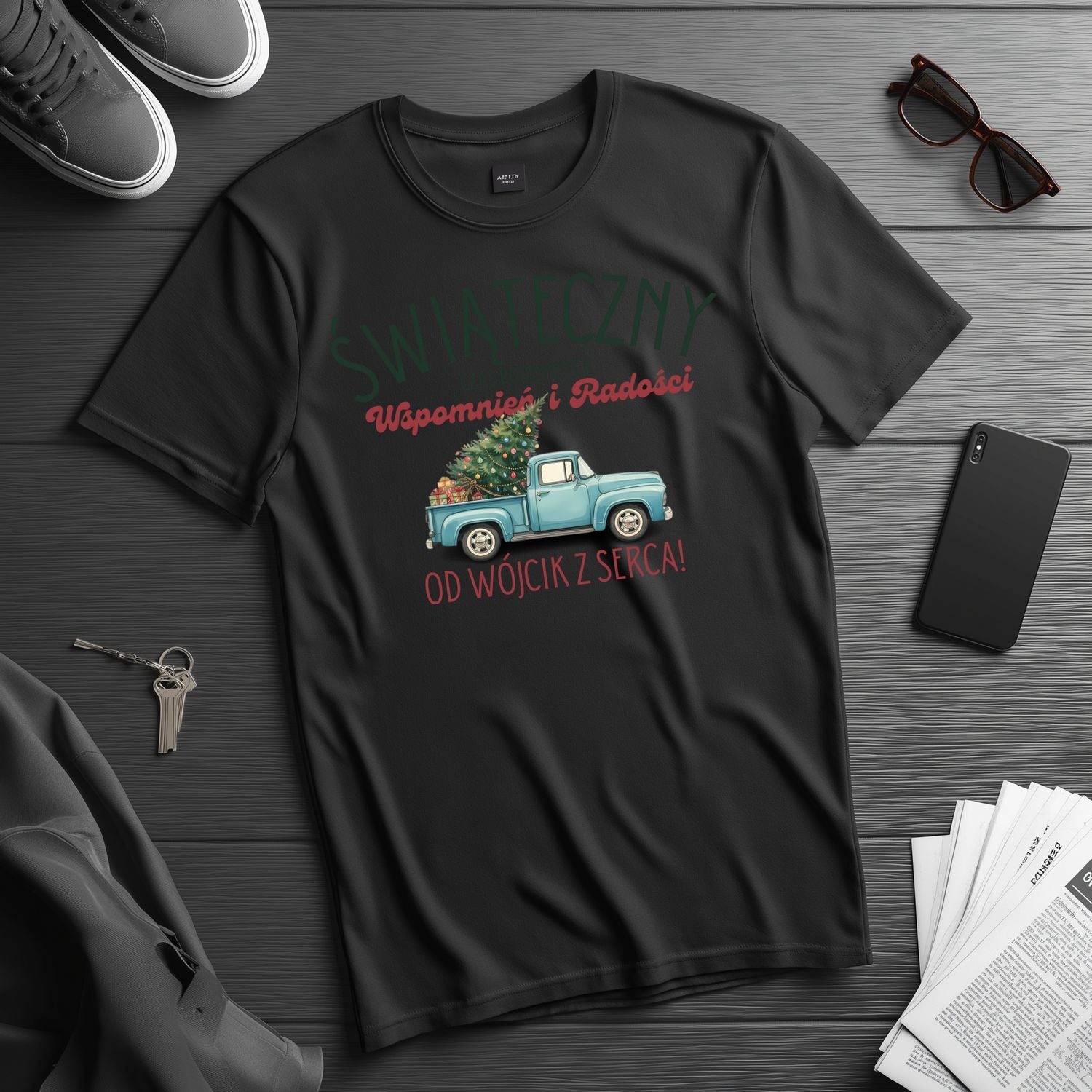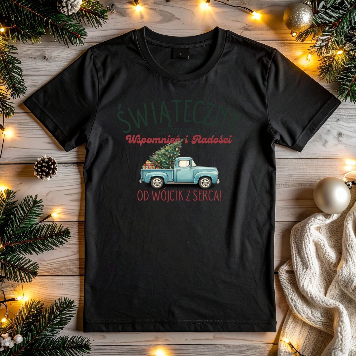 Stylowy nadruk z retro ciężarówką udekorowaną choinką przywołuje prawdziwego ducha świąt - ciepło, radość i domową atmosferę. Idealna do noszenia podczas spotkań rodzinnych, wigilii, świątecznych zdjęć lub prezentów pod choinkę.