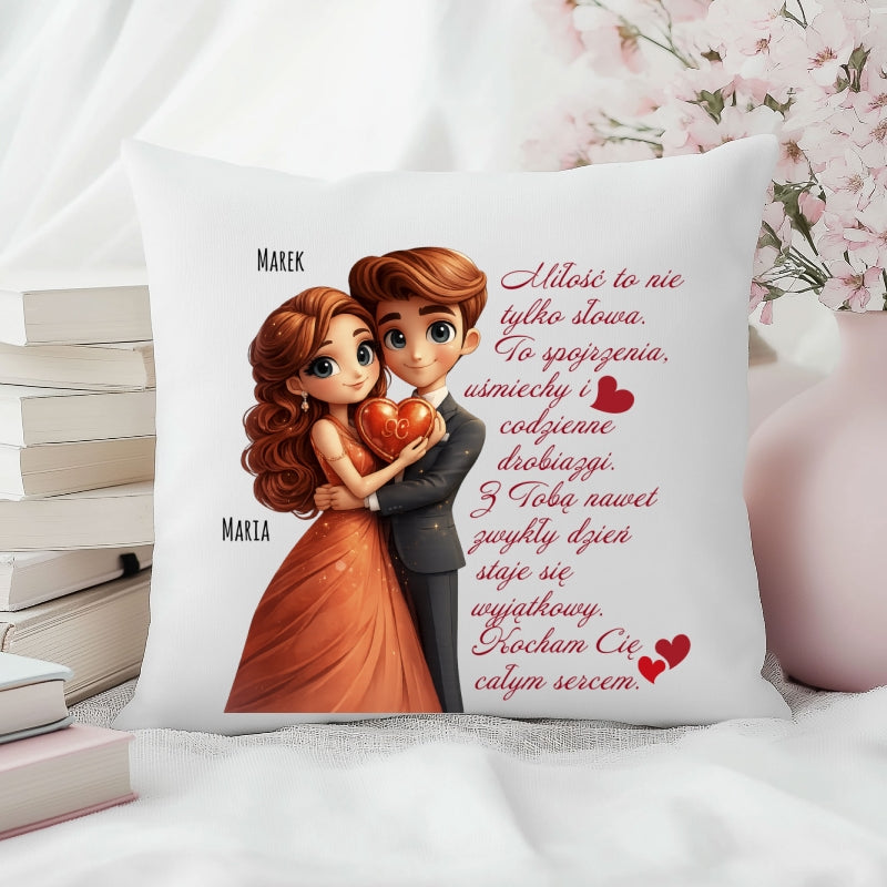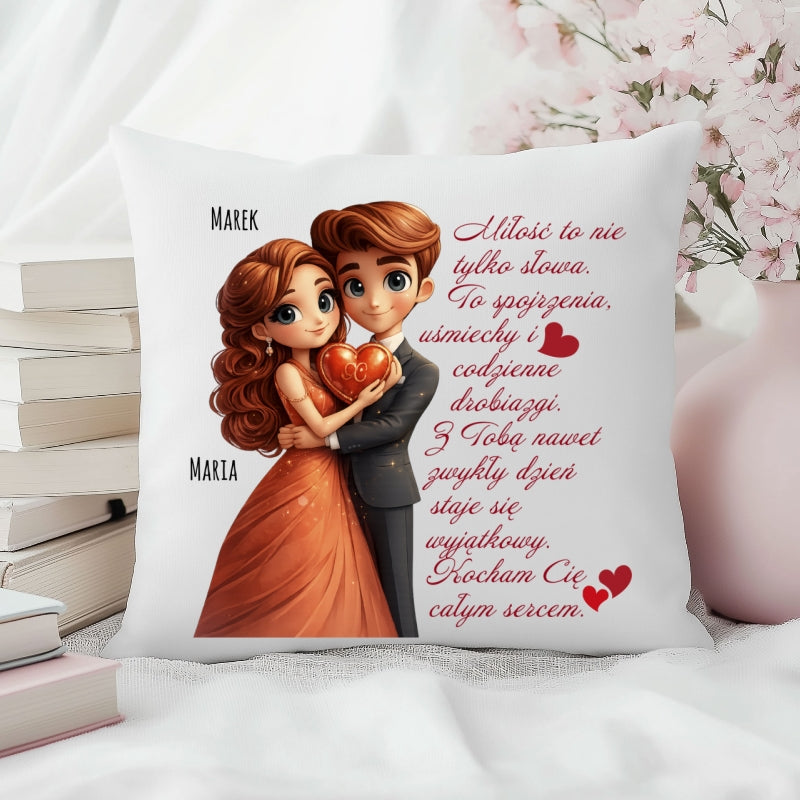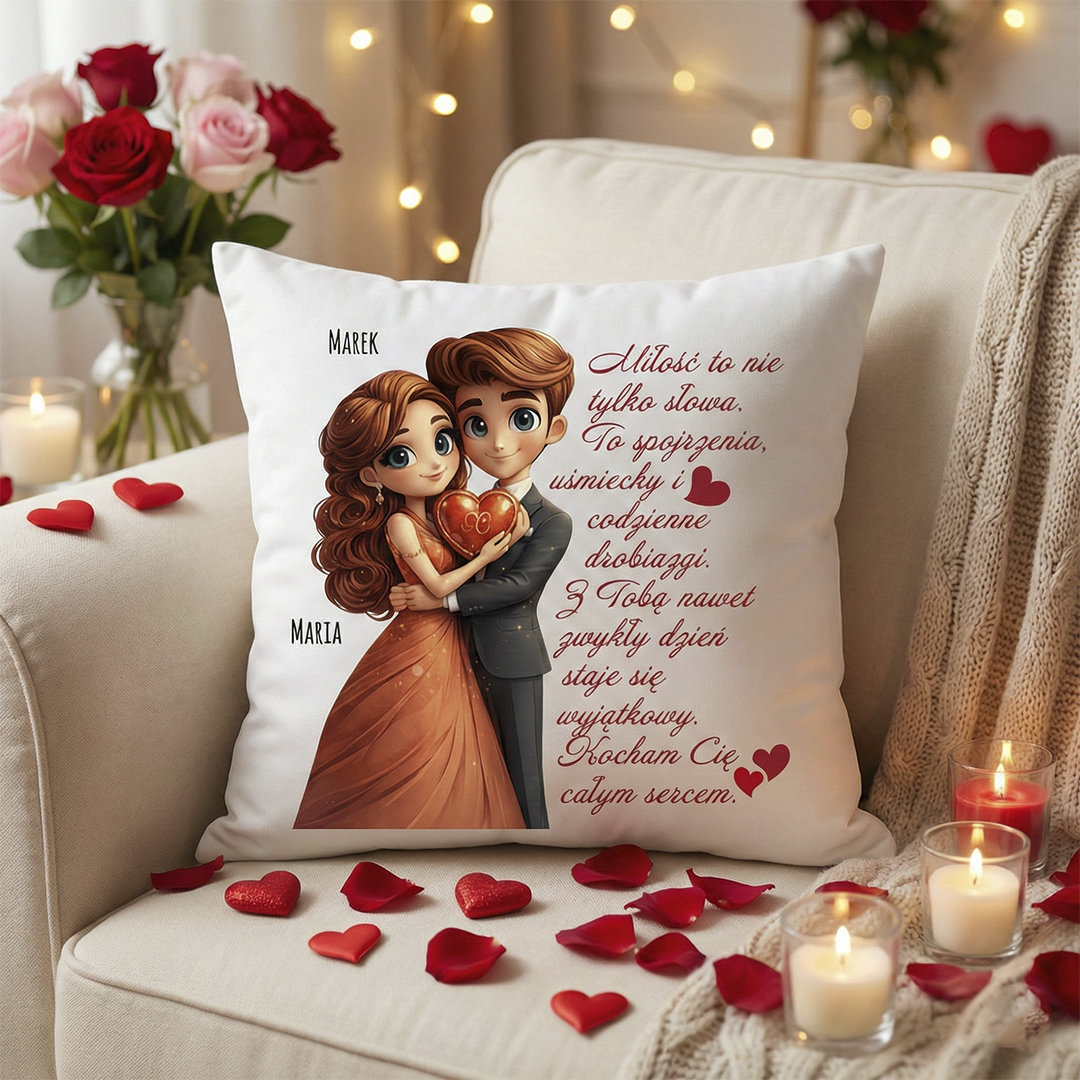 Całość dopełnia personalizacja Waszymi imionami. To sprawia, że poduszka przestaje być zwykłym przedmiotem, a staje się osobistym symbolem Waszej więzi, bliskości i uczucia, które łączy Was każdego dnia.
