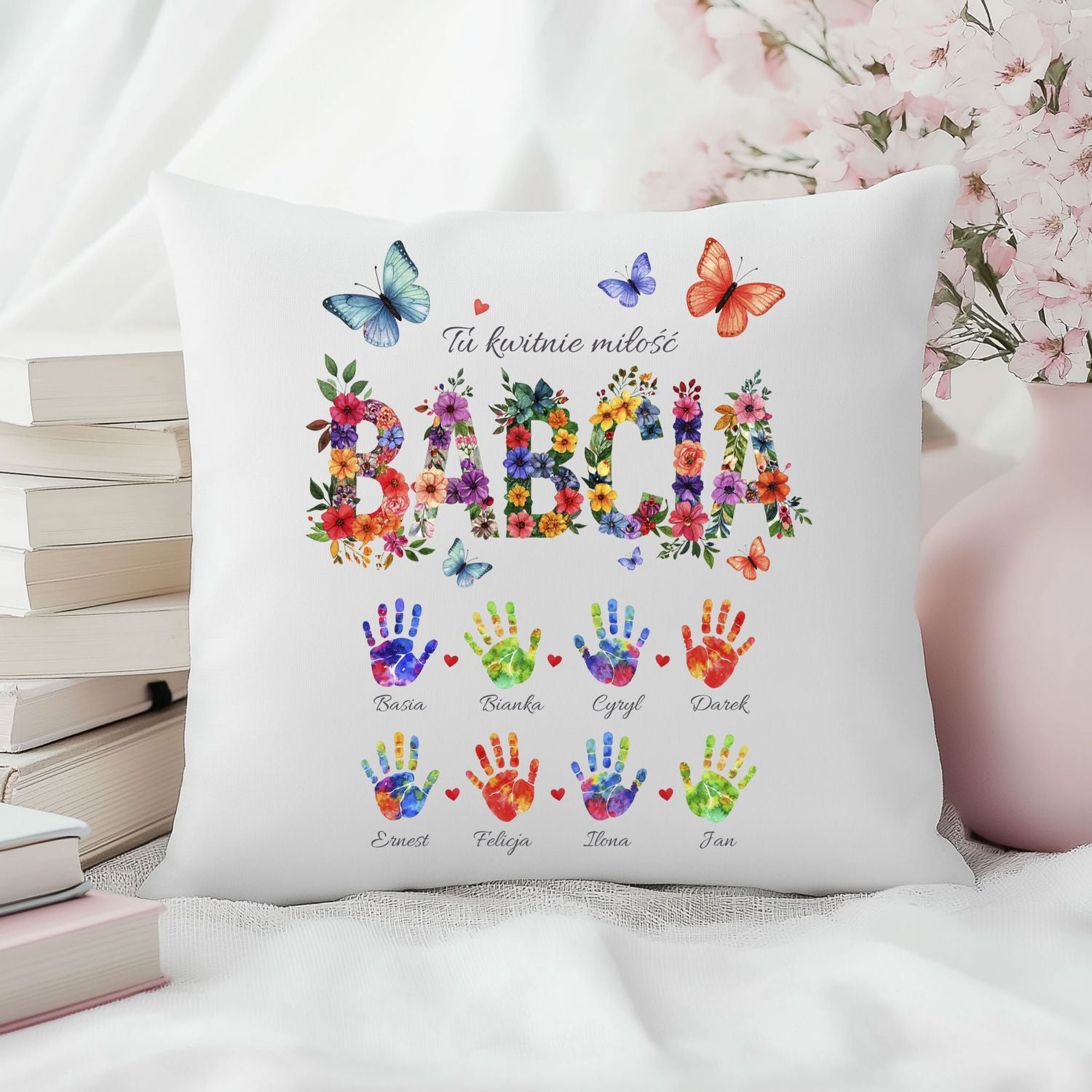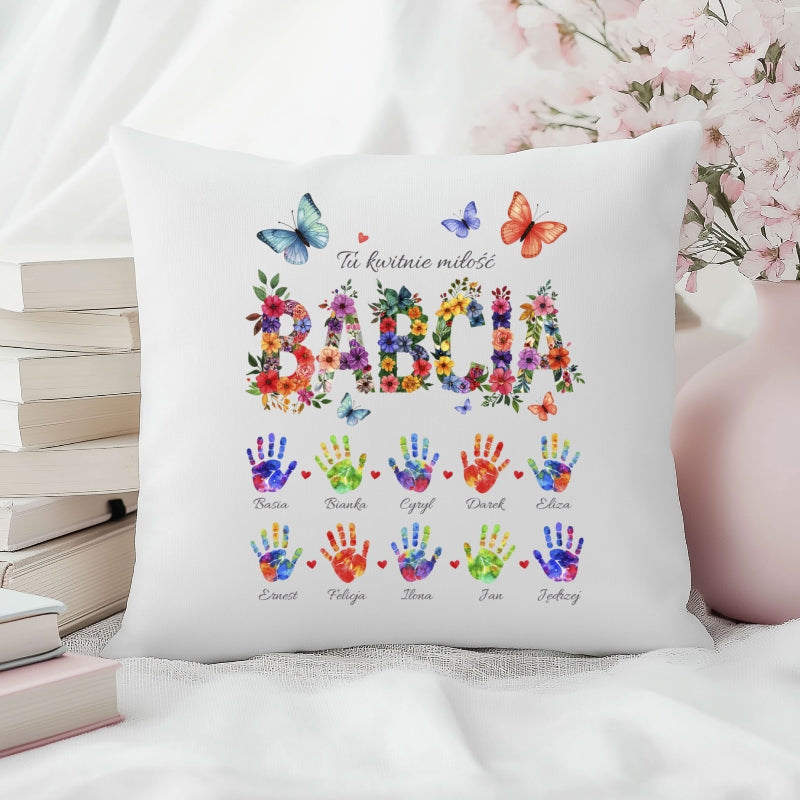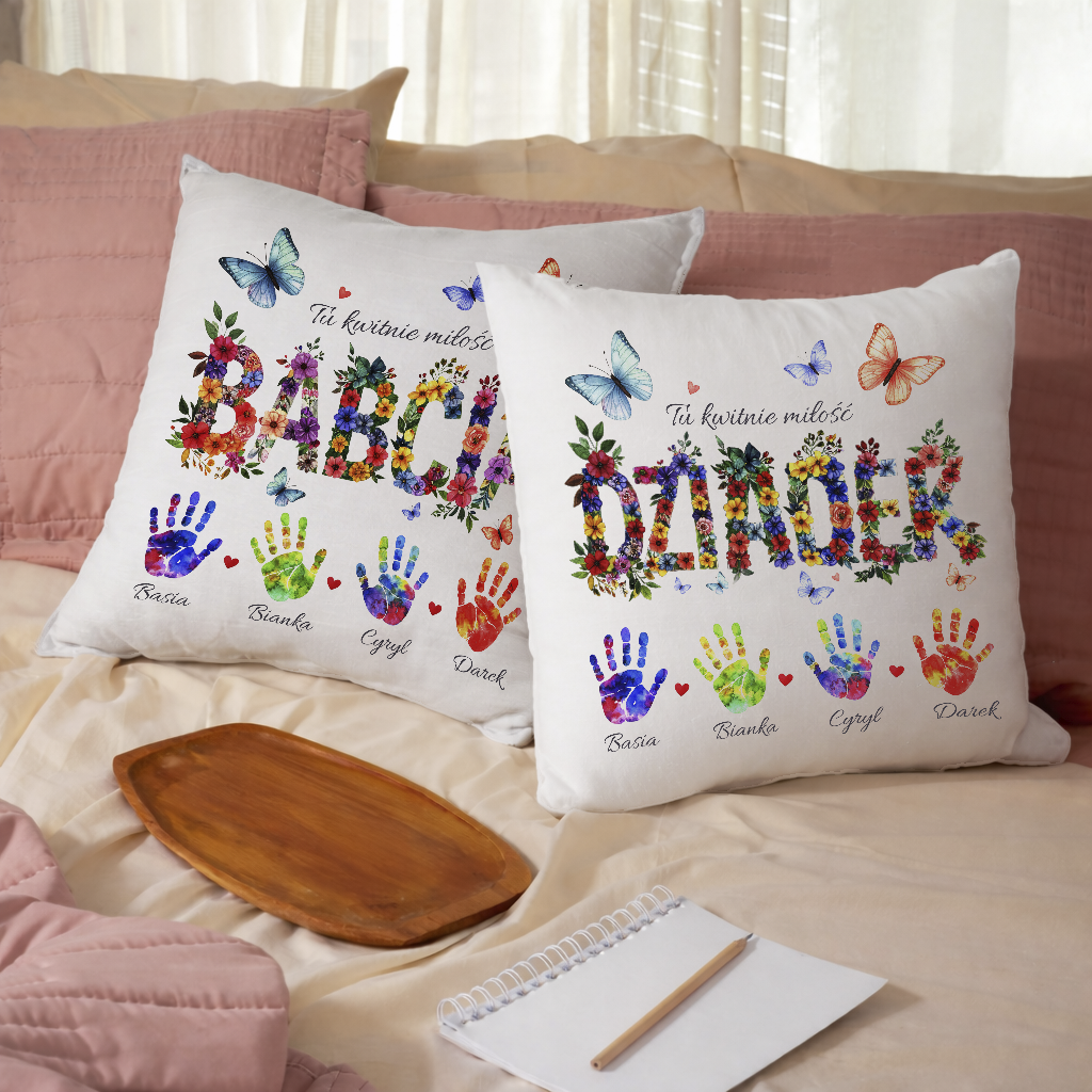 Centralnym elementem poduszki jest kolorowy, kwiatowy napis „BABCIA” lub „DZIADEK”, symbolizujący troskę, bliskość i rodzinne ciepło. Całość dopełniają kolorowe odciski dłoni z imionami bliskich, które tworzą jedyną w swoim rodzaju pamiątkę rodzinną - pełną miłości i dumy.