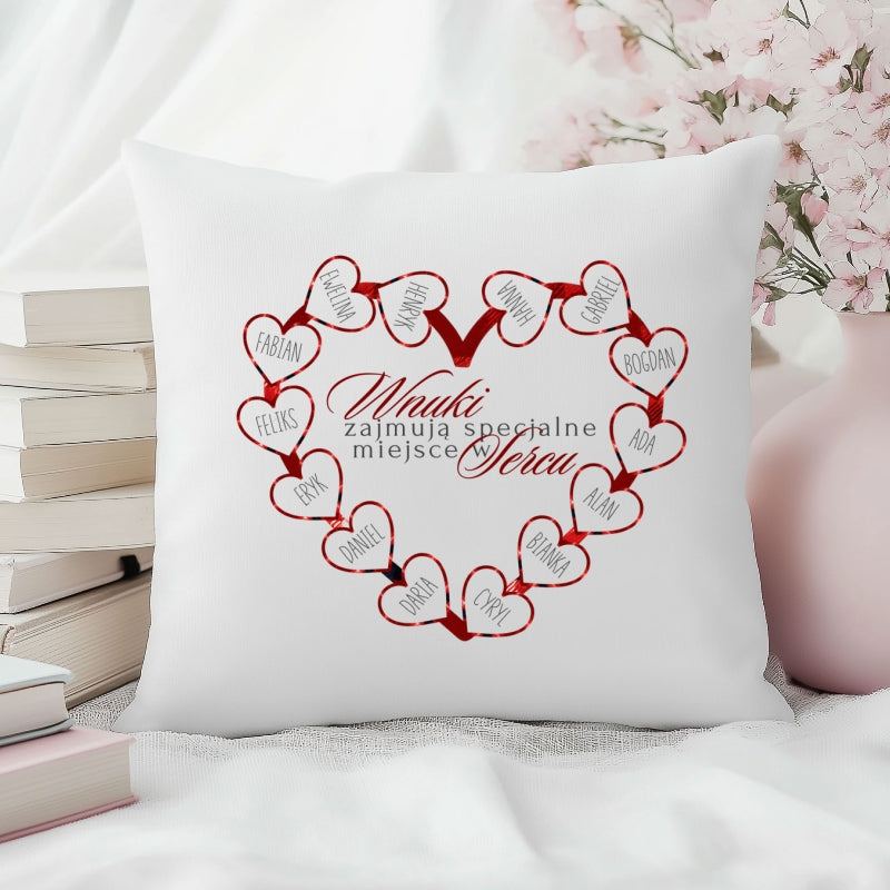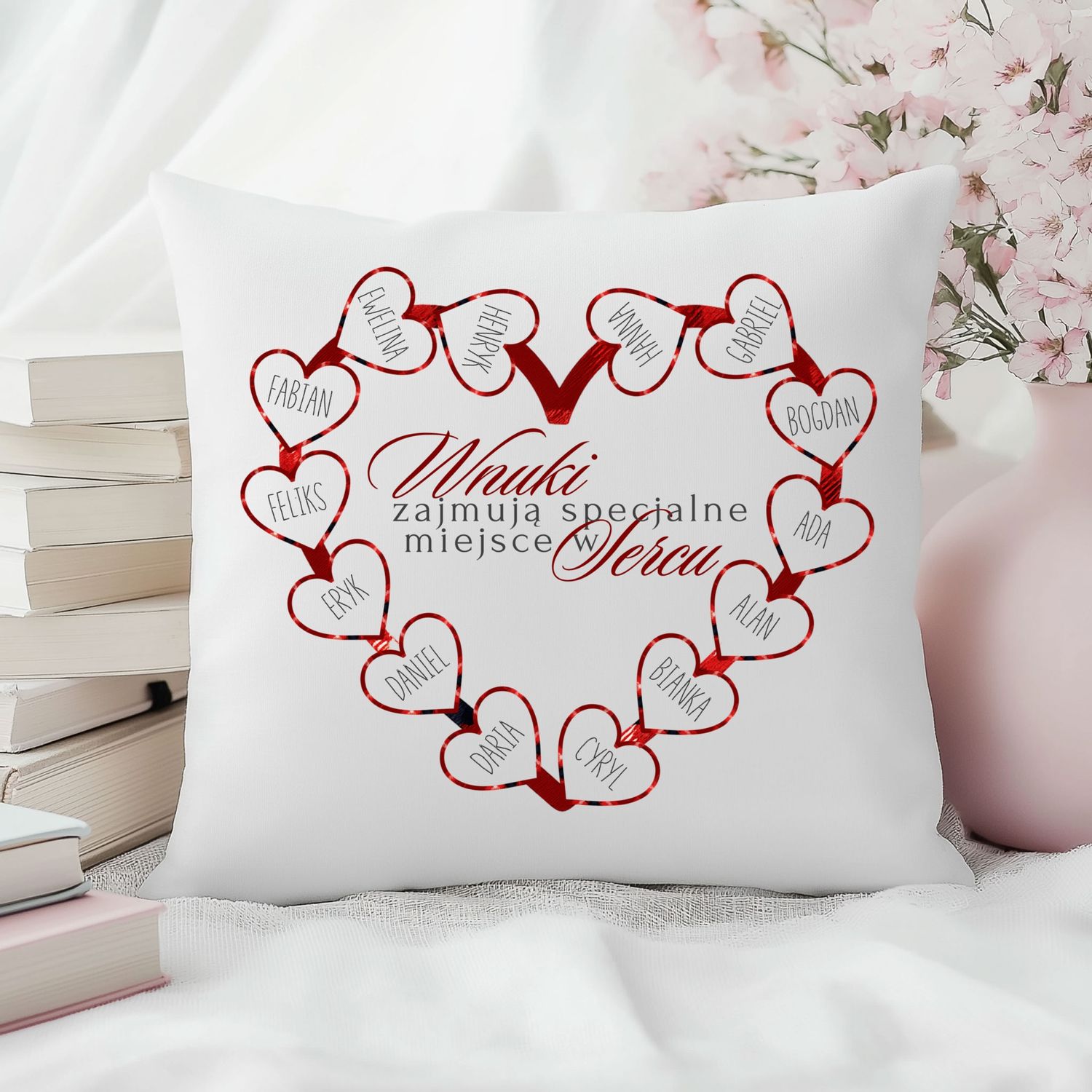 Elegancki motyw serca z imionami wnuków sprawia, że każda poduszka staje się niepowtarzalną pamiątką - idealną na Święta, Dzień Babci i Dziadka, rocznicę lub po prostu jako piękny gest wdzięczności.