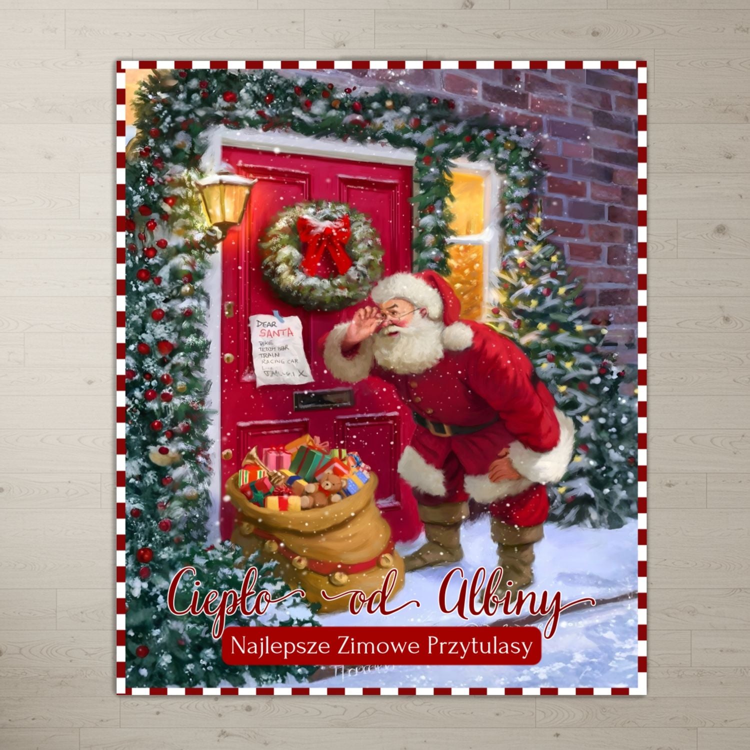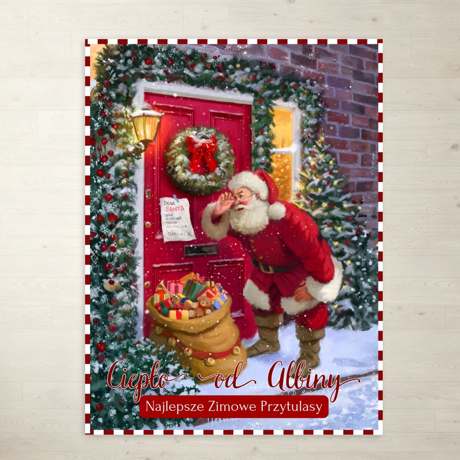 Ten wyjątkowy, ciepły koc z uroczym Świętym Mikołajem przed świątecznymi drzwiami to prawdziwa esencja Bożego Narodzenia - ciepło, miłość i uśmiech zamknięte w miękkim materiale.