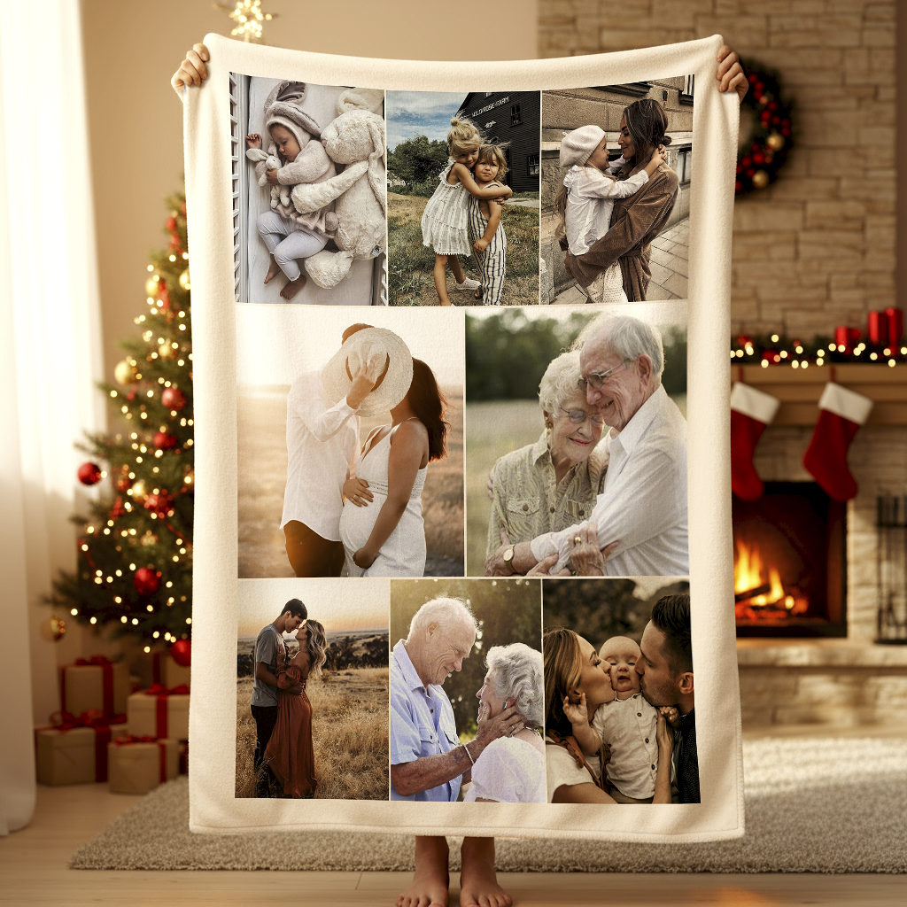Ten personalizowany koc ze zdjęciami to niezwykły sposób, aby zatrzymać w jednym miejscu wszystkie najpiękniejsze chwile - od pierwszych kroków dziecka, po rodzinne uściski, ślub, wspólne podróże czy momenty pełne wzruszeń.