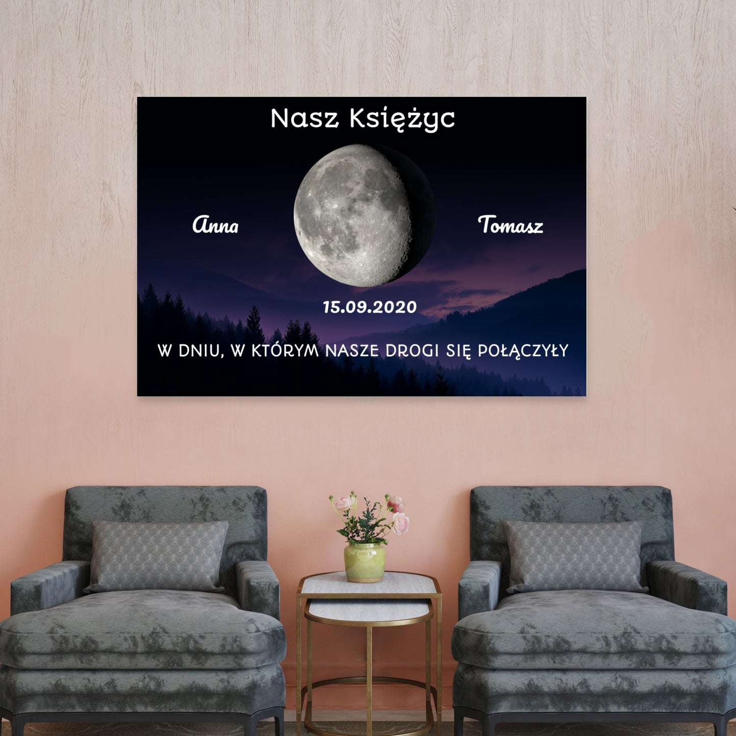 Uwiecznij magiczny moment Waszego życia na wyjątkowym, personalizowanym obrazie z Księżycem! „Nasz Księżyc” to romantyczny fotoprezent przedstawiający fazę księżyca z wybranego przez Ciebie dnia – na przykład daty, w której się poznaliście, zaręczyliście lub powiedzieliście sobie „tak”.