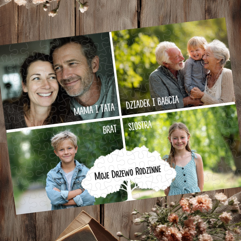 Na puzzlu umieścisz aż cztery własne zdjęcia, przedstawiające członków rodziny, przyjaciół lub ukochane momenty z życia. W centralnej części widnieje grafika w kształcie drzewa i napis „Moje Drzewo Rodzinne”, który podkreśla emocjonalny charakter tej pamiątki.
