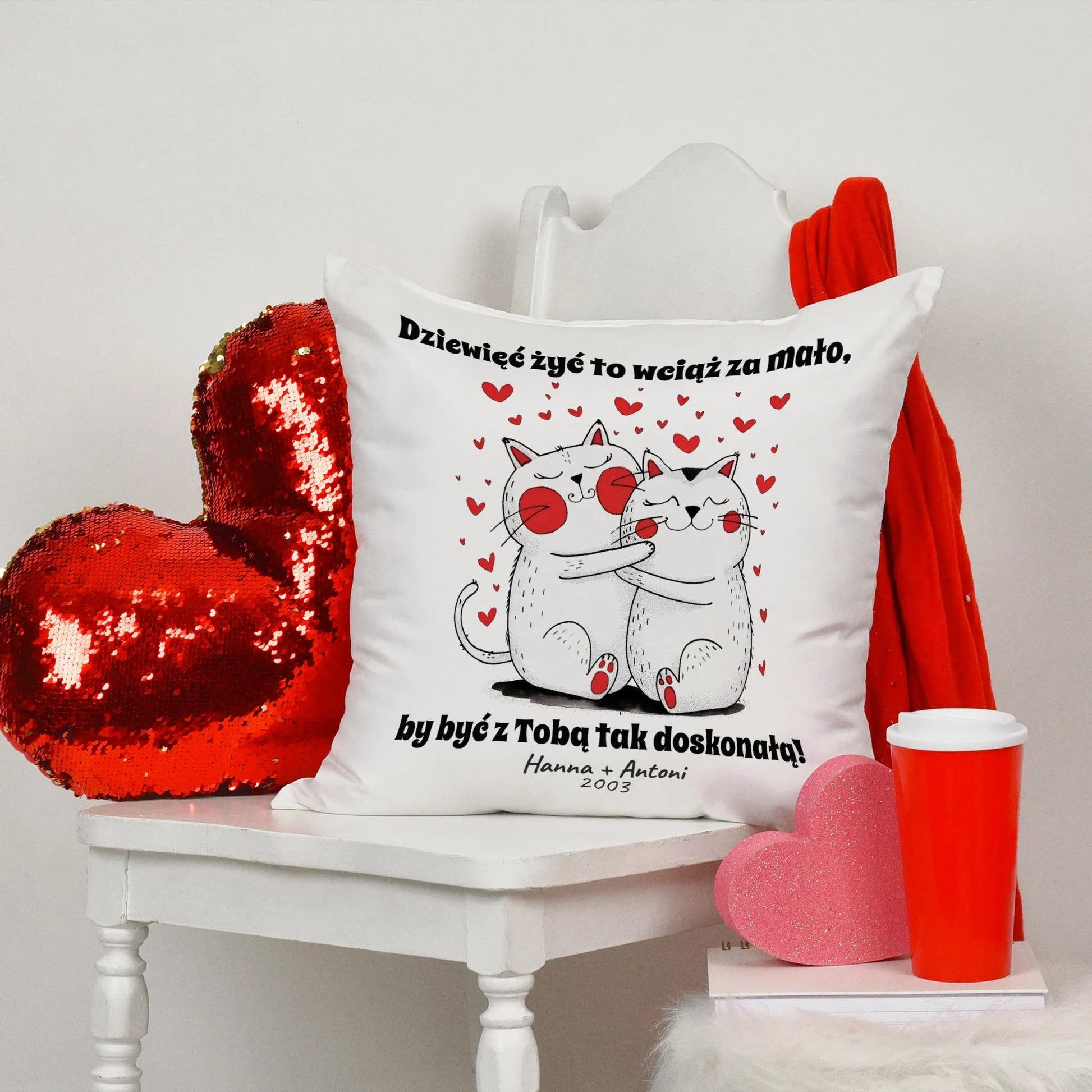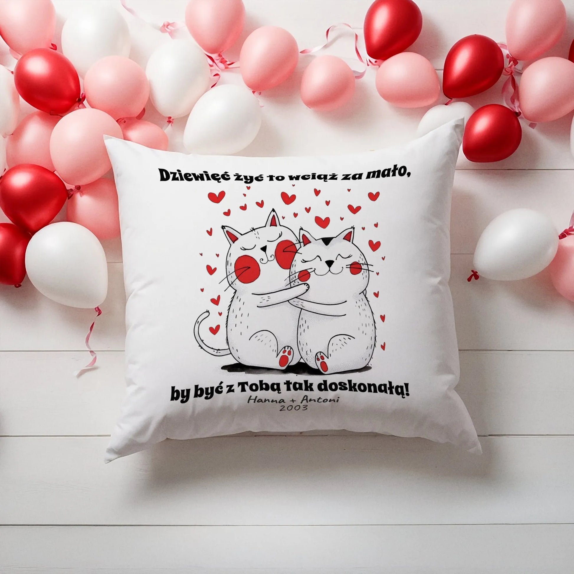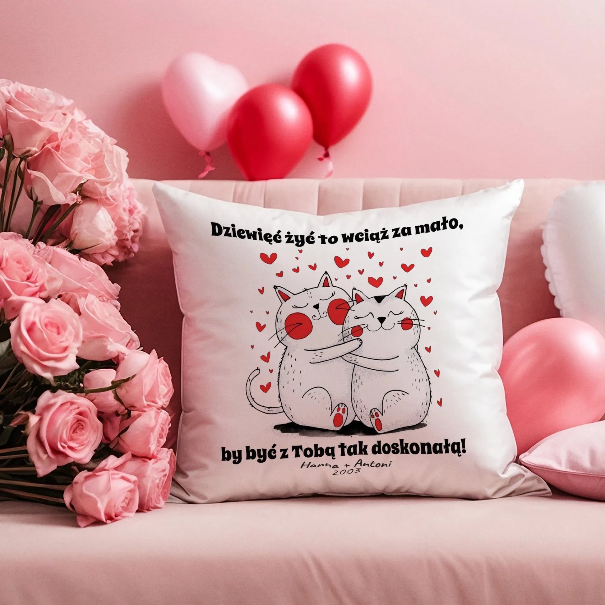 Wyjątkowa poduszka z napisem „Dziewięć żyć to wciąż za mało, by być z Tobą tak doskonałą!” to idealny prezent na Walentynki. Miękka, stylowa i pełna miłości, doskonale ozdobi każde wnętrze. Podaruj ukochanej osobie coś, co codziennie przypomni o Waszej niezwykłej więzi i doda romantycznego uroku w domu. Stwórzcie wspólne chwile pełne ciepła!