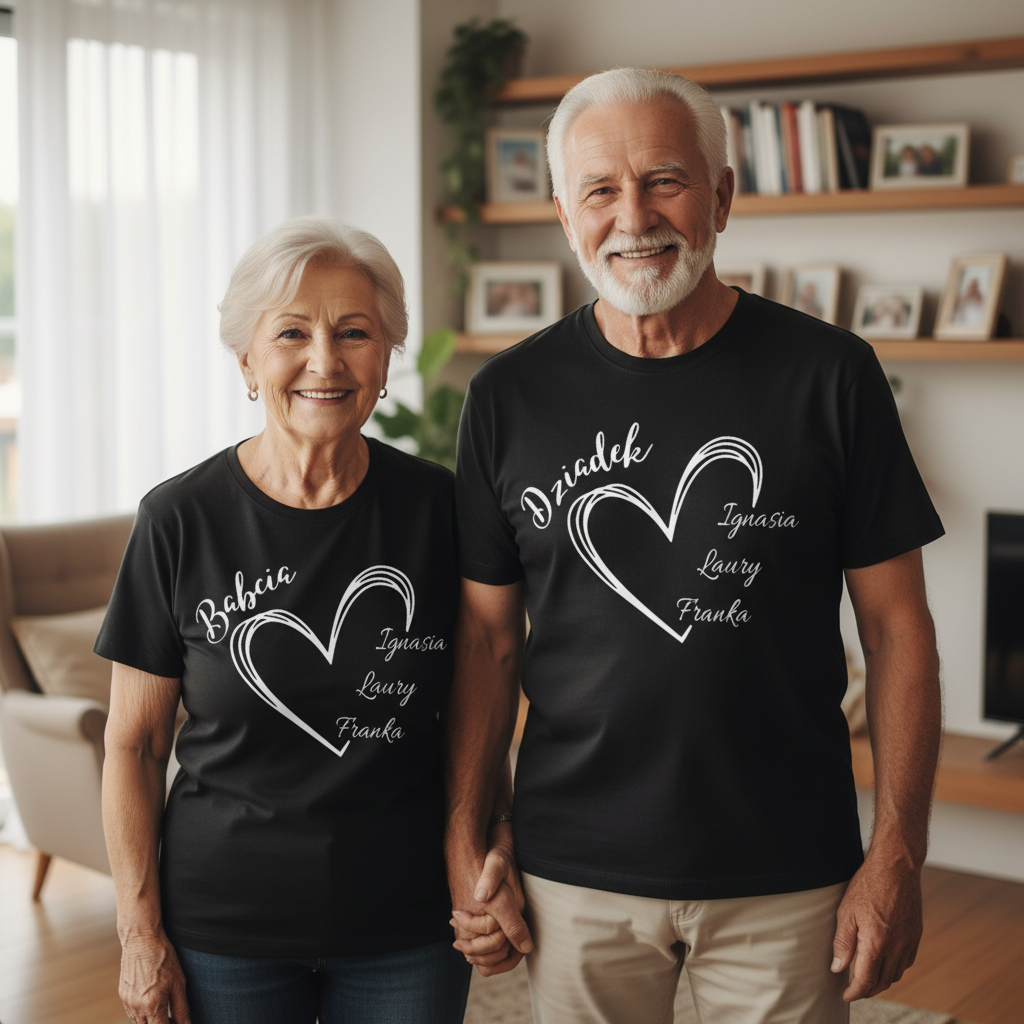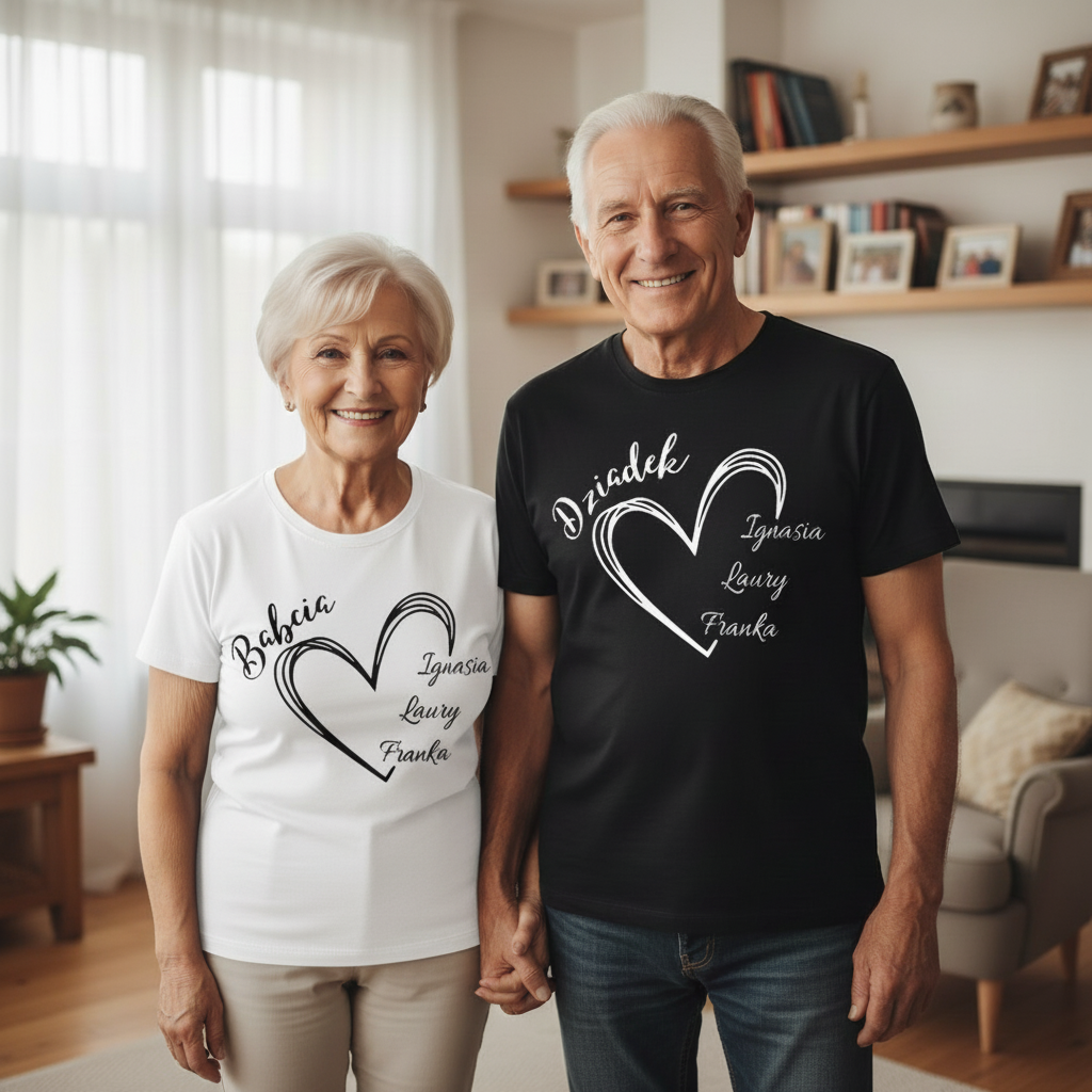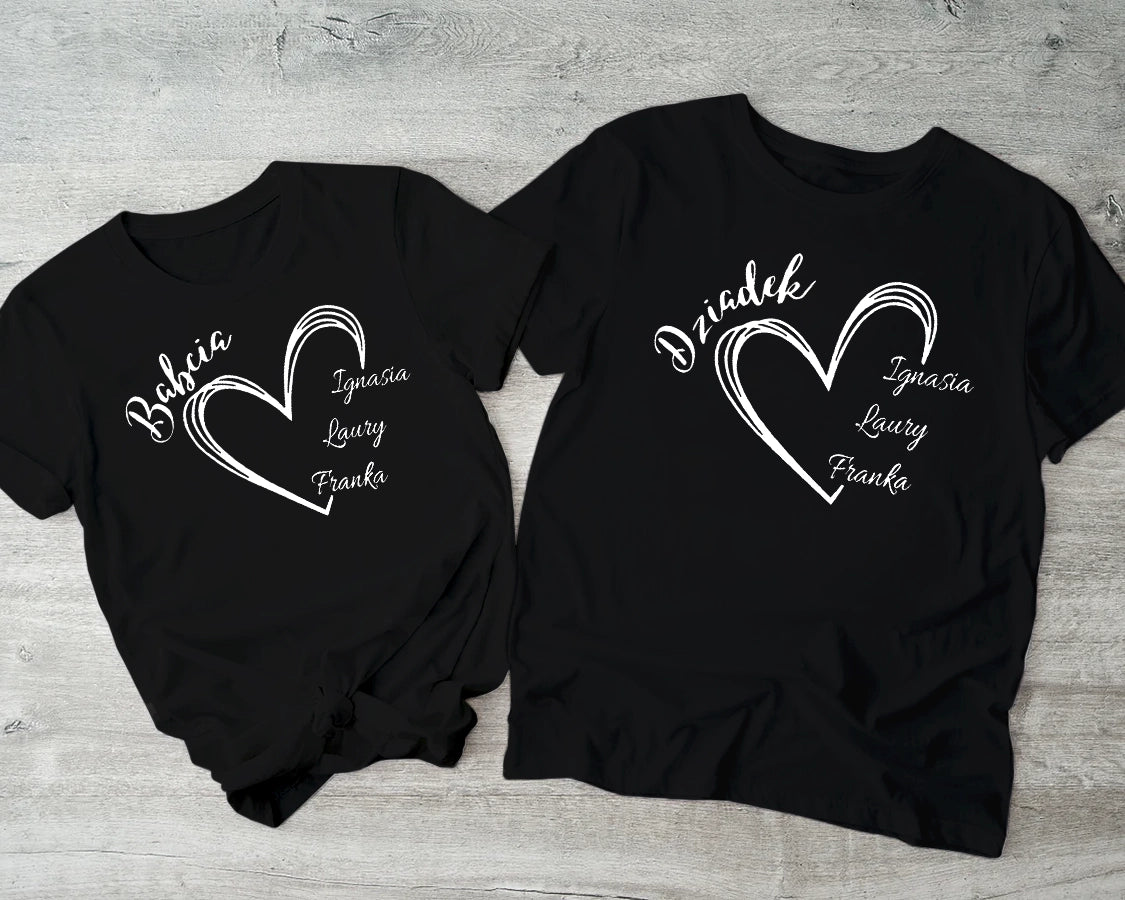 koszulek dla Babci i Dziadka z imionami wnuków w serduszkach. Świetny, nietuzinkowy pomysł na prezent dla kochanych Dziadków z okazji ich święta 21 oraz 22 stycznia.