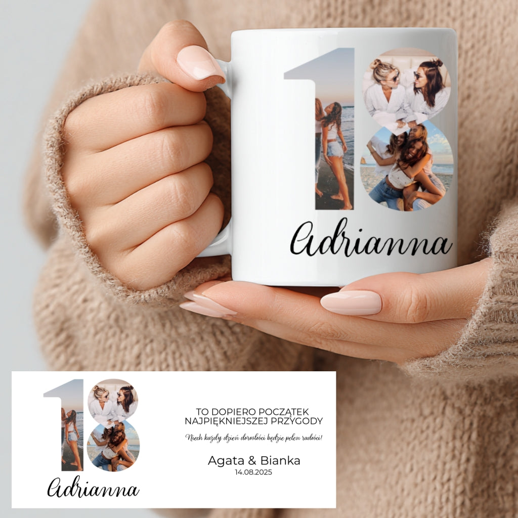 Kubek z dużą liczbą „18”, w której umieszczasz swoje ulubione zdjęcia, staje się niezapomnianą pamiątką pełną emocji i wspomnień. Możesz dodać imię jubilata, datę oraz krótką dedykację, tworząc prezent jedyny w swoim rodzaju.