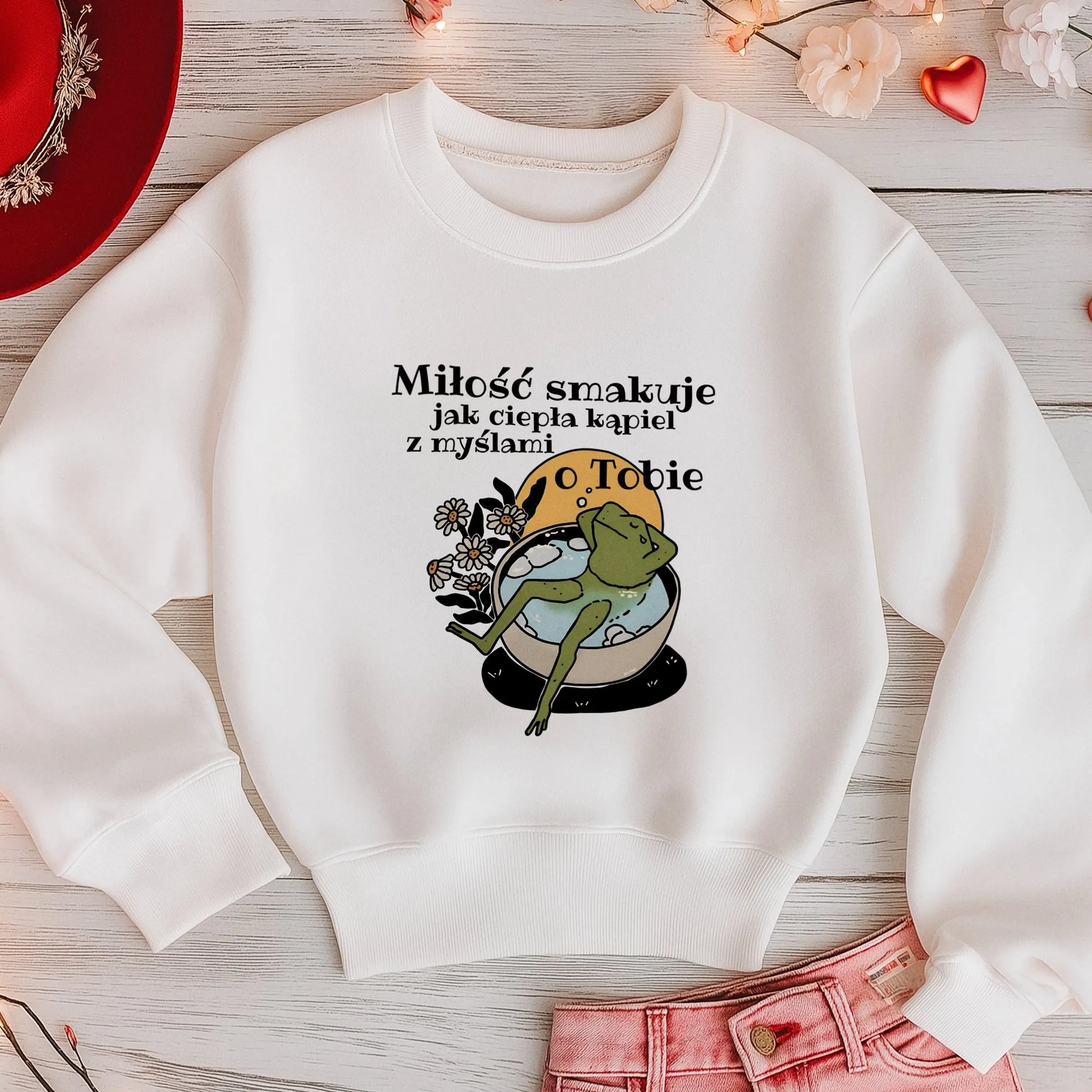 Sweterek „Miłość smakuje jak ciepła kąpiel z myślami o Tobie” to idealny prezent na Walentynki dla ukochanej osoby. Jego romantyczny napis i przyjemny materiał sprawią, że każda chwila w tym sweterku będzie pełna ciepła i miłości. To doskonały sposób, by wyrazić uczucia i przypomnieć ukochanej osobie, jak bardzo jest ważna – tak jak ciepła kąpiel, która relaksuje i daje poczucie bezpieczeństwa.