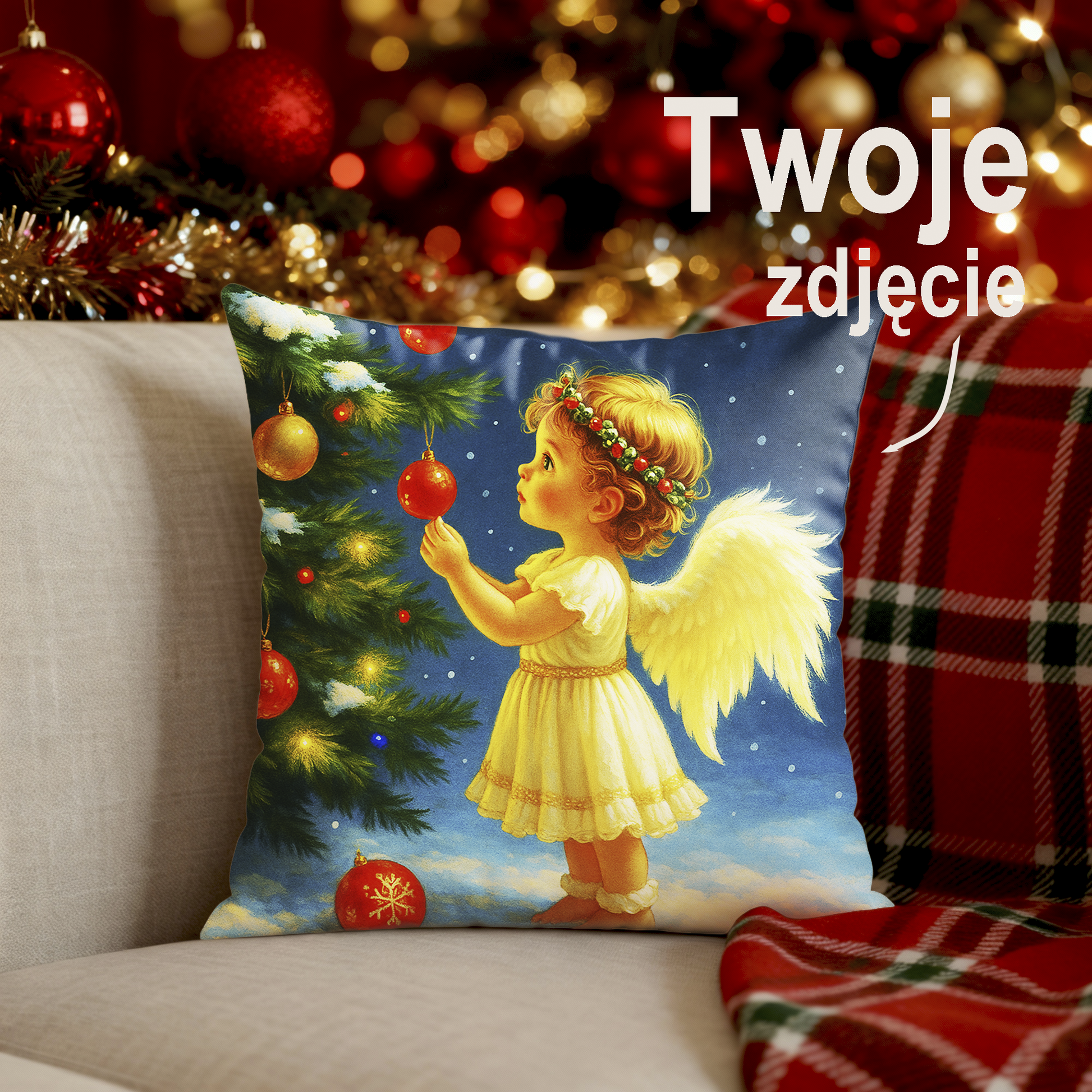 Stwórz wyjątkową, pełną magii pamiątkę świąteczną dzięki personalizowanej poduszce, na której Twoje dziecko zamieni się w uroczego aniołka! ✨👼