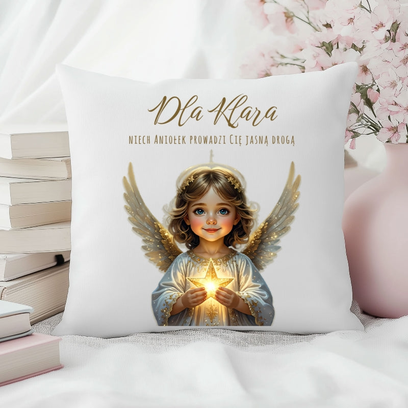 Ta wyjątkowa poduszka przedstawia delikatnego aniołka trzymającego jasną gwiazdę - symbol ochrony, czułości i światła prowadzącego przez każdy dzień. Idealna jako dekoracja do dziecięcego pokoju, jak i pamiątkowy prezent dla bliskiej osoby.